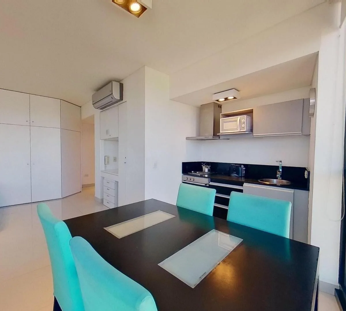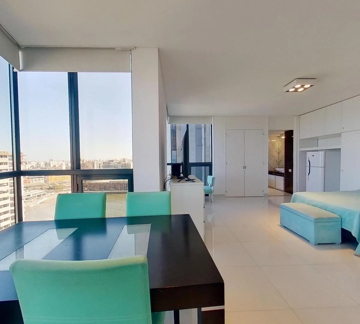 Studio apartment of 46 m² on a high floor in the Art María towers, with panoramic views. Furnished and equipped, with building fees and utilities included. Building amenities mentioned include event halls, a barbecue-equipped terrace, meeting rooms, coworking space, a games room and cinema, a minimarket, two pools (including one on a hanging bridge), and a laundry service, plus a terrace.