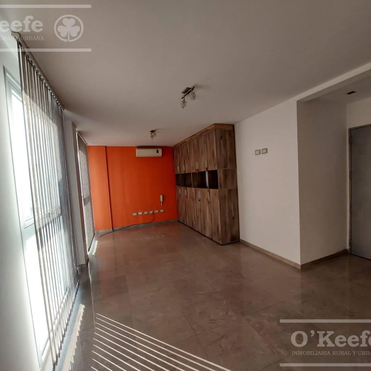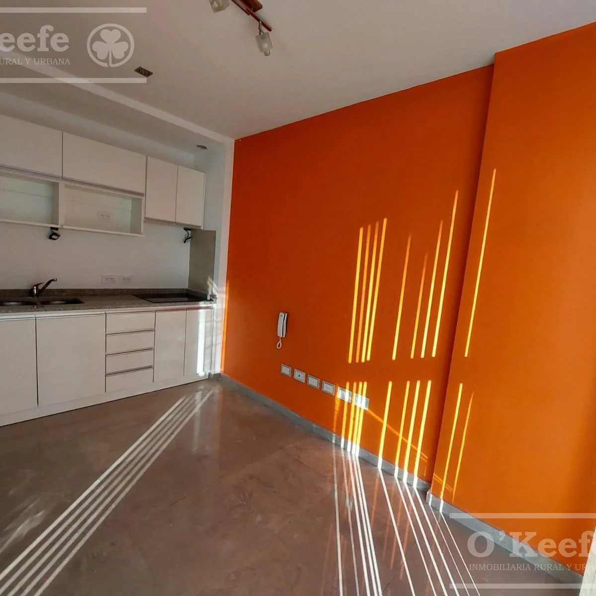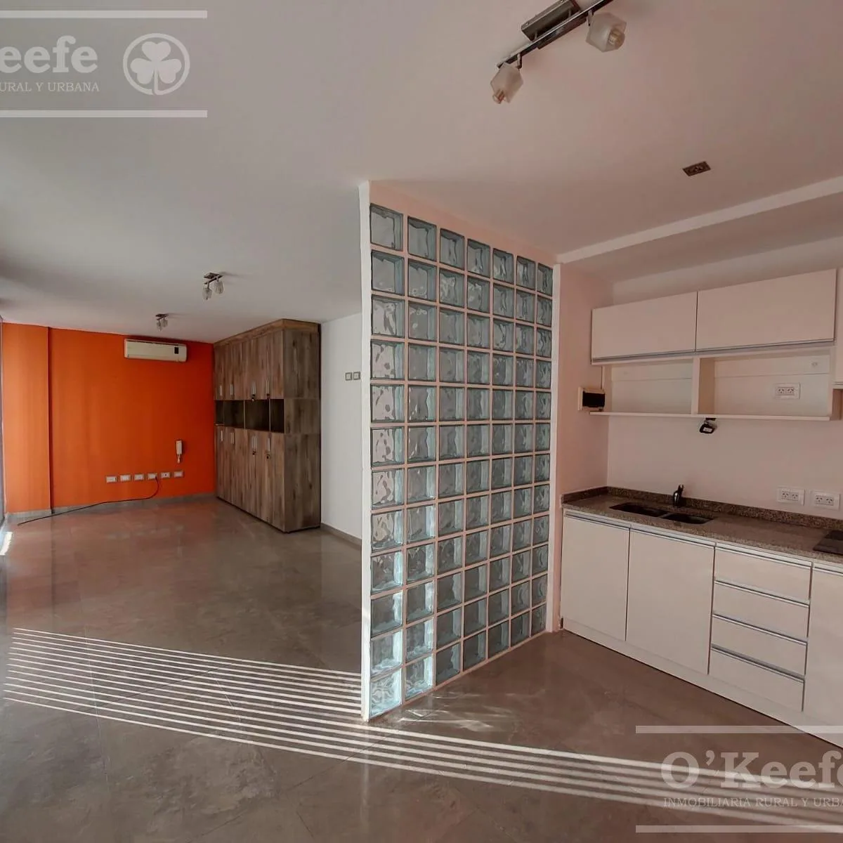 Studio apartment for rent in Quilmes Centro, furnished. Interior space includes built-in storage, a kitchen with base cabinets and wall cabinets, and a full bathroom. The room is separated by a glass-brick wall that lets light through, with air conditioning and a reinforced entry door. The contract is for 24 months with quarterly adjustments based on the IPC index. Requirements include a third-party property guarantee and three payslips, plus an all-risks fire insurance policy covering the rente