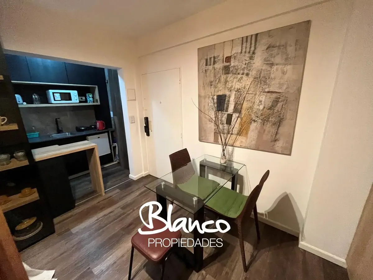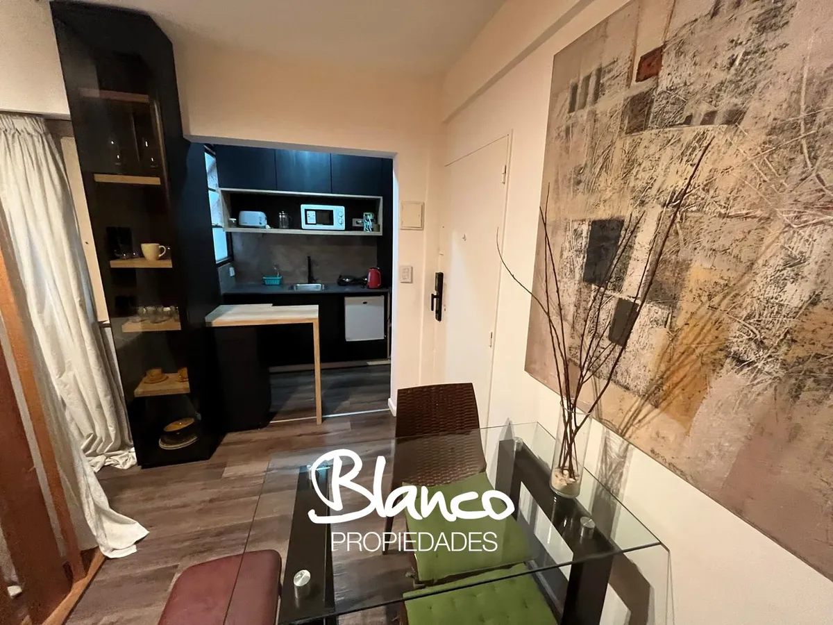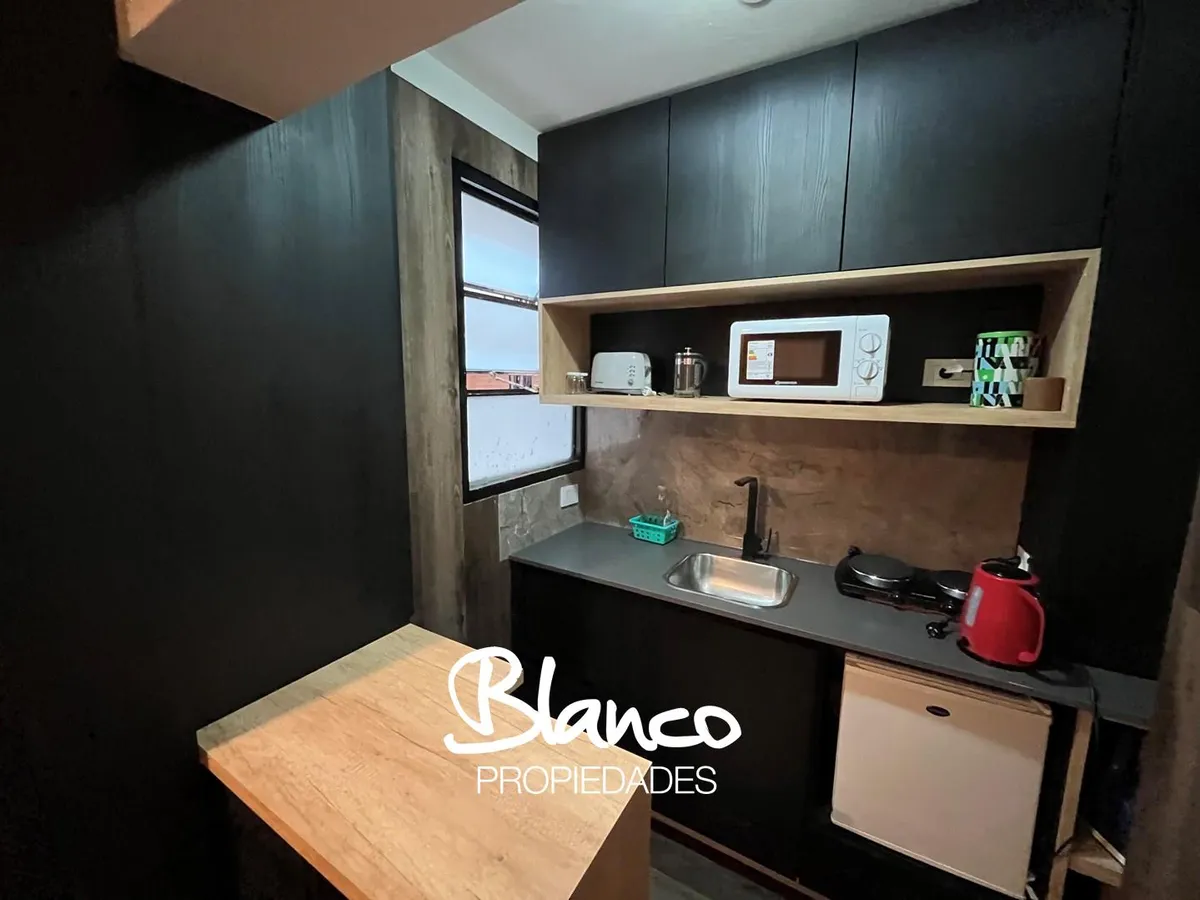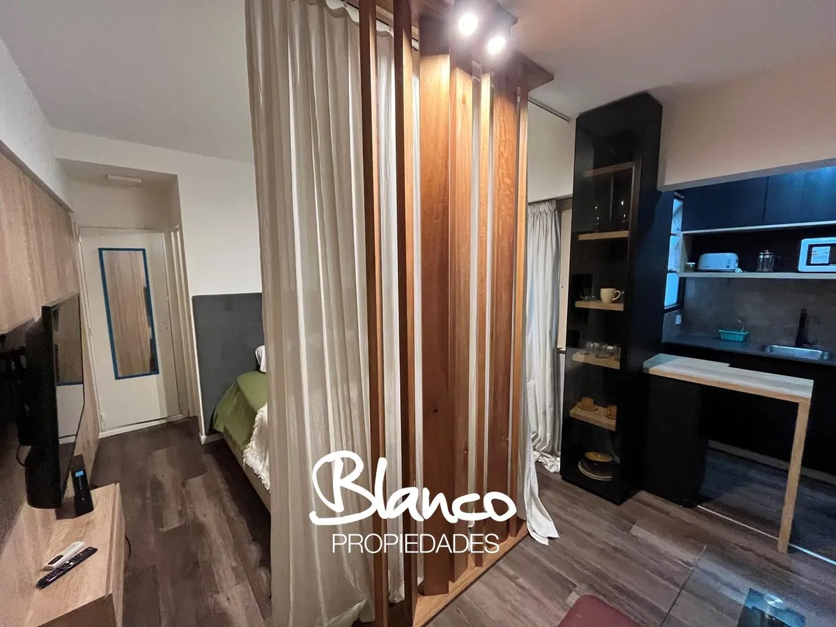 Furnished and equipped studio apartment in Recoleta. The kitchen has a dining area and a small living space, separated from the sleeping area by a wooden structure with a curtain. A built-in wardrobe is in the sleeping area, with bathroom access at the end of the space. The rental is for periods longer than 3 months.