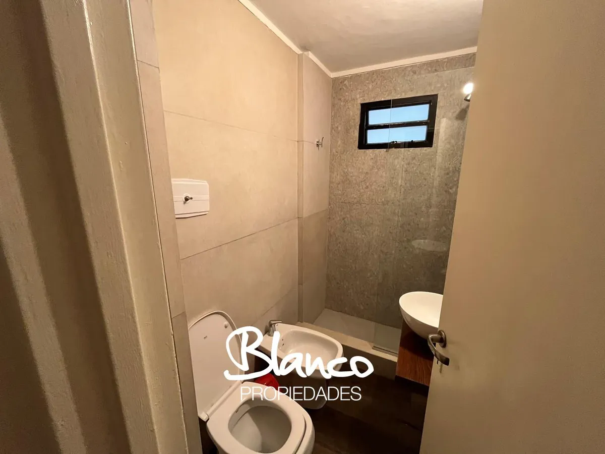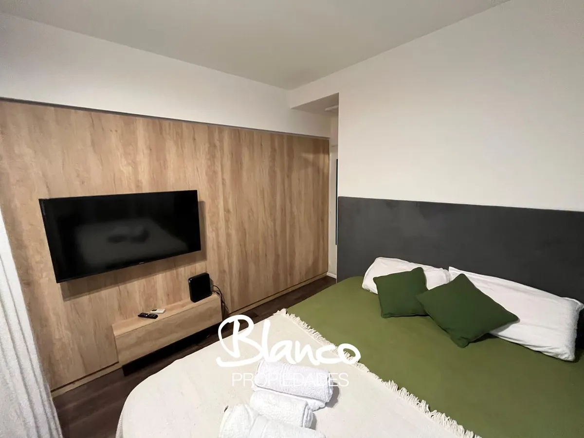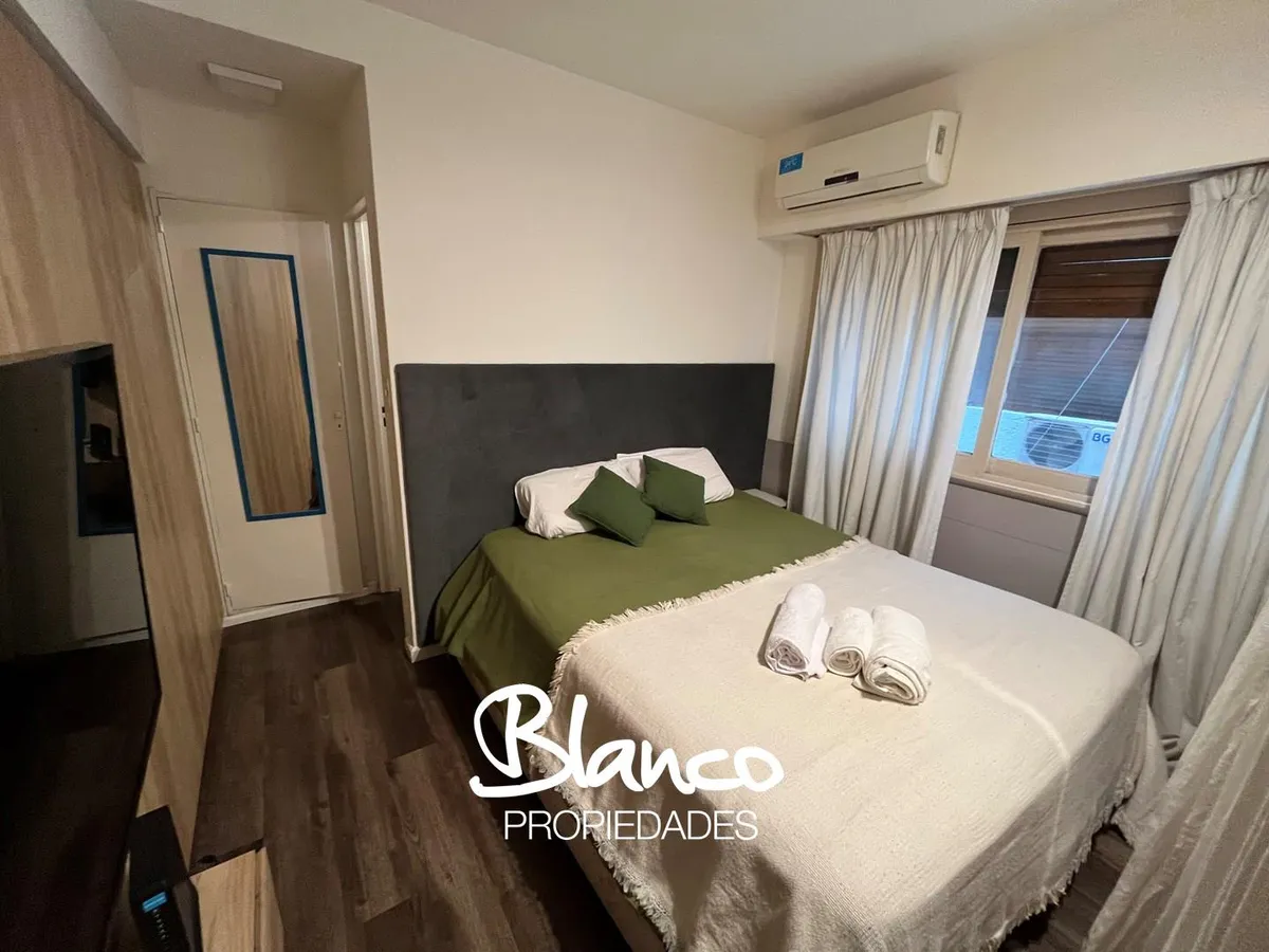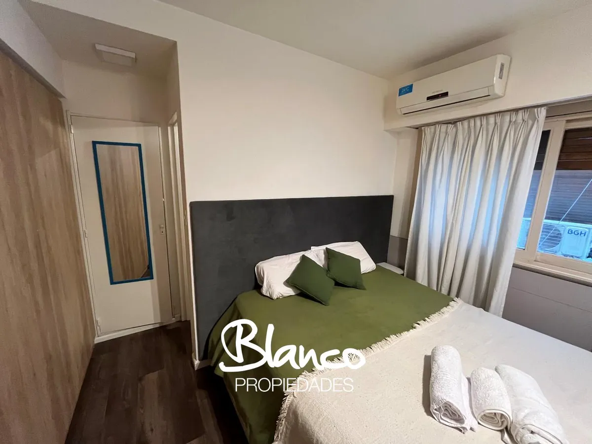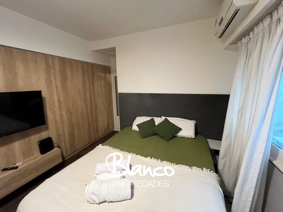 Furnished and equipped studio apartment in Recoleta. The kitchen has a dining area and a small living space, separated from the sleeping area by a wooden structure with a curtain. A built-in wardrobe is in the sleeping area, with bathroom access at the end of the space. The rental is for periods longer than 3 months.