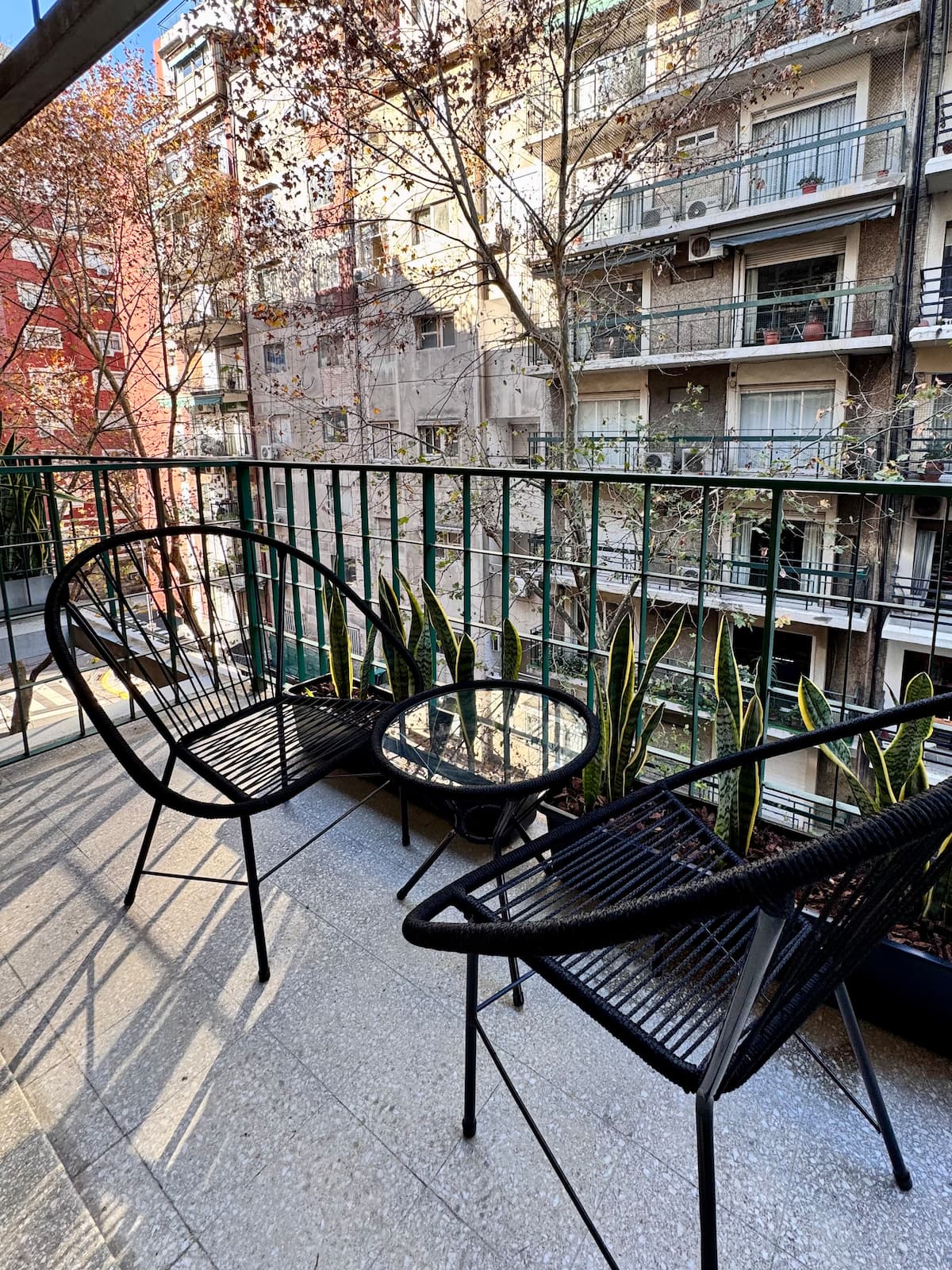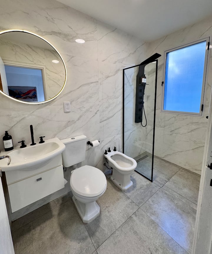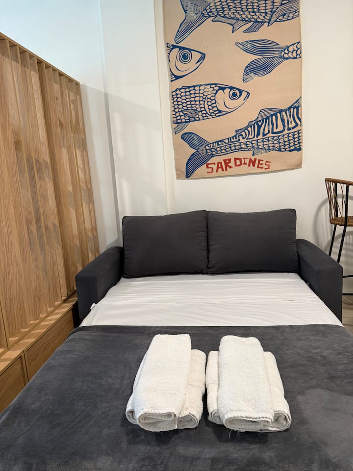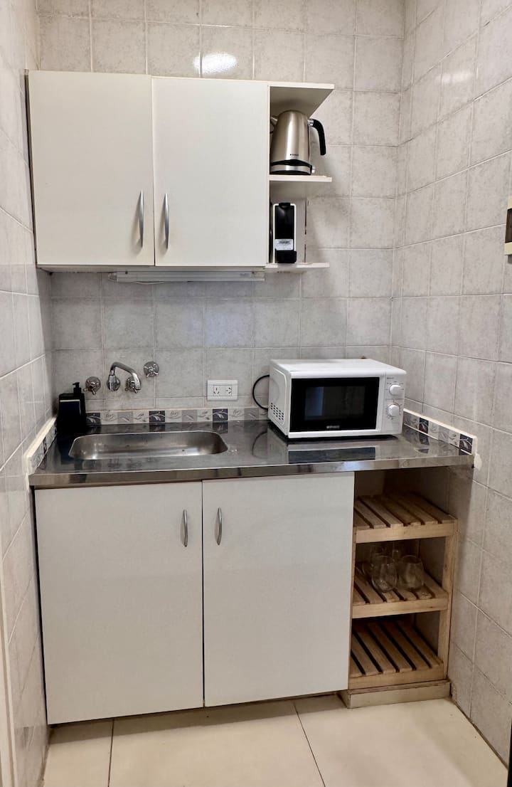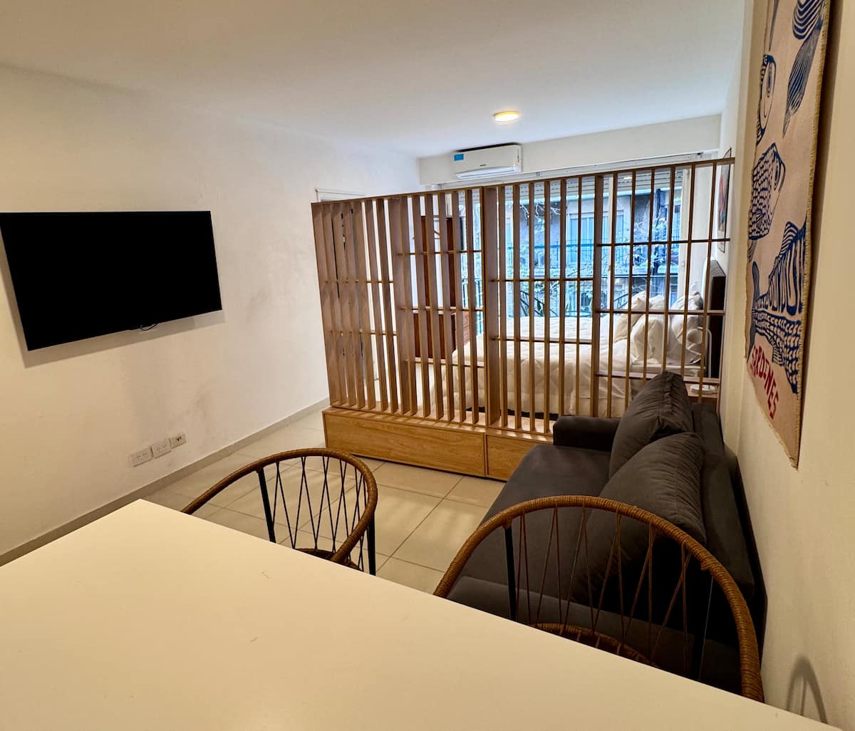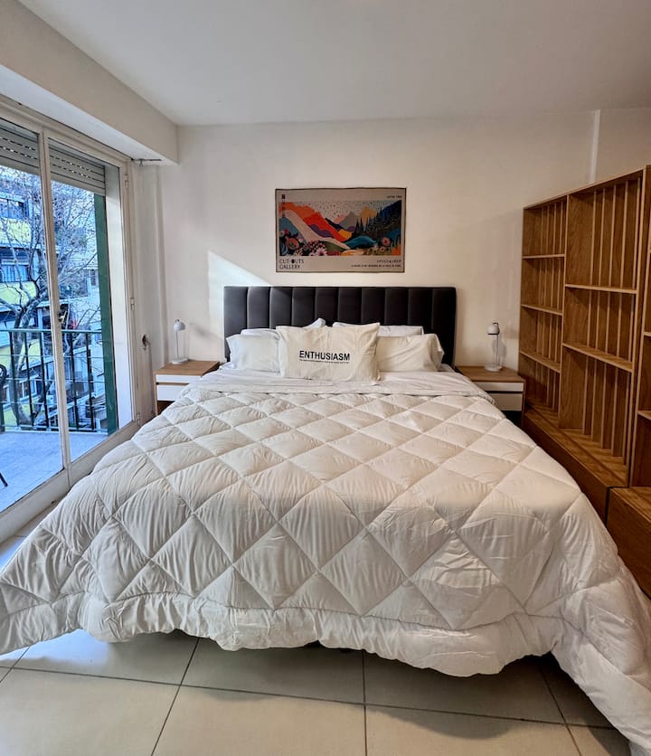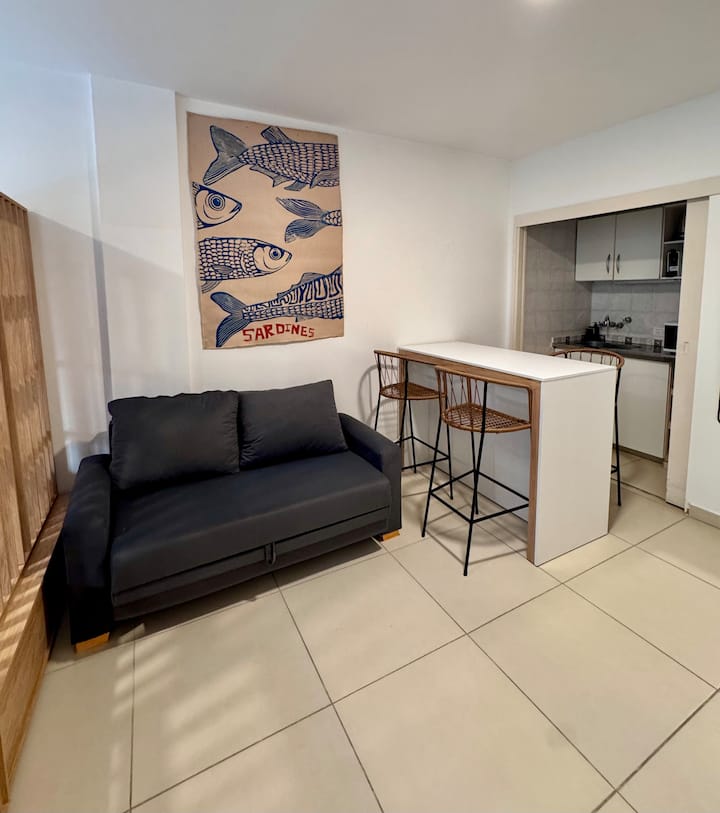Recycled studio apartment in Recoleta. The unit has a king bed, sofa bed, an equipped kitchen, WiFi, air conditioning and a Scottish shower, for up to 3 people. There is a street-facing balcony with a table and chairs. Self check-in is available, and a photo of the document is requested.