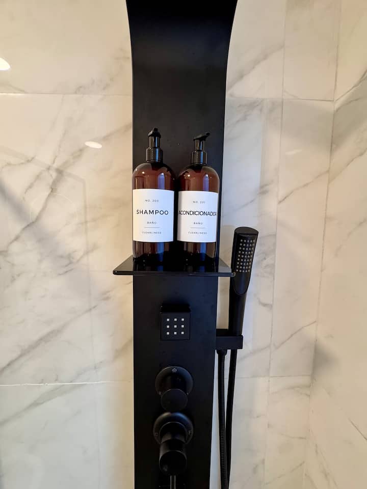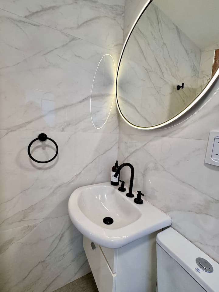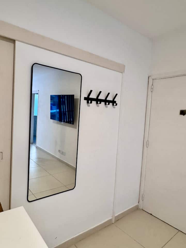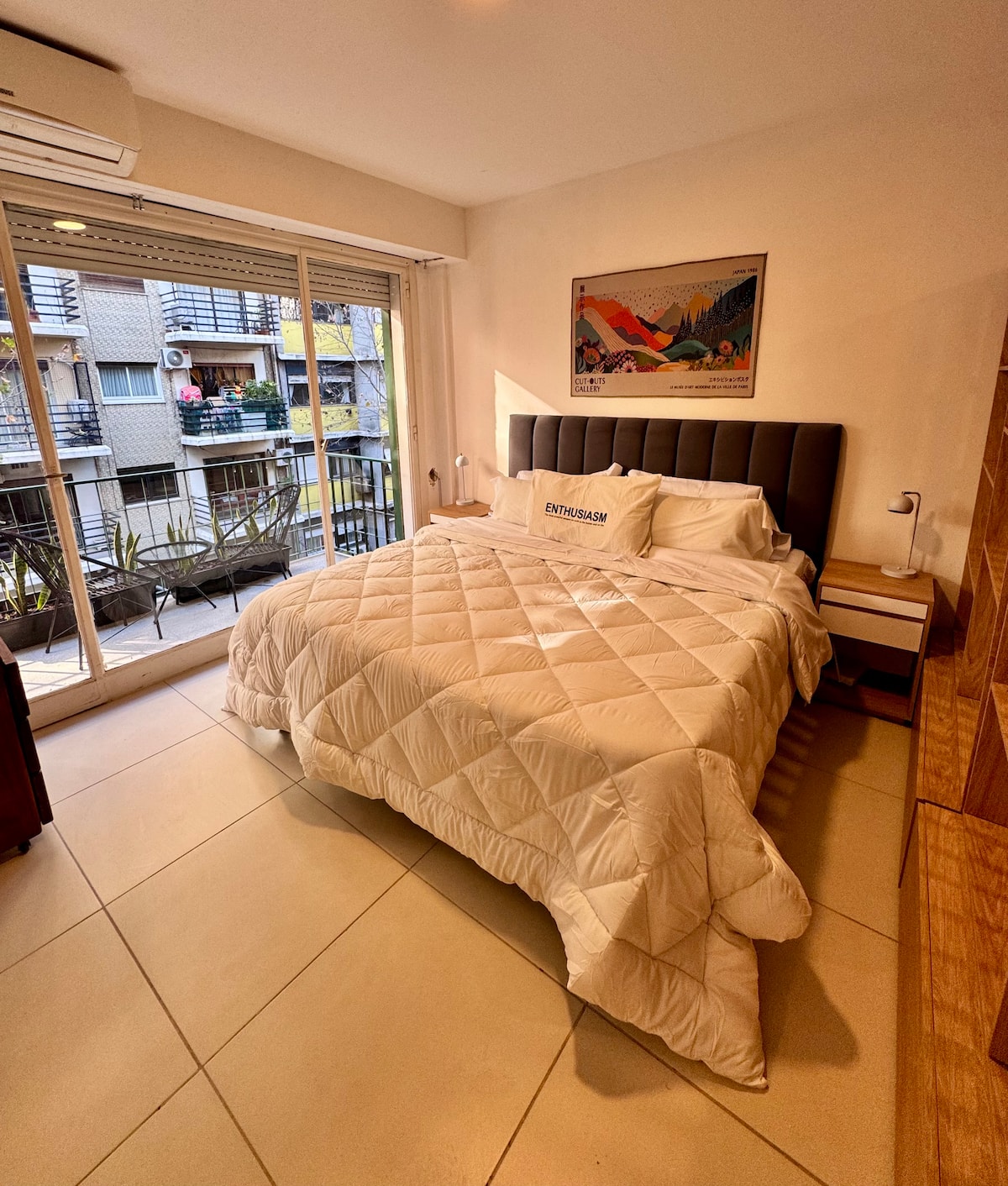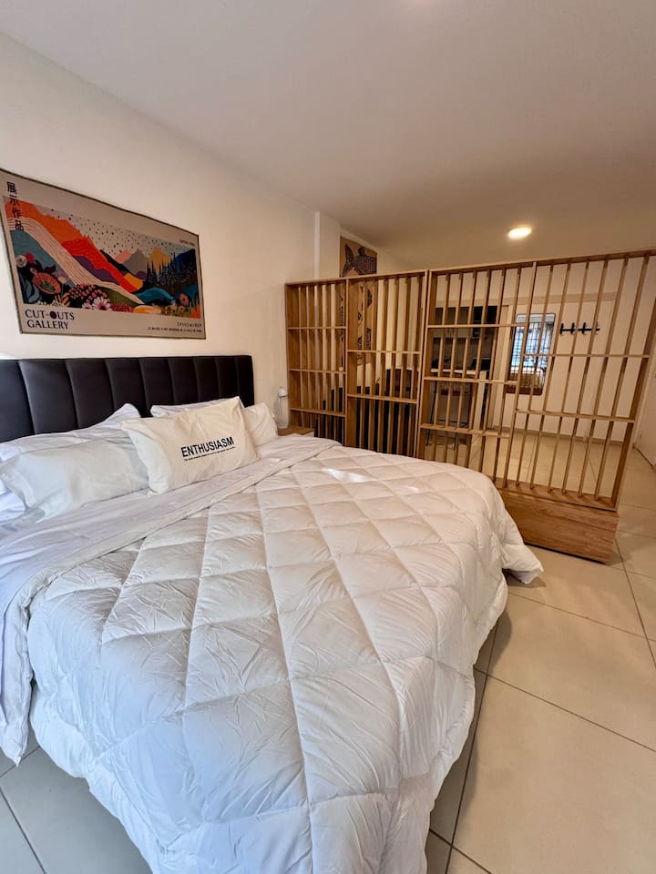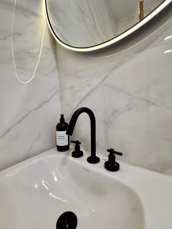 Recycled studio apartment in Recoleta. The unit has a king bed, sofa bed, an equipped kitchen, WiFi, air conditioning and a Scottish shower, for up to 3 people. There is a street-facing balcony with a table and chairs. Self check-in is available, and a photo of the document is requested.