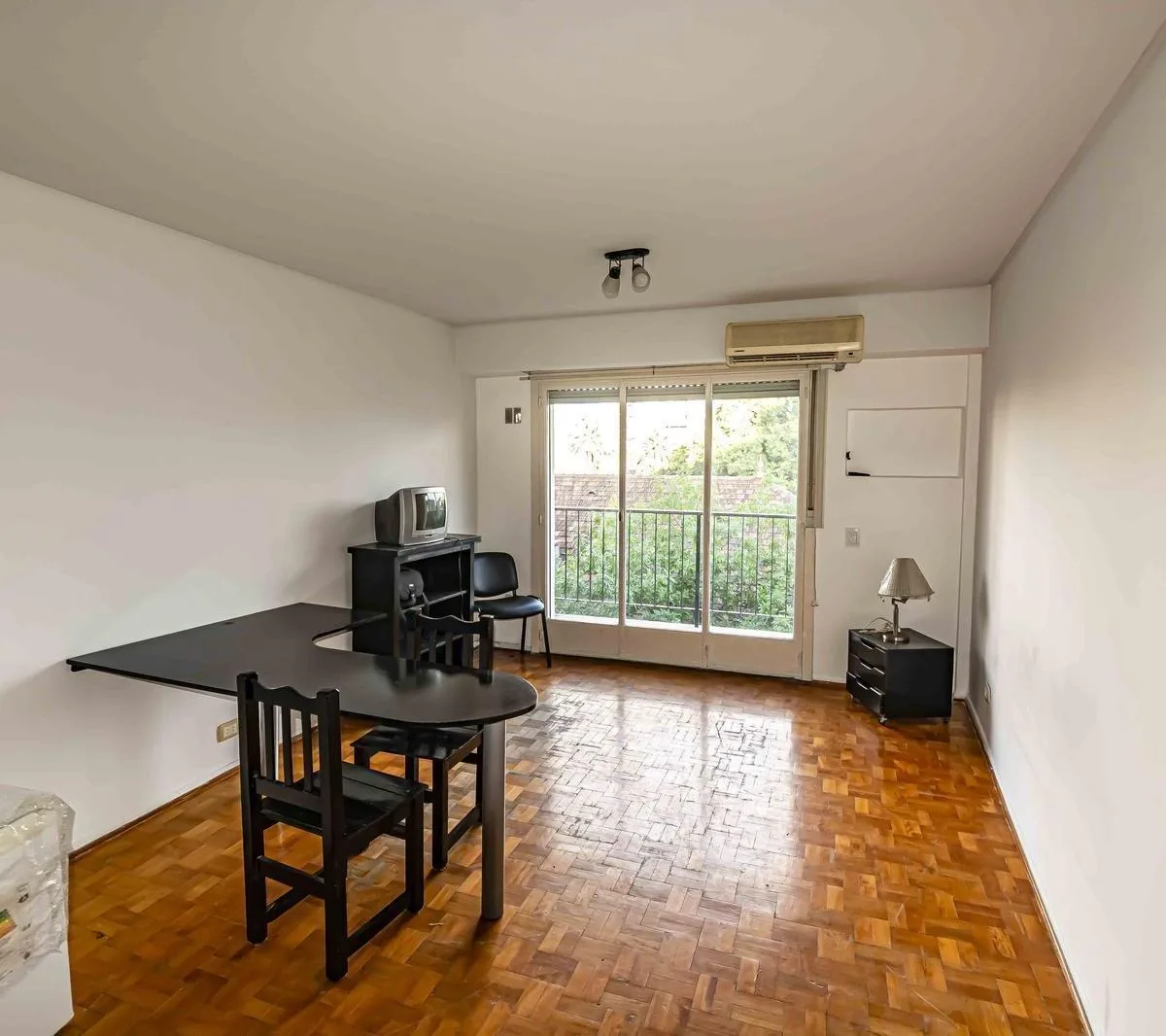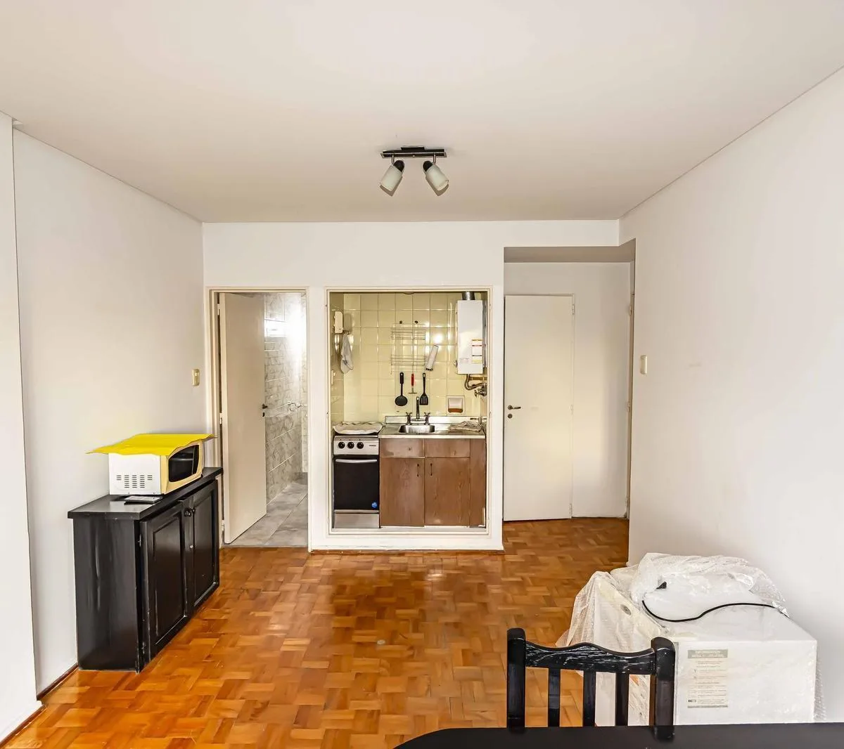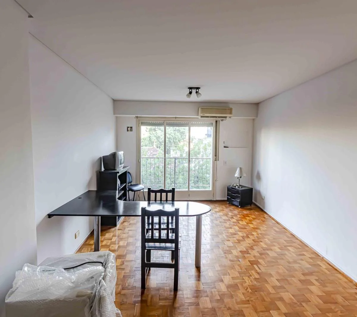 One-room apartment with some furniture, street-facing with a balcony. Integrated kitchen, dressing area (vestidor) and a full bathroom. Building fees and ABL are listed based on the most recent information and should be confirmed; all measurements are approximate and must be verified in the relevant documentation.