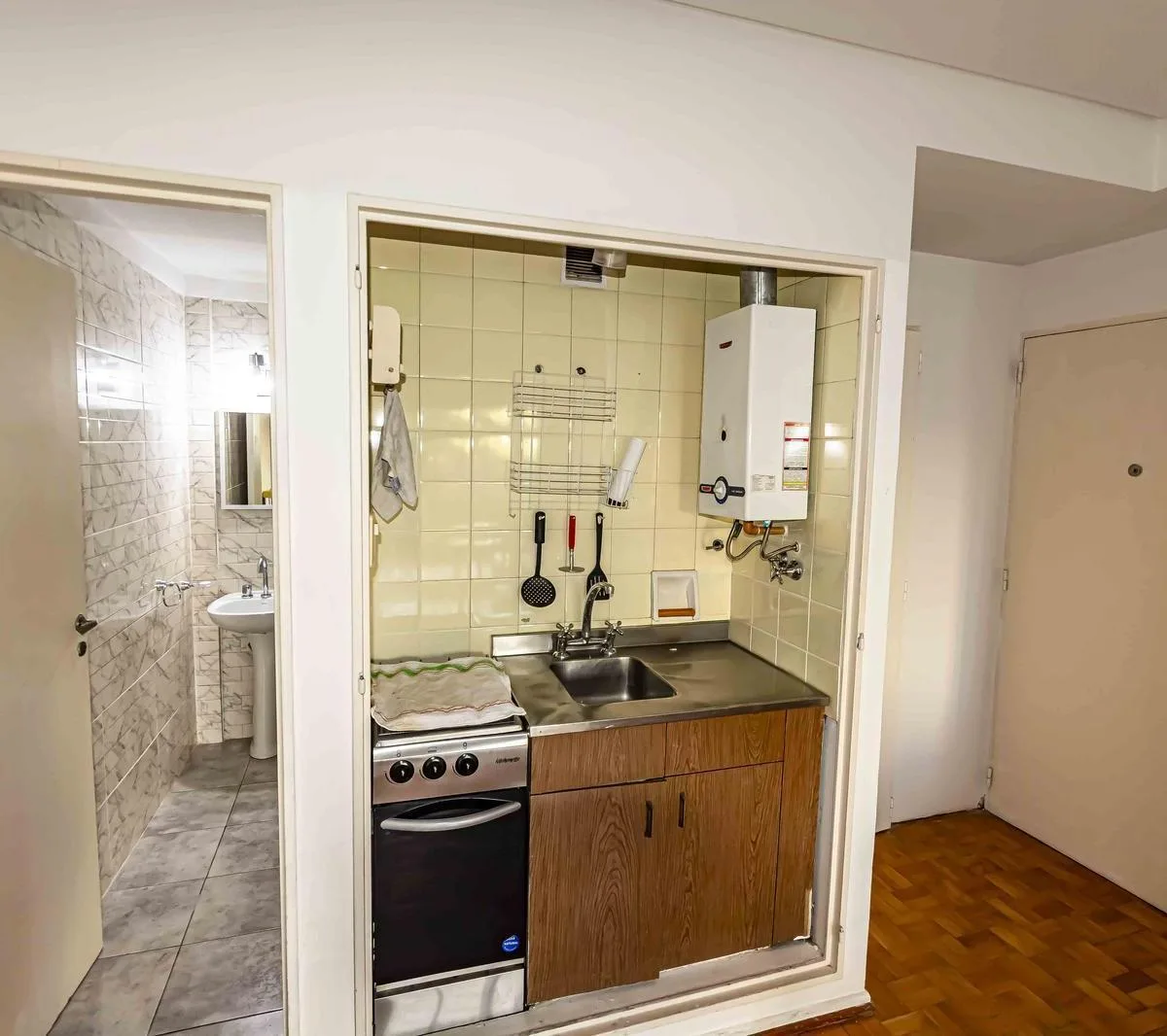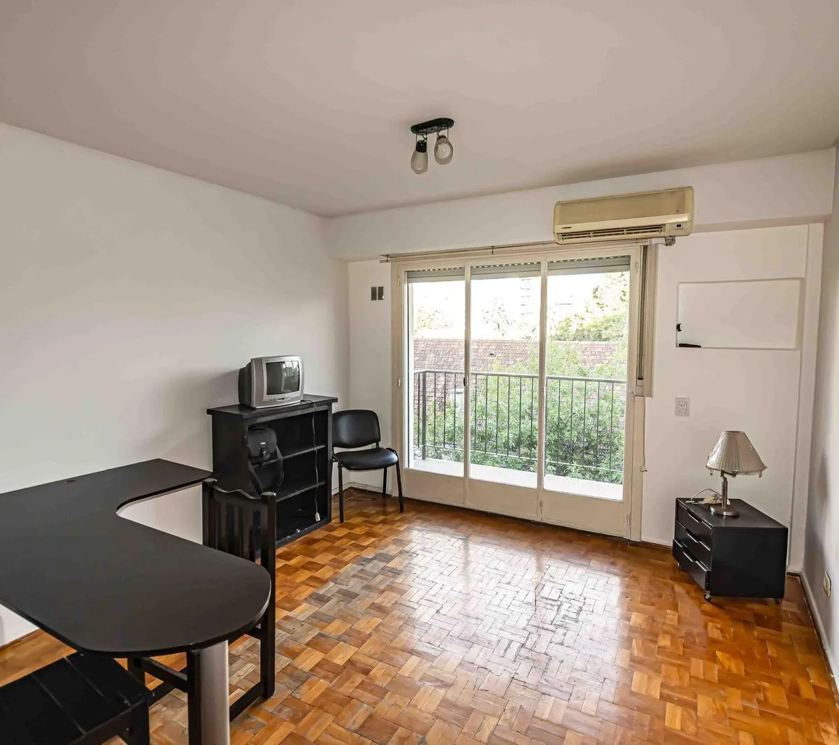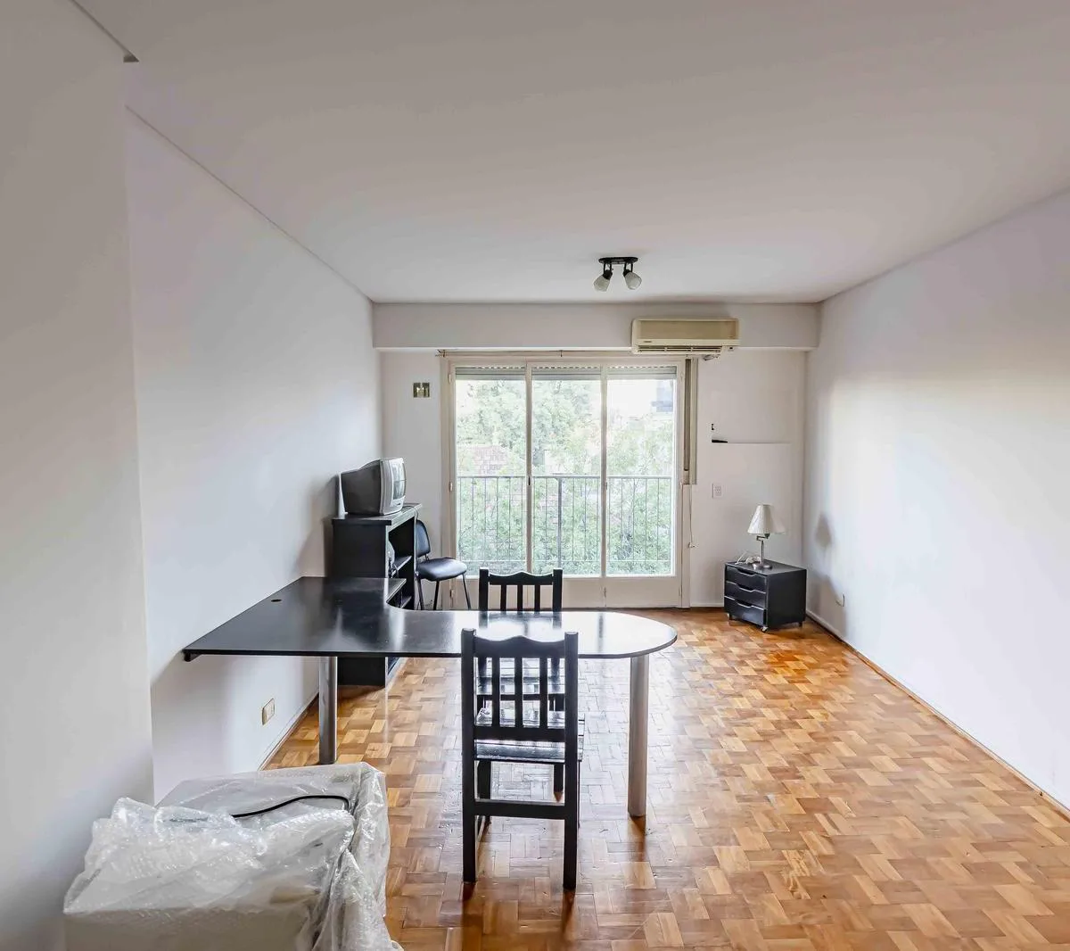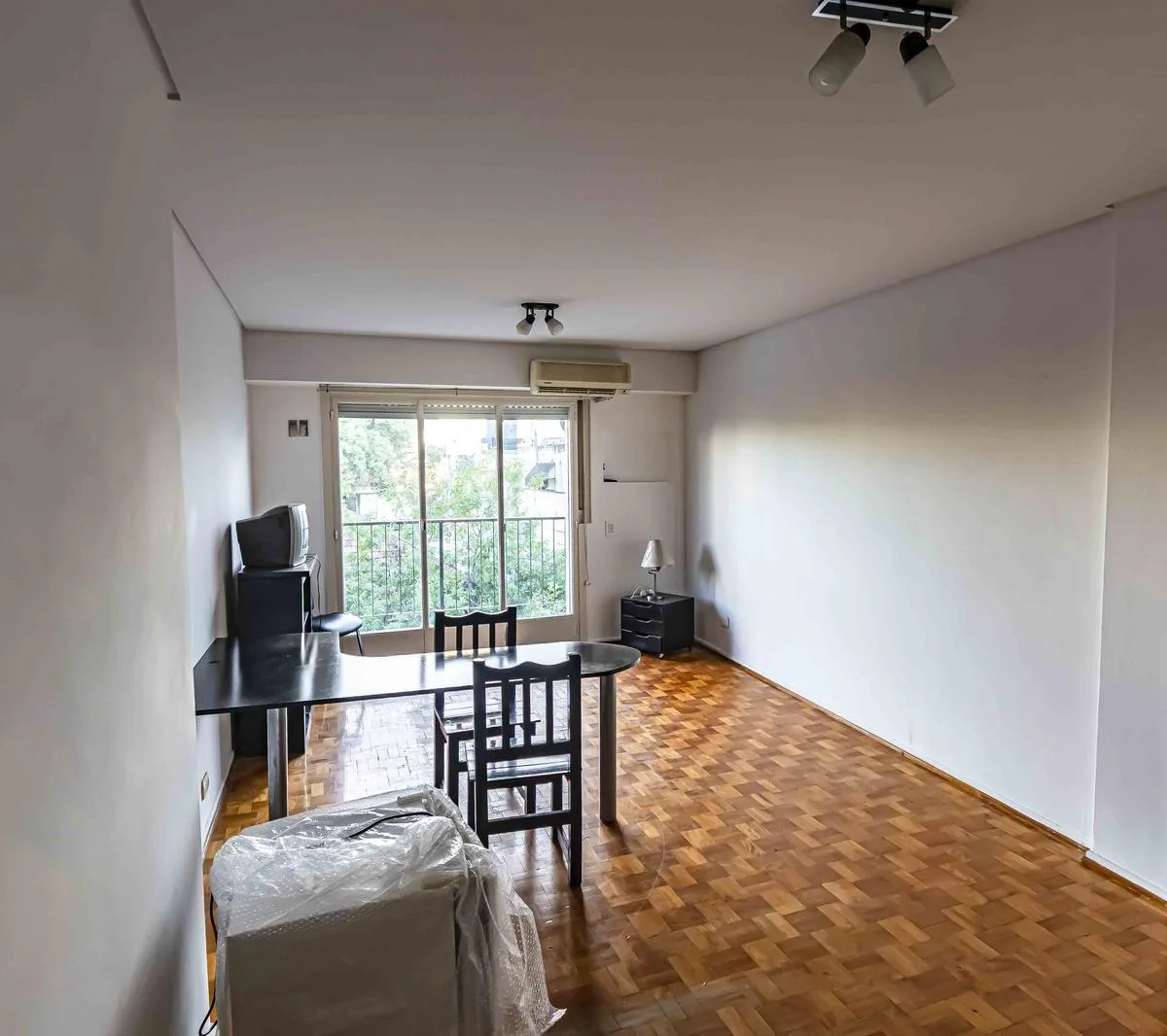 One-room apartment with some furniture, street-facing with a balcony. Integrated kitchen, dressing area (vestidor) and a full bathroom. Building fees and ABL are listed based on the most recent information and should be confirmed; all measurements are approximate and must be verified in the relevant documentation.
