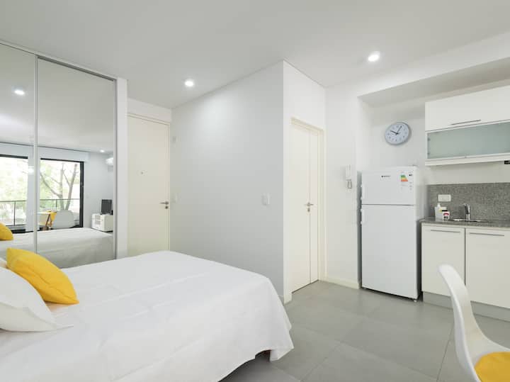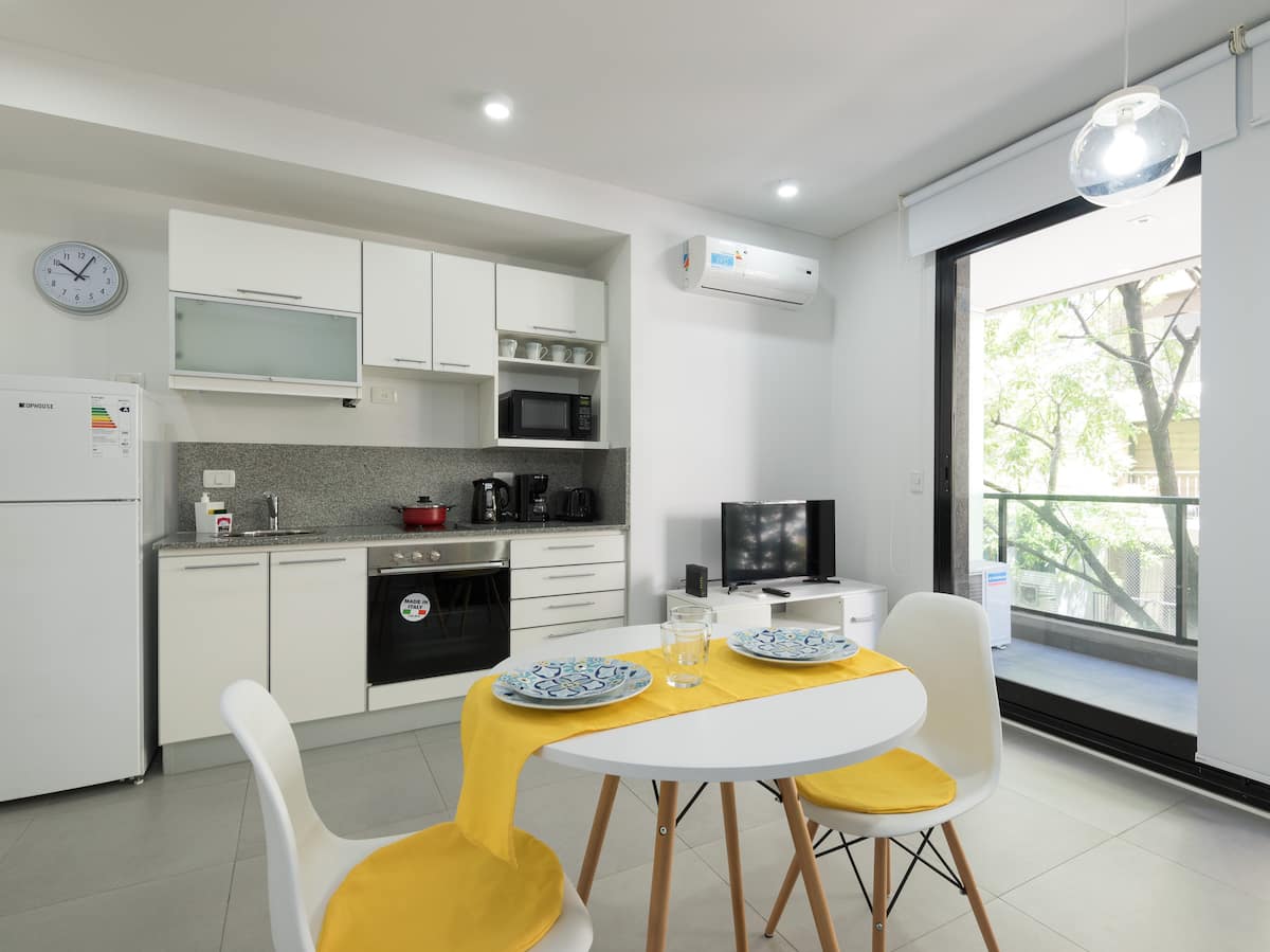 Furnished studio apartment for temporary rental in Recoleta, Buenos Aires. It has a double bed, a fully equipped kitchen, a full bathroom with bathtub and a balcony overlooking the street. HD LCD TV and Wi-Fi are included, along with weekly cleaning.