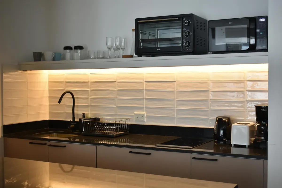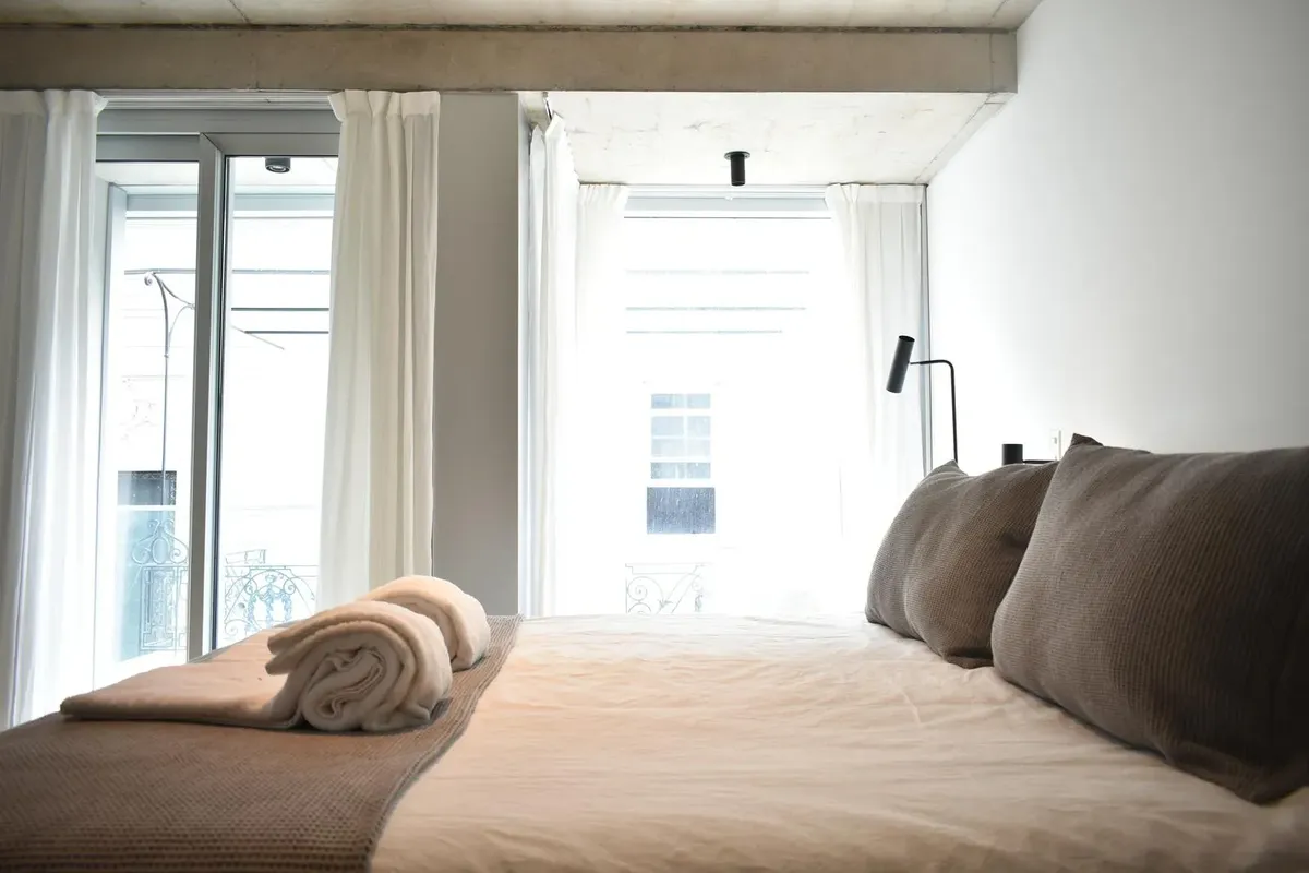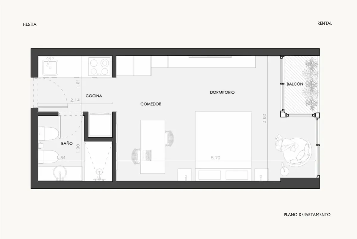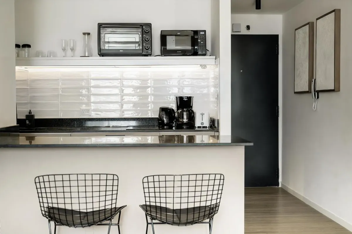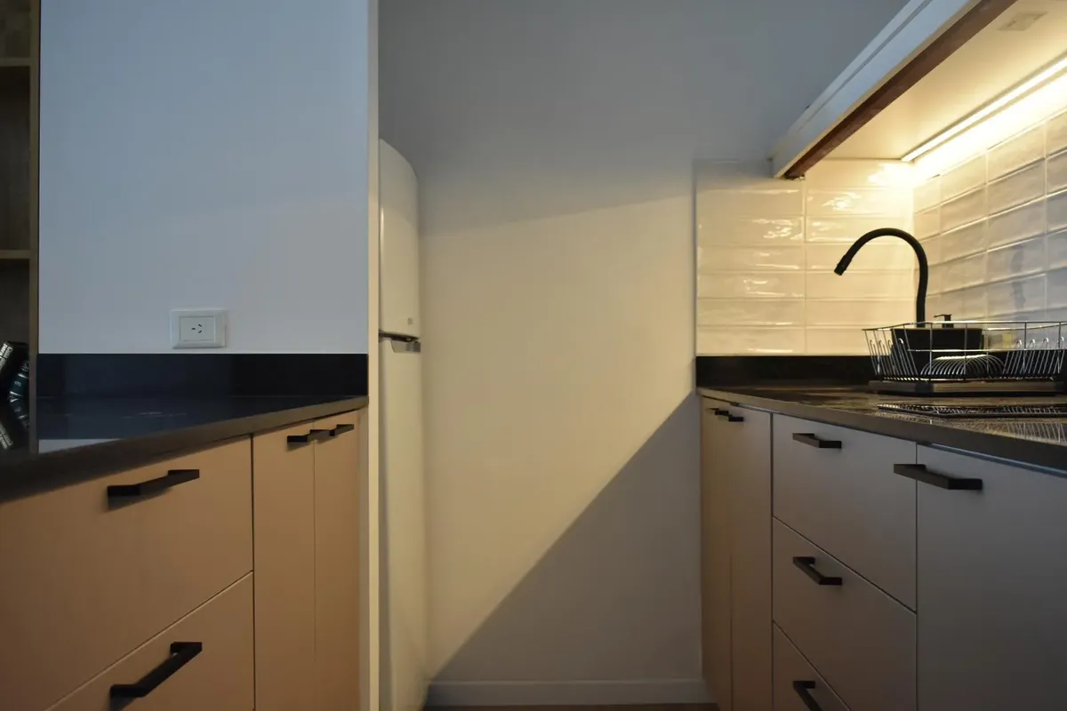 Studio apartment for short-term rent in Recoleta. The unit includes a fully equipped kitchen, a recently renovated bathroom with a walk-in shower, and TV with streaming services plus high-speed WiFi. It has a spacious balcony with an open, green view. The rent includes electricity, water, ABL and WiFi; building fees are not included.