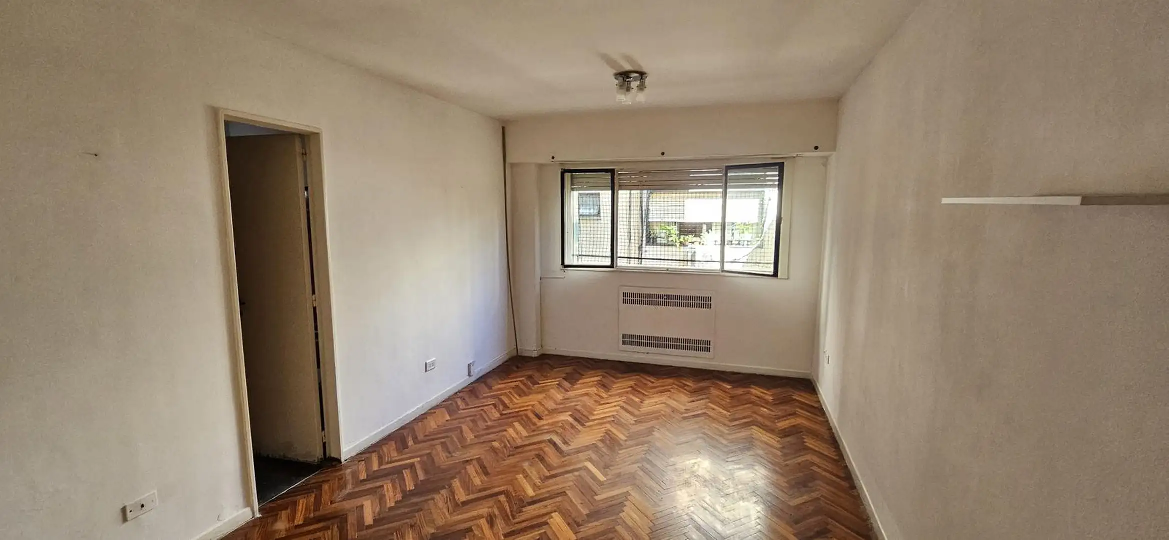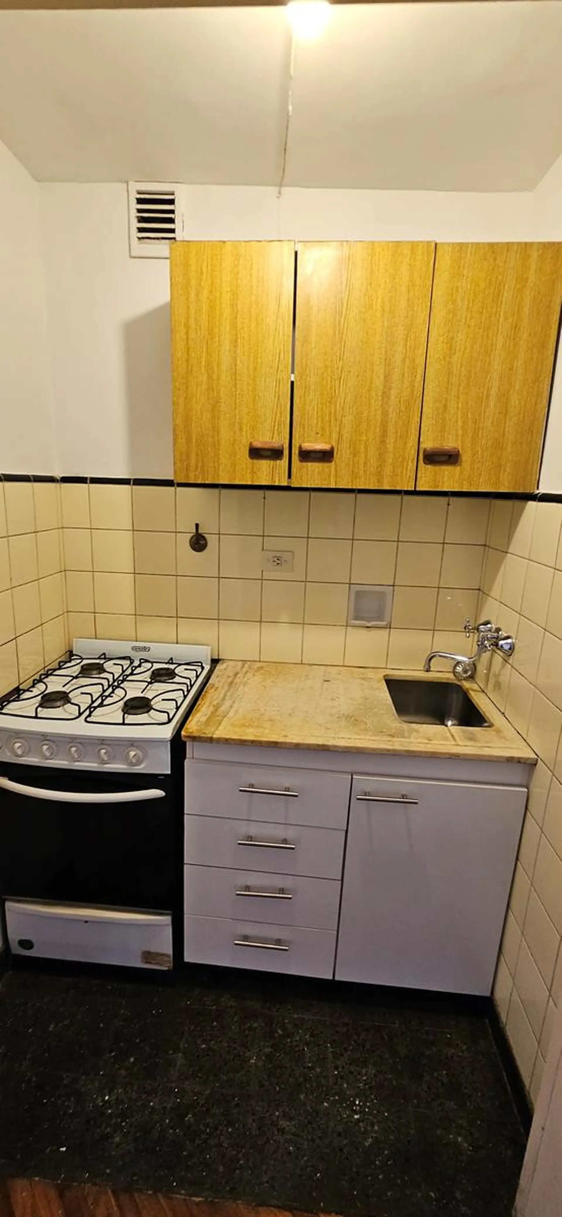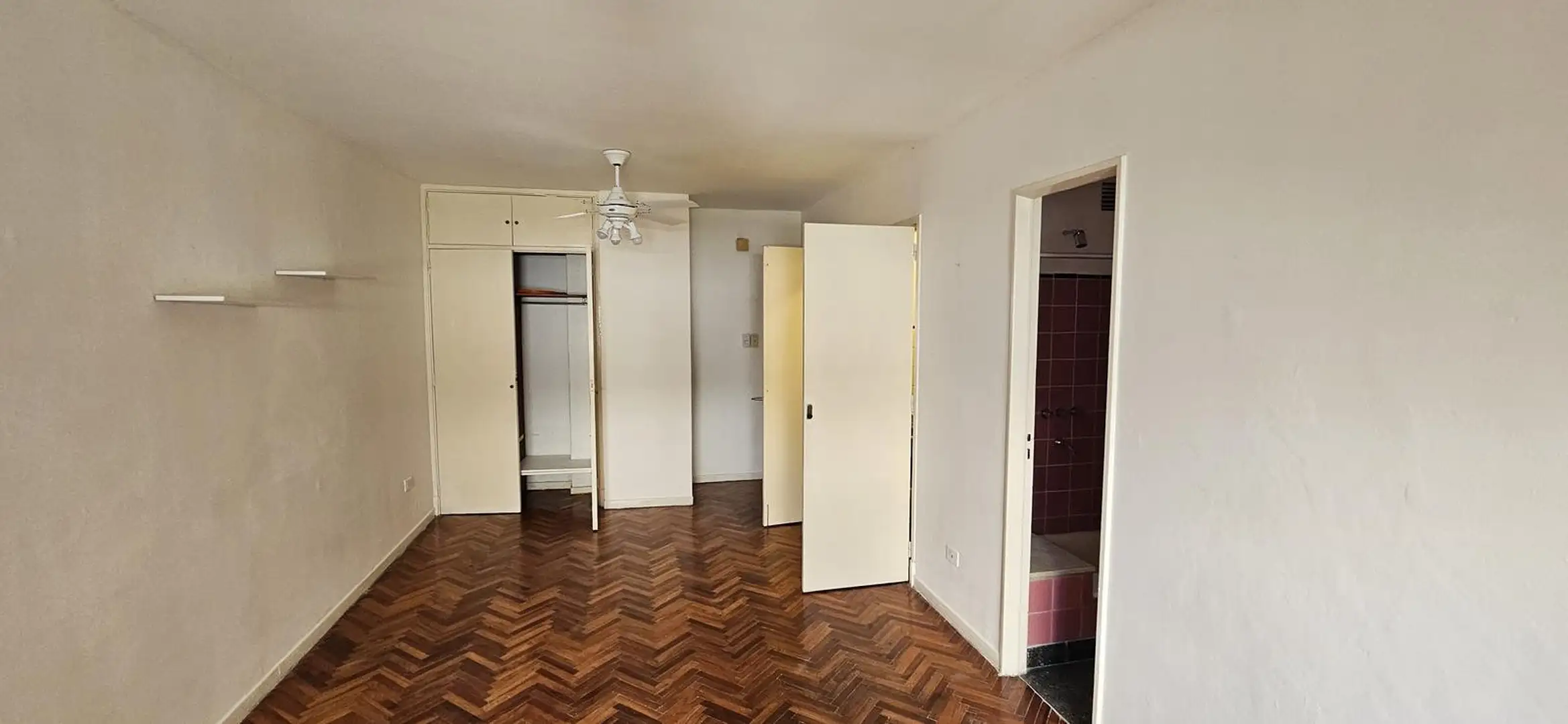 One-room apartment in Recoleta, on Riobamba between Paraguay and Marcelo T. de Alvear, on the 6th floor. The building is about 55 years old and has four units per floor, with a caretaker. The apartment has 27 m² covered, a main room with a wide window and parquet floors, a floor-to-ceiling built-in closet, a compact kitchen with renovated lower cabinets in white and upper wooden units, and a bathroom with a shower with retro-style pink tiles.