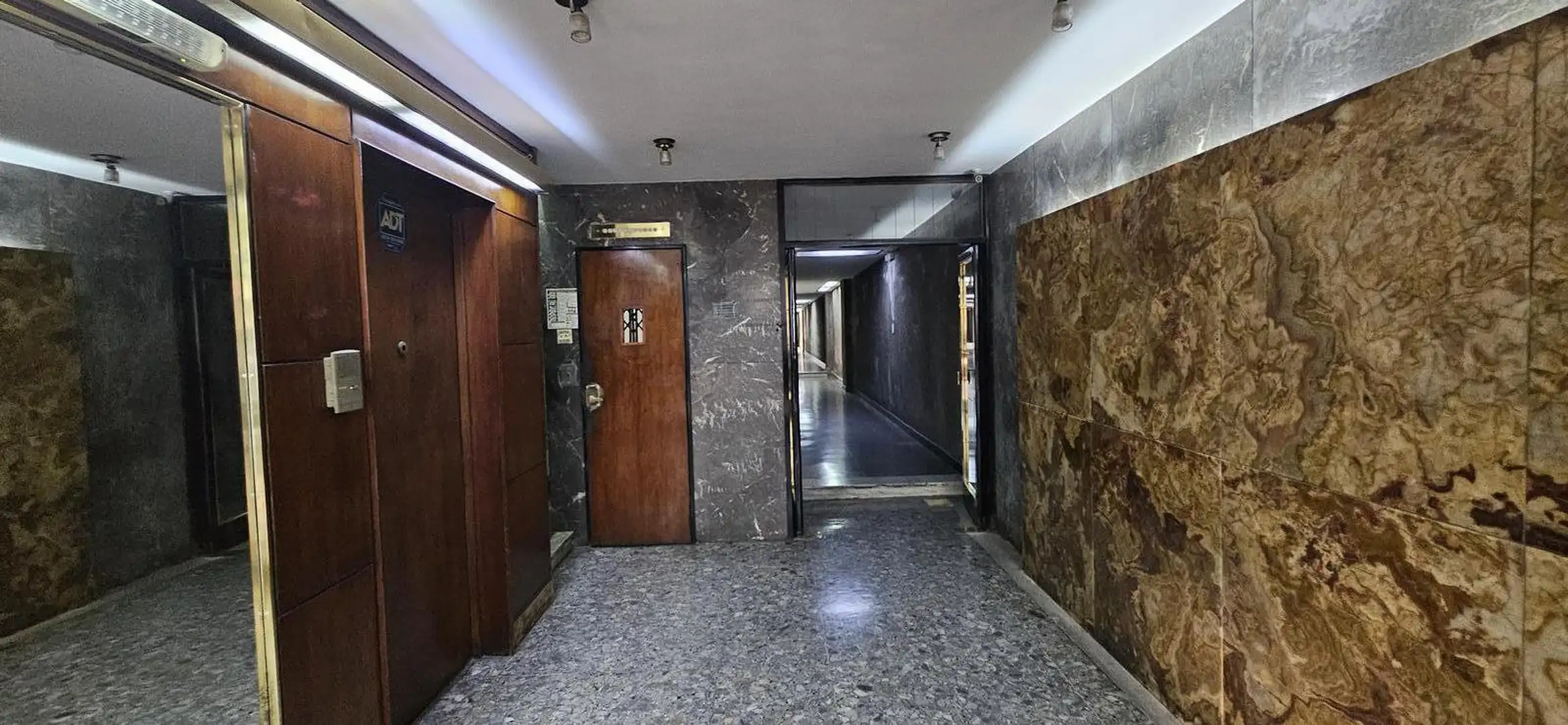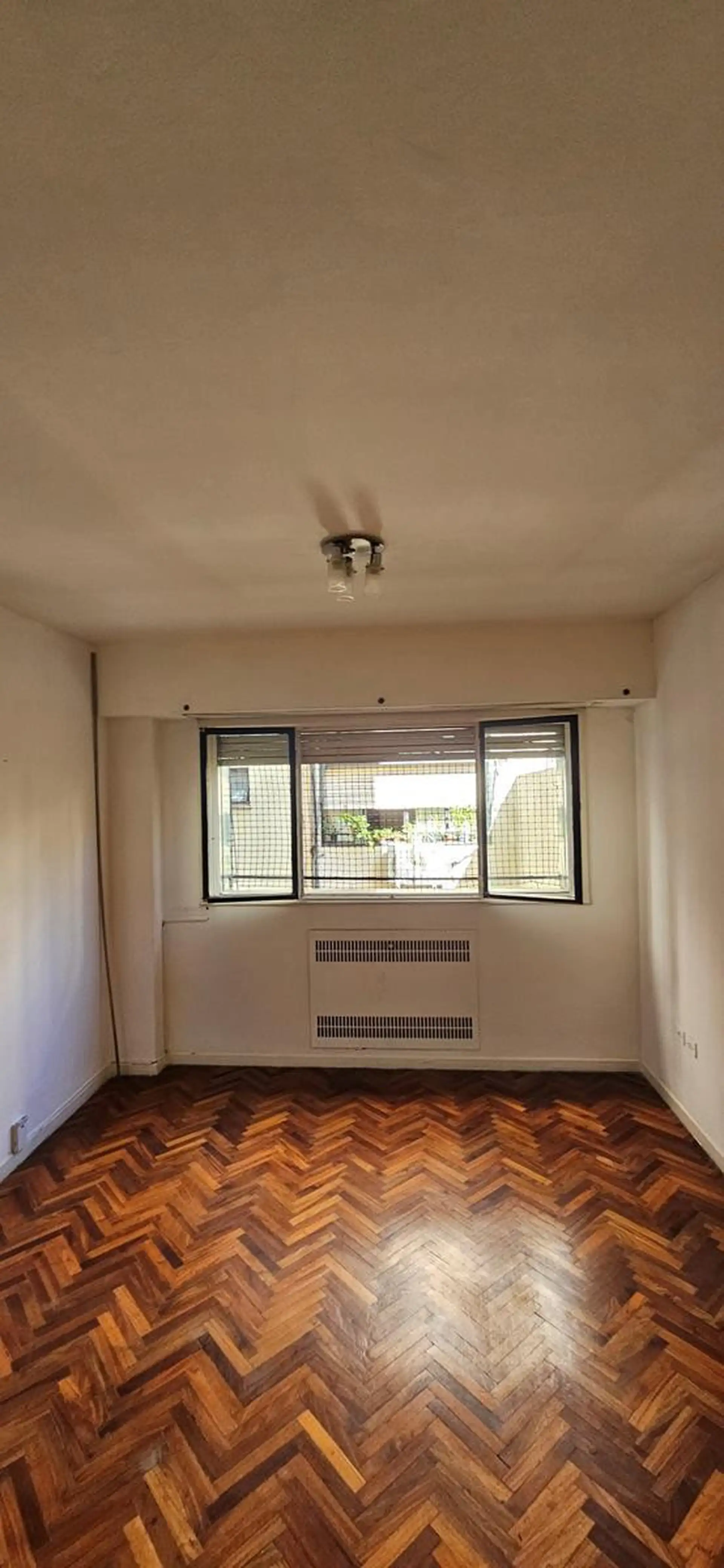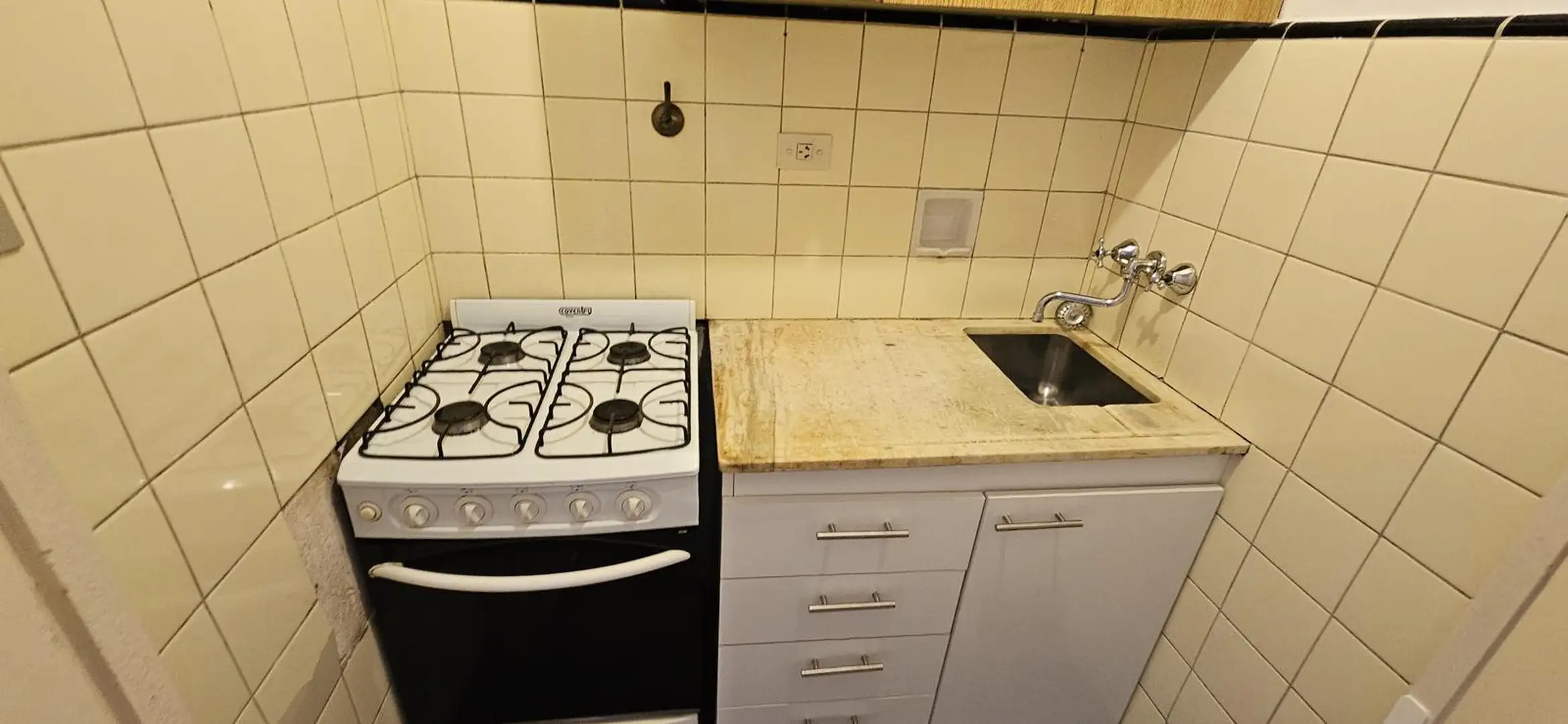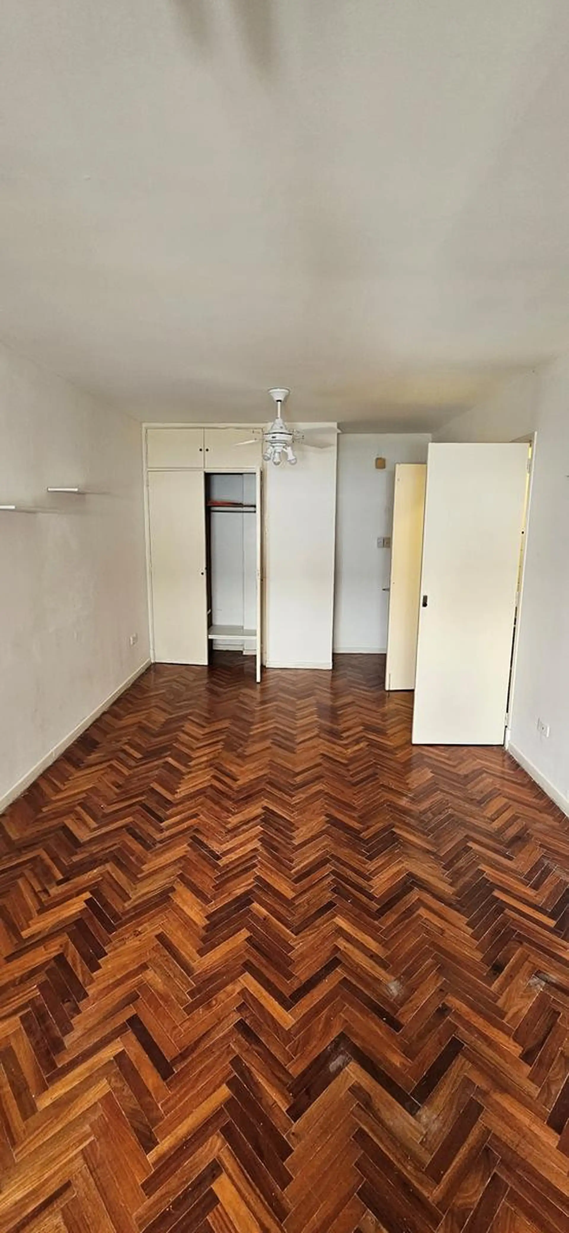 One-room apartment in Recoleta, on Riobamba between Paraguay and Marcelo T. de Alvear, on the 6th floor. The building is about 55 years old and has four units per floor, with a caretaker. The apartment has 27 m² covered, a main room with a wide window and parquet floors, a floor-to-ceiling built-in closet, a compact kitchen with renovated lower cabinets in white and upper wooden units, and a bathroom with a shower with retro-style pink tiles.
