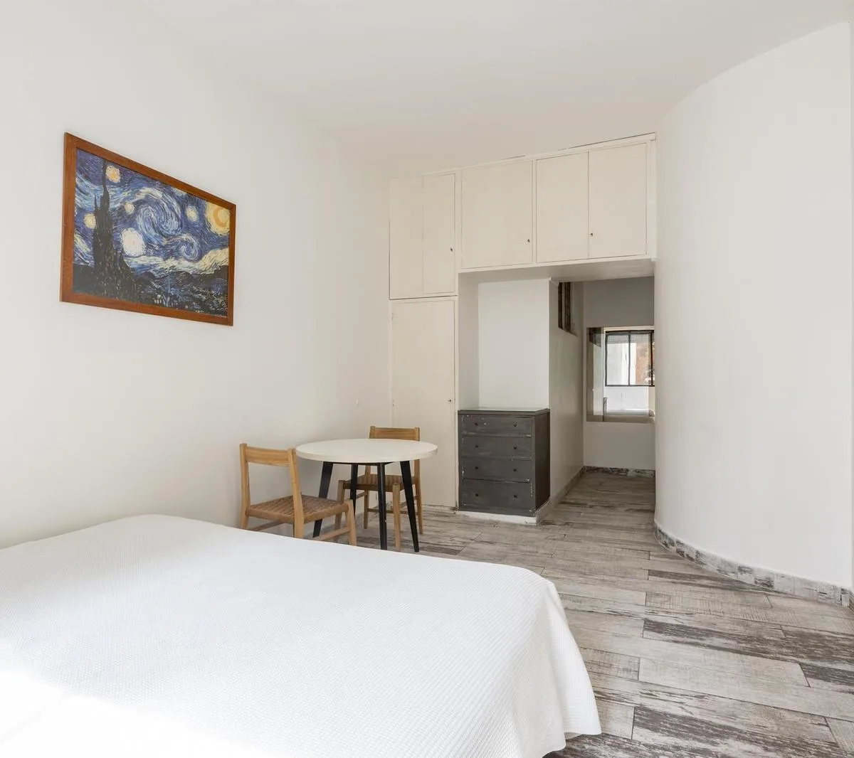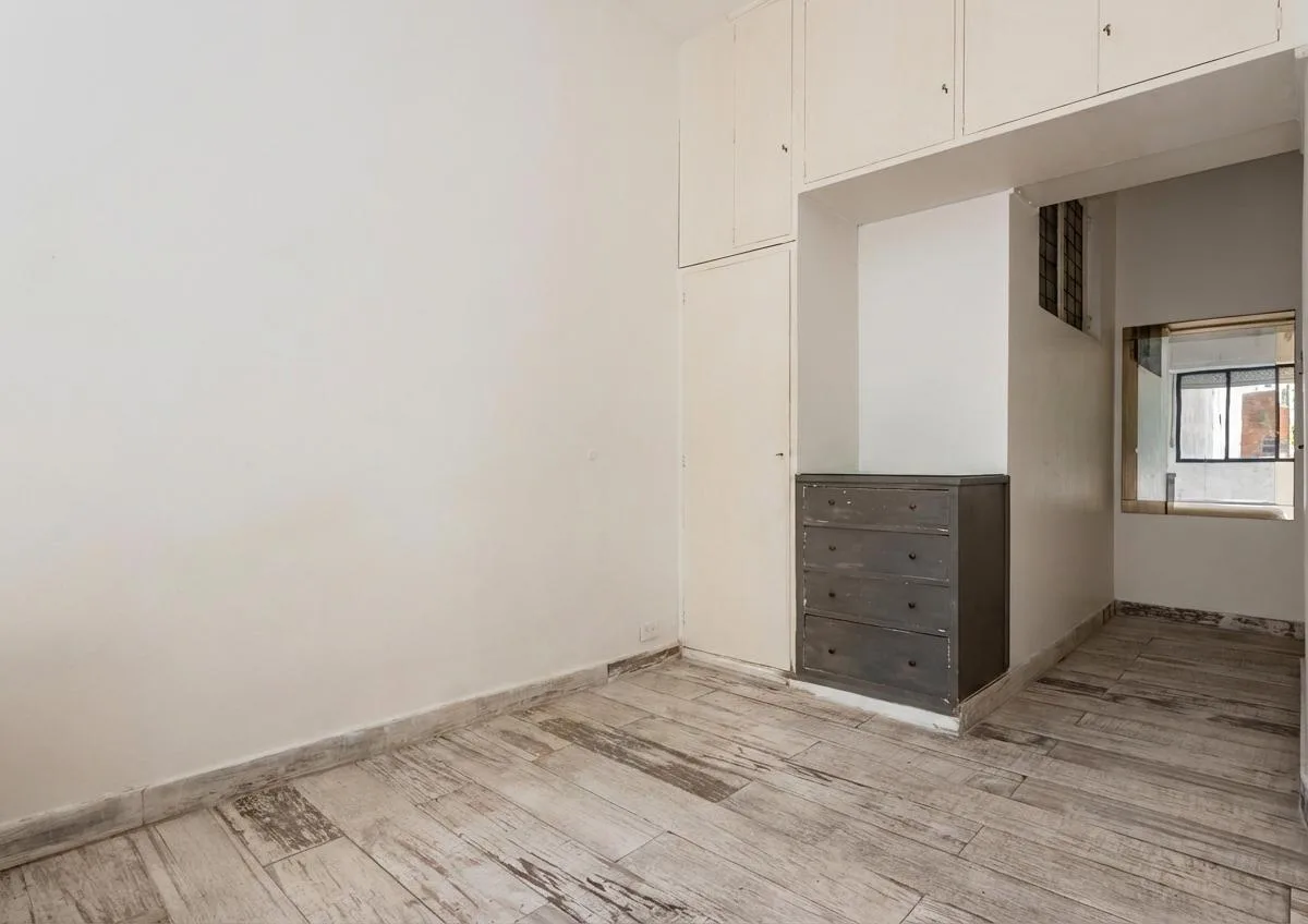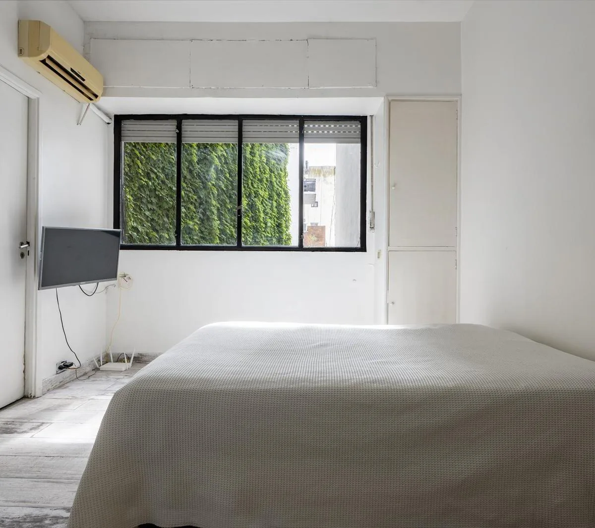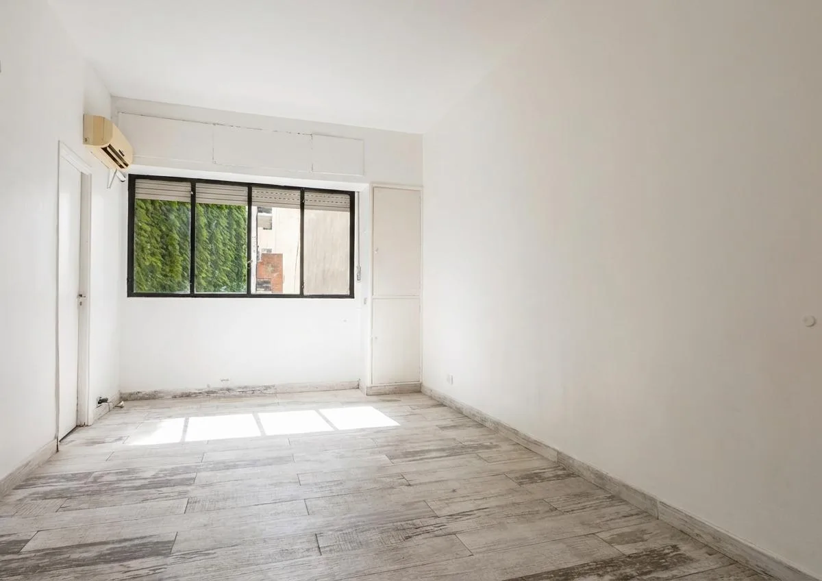 Studio apartment on the 5th floor, courtyard-facing in Recoleta, on Rodríguez Peña between Juncal and Arenales. It has north-west orientation, double-height ceilings, natural ventilation, porcelain wood-look flooring in light tones, and updated bathroom fixtures and flooring. Separate kitchen with Silestone countertop and renovated under-counter cabinetry; heating and cooling via split air conditioning (cold/warm). The building is of rationalist design, about 70 to 80 years old, with a live-in c