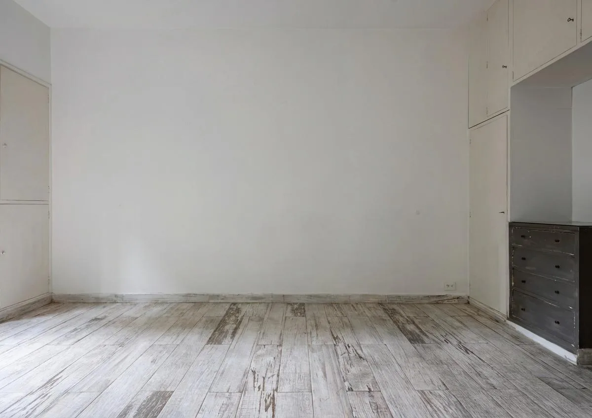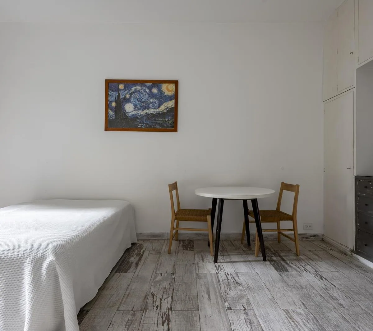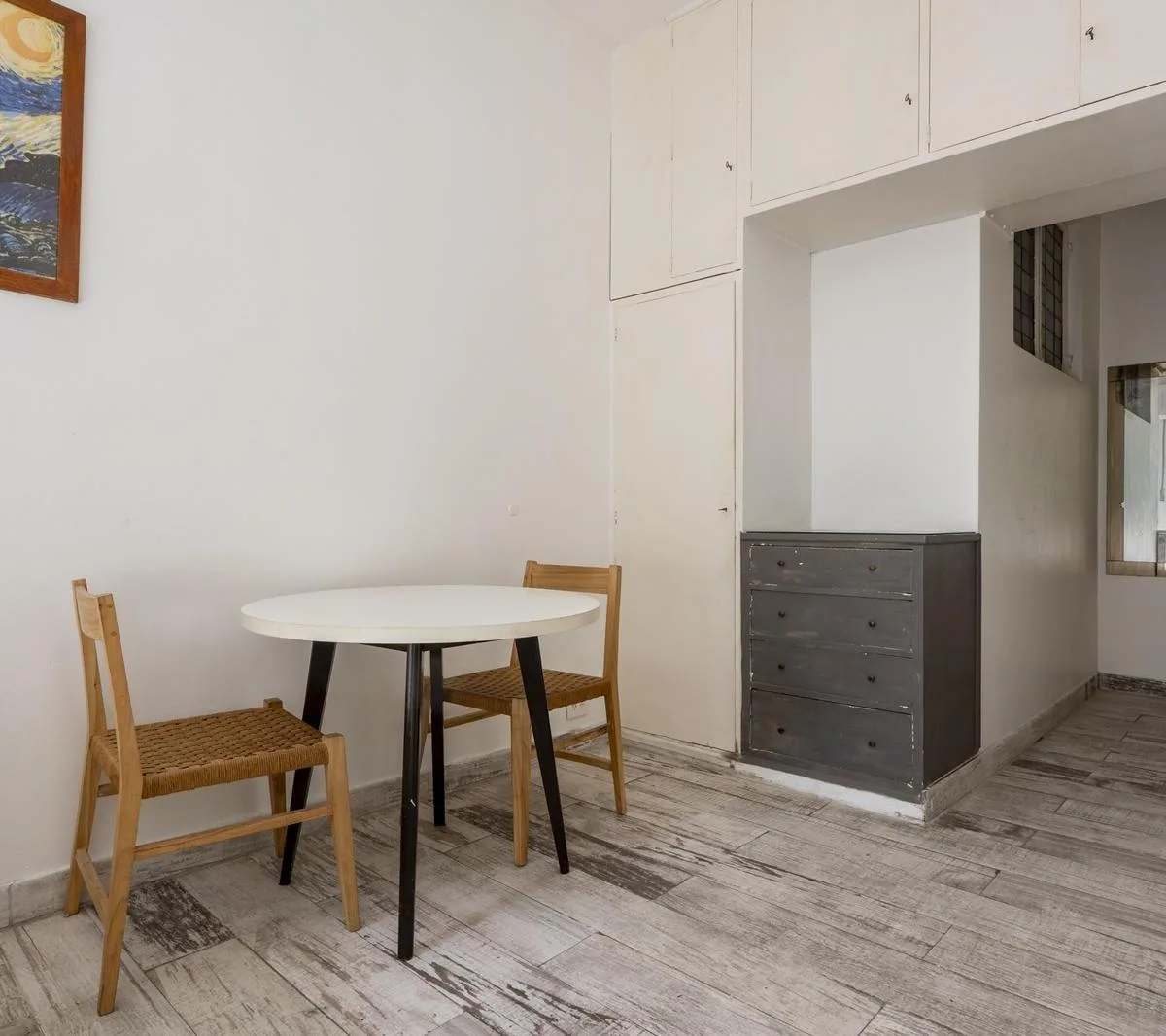 Studio apartment on the 5th floor, courtyard-facing in Recoleta, on Rodríguez Peña between Juncal and Arenales. It has north-west orientation, double-height ceilings, natural ventilation, porcelain wood-look flooring in light tones, and updated bathroom fixtures and flooring. Separate kitchen with Silestone countertop and renovated under-counter cabinetry; heating and cooling via split air conditioning (cold/warm). The building is of rationalist design, about 70 to 80 years old, with a live-in c