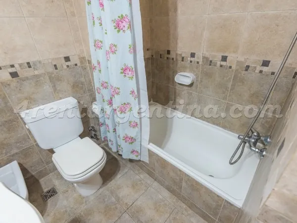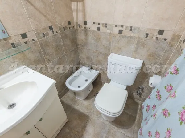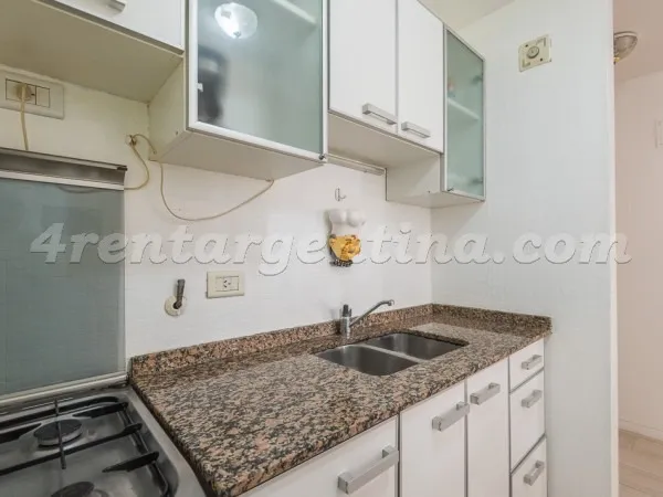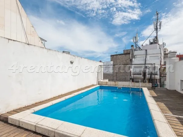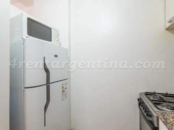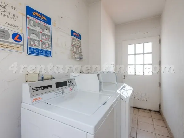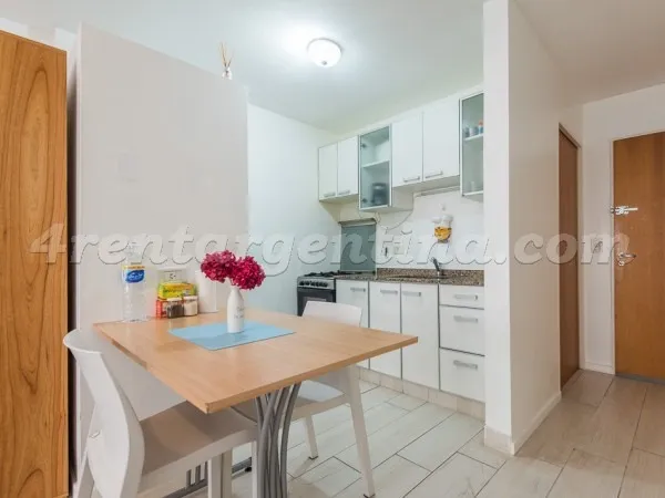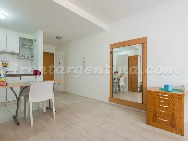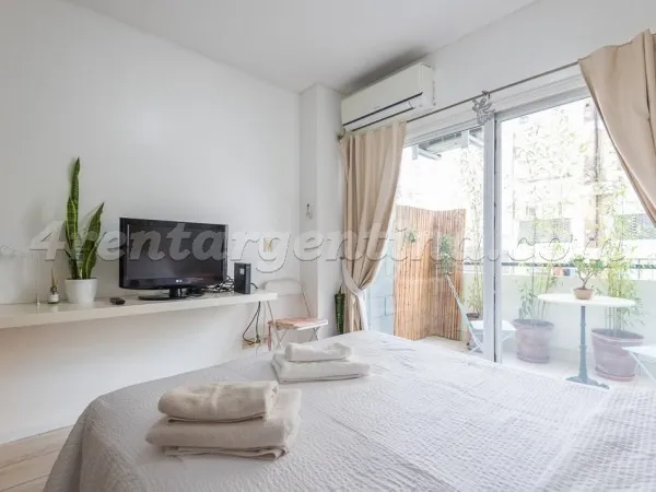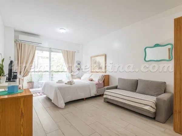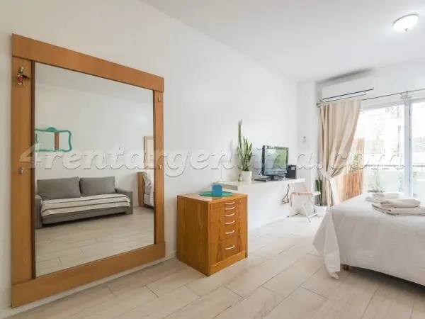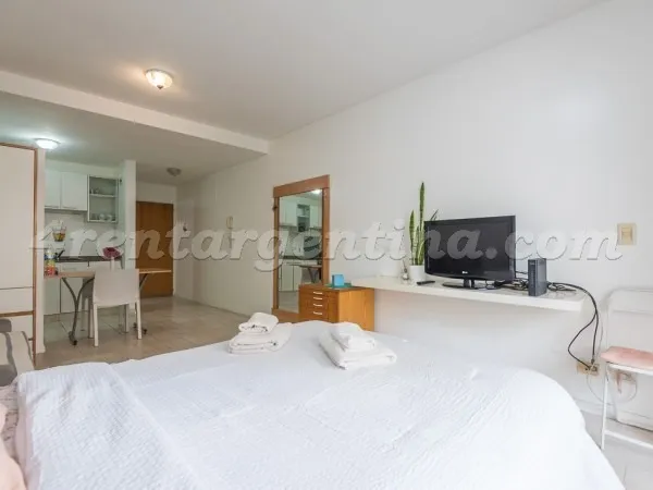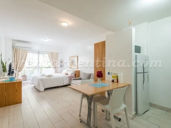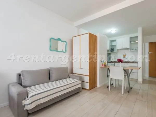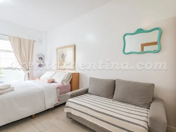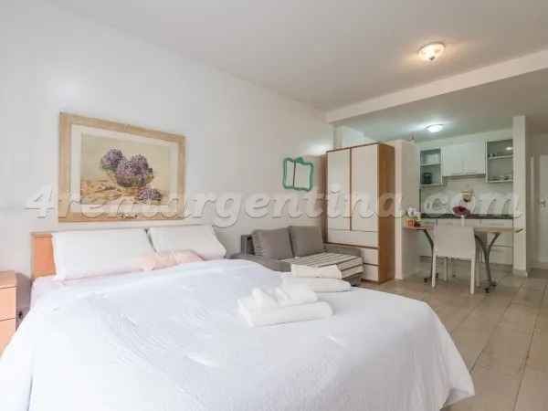 Furnished studio apartment for up to 3 people with street-facing balcony. Includes a double bed and a sofa bed, a fully equipped kitchen, and a full bathroom with a bathtub. Air conditioning (cold) and central heating are included, along with cable TV and Wi-Fi, and kitchen appliances such as a fridge with freezer, microwave, oven, gas hob, toaster, electric kettle, and coffee maker; it also has a washer and dryer (coin-operated) in the building and an LCD TV. Building amenities include a pool a