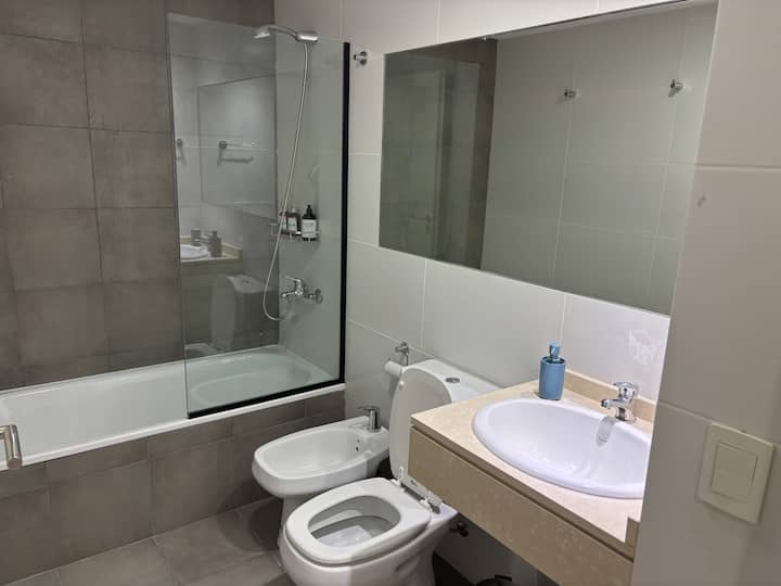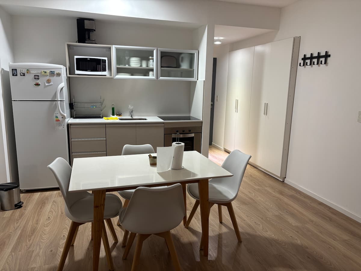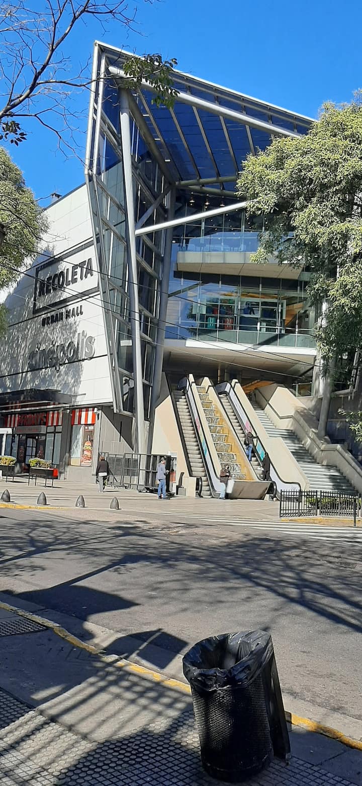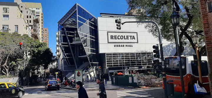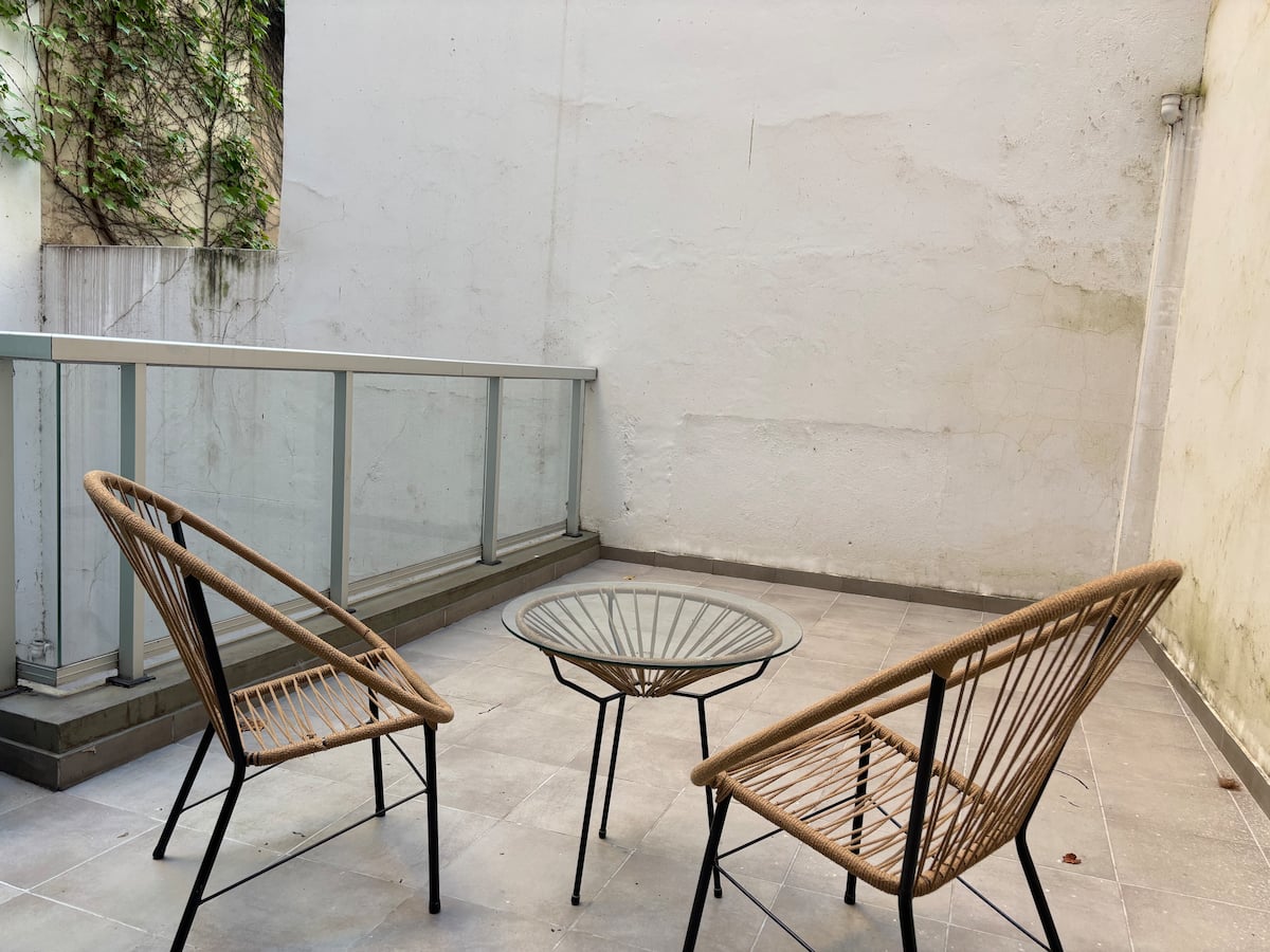 Studio apartment with a terrace in Recoleta on Av. Las Heras, one block from Shopping Village Recoleta. The unit has a kitchen and a full bathroom. It is furnished with a queen-size bed and a queen-size sofa bed, plus air conditioning (hot/cold). The building has a communal room (SUM) accessible to owners and a laundry room in the basement with paid machines.