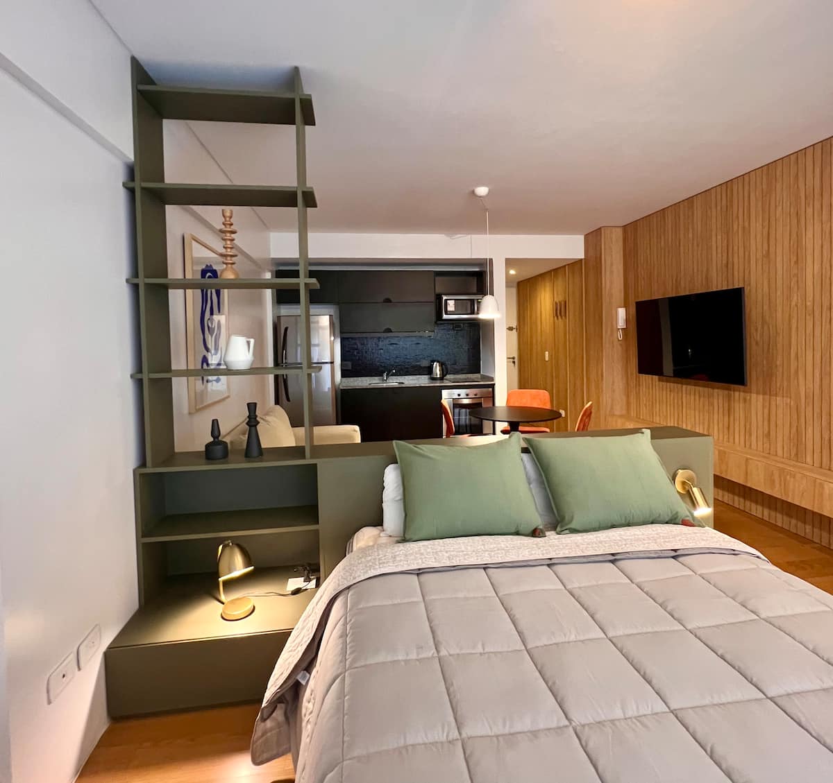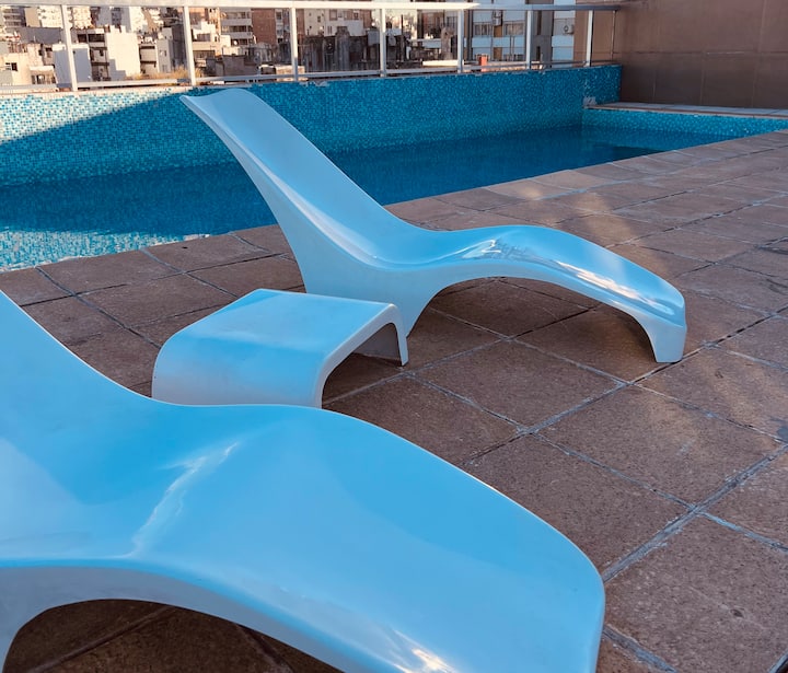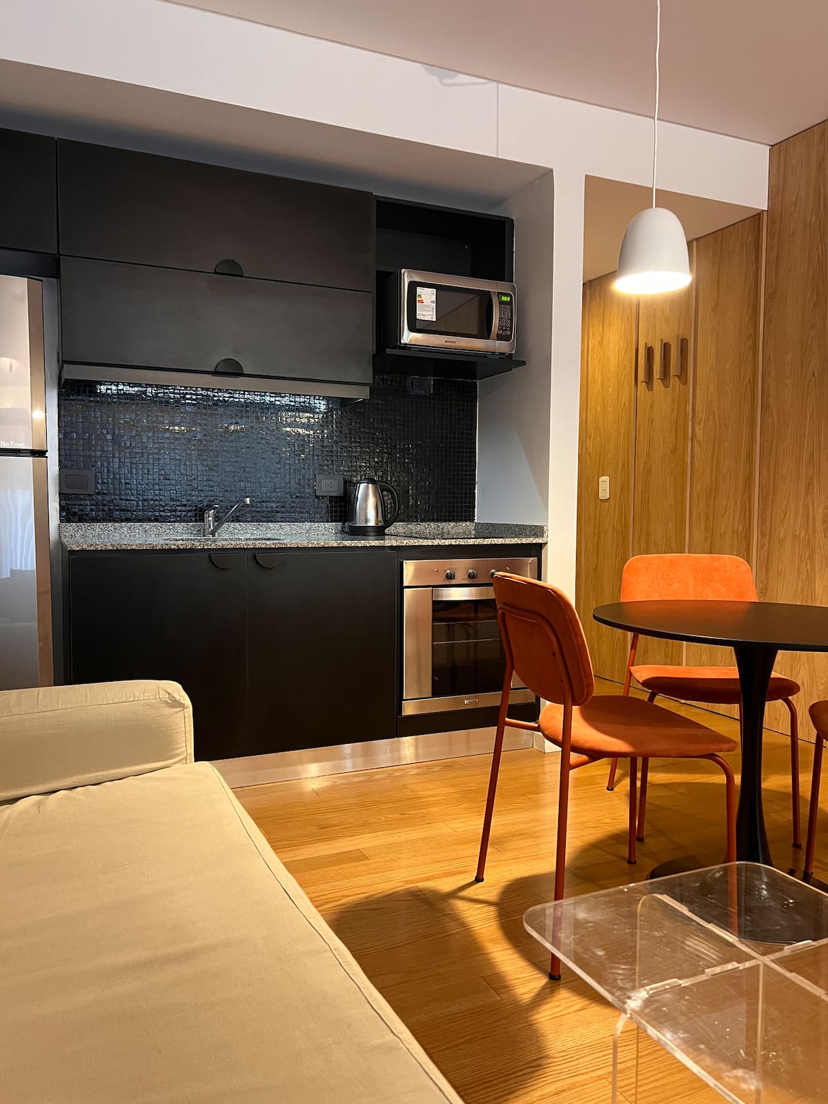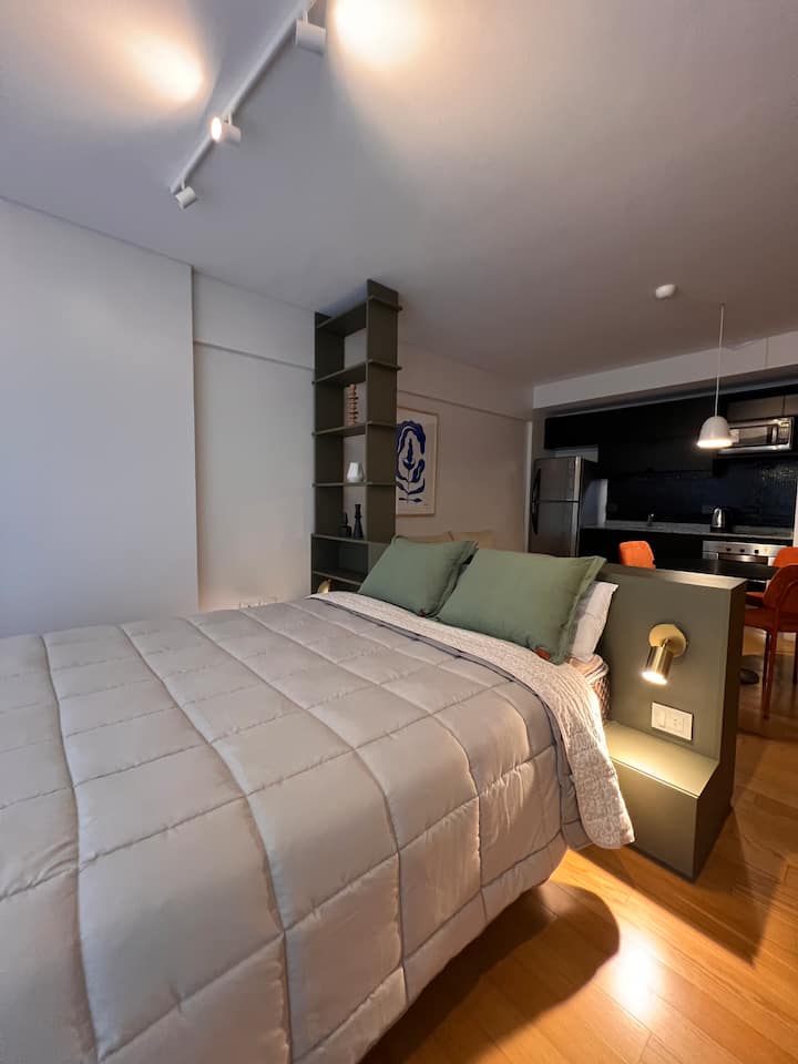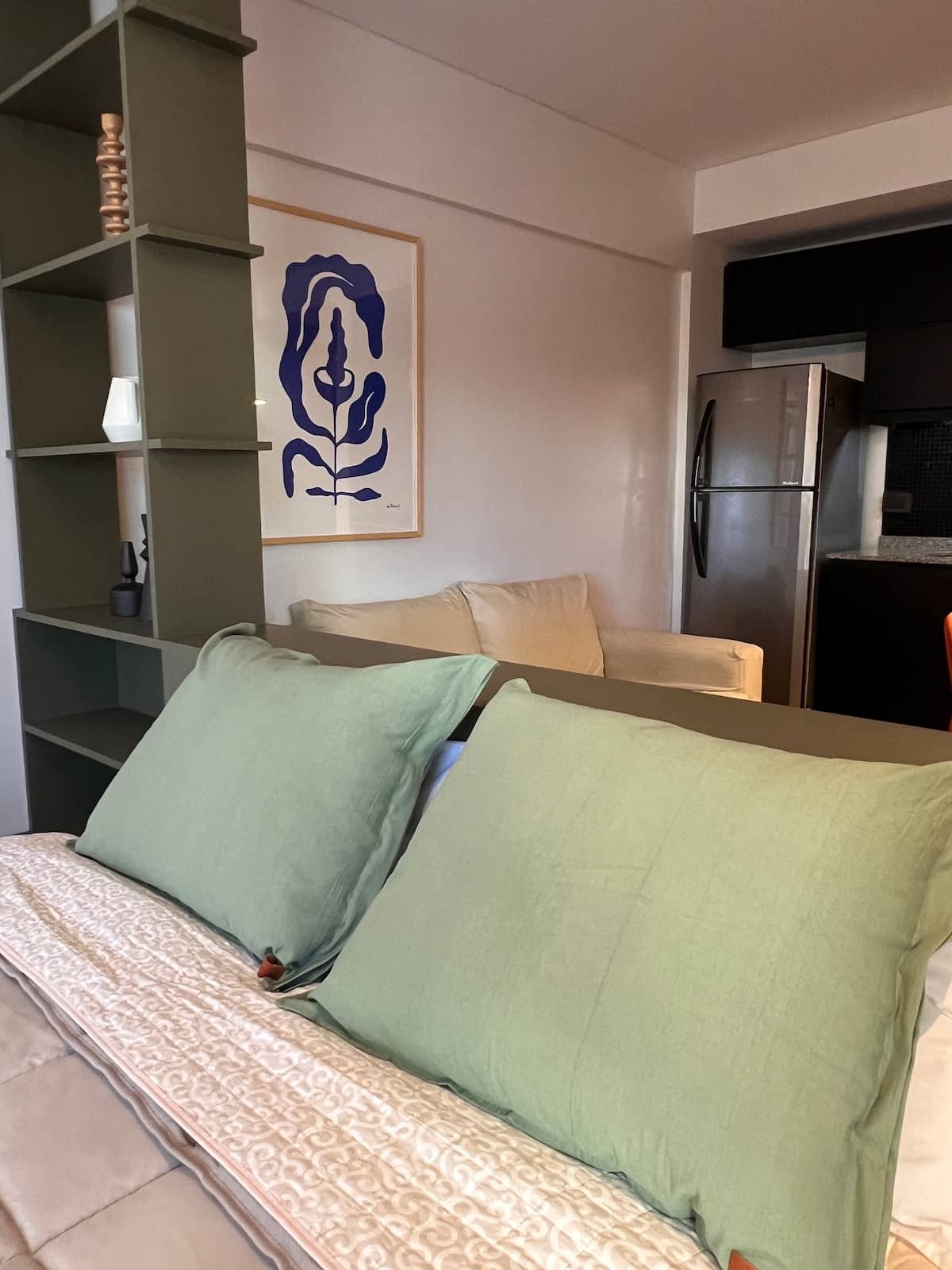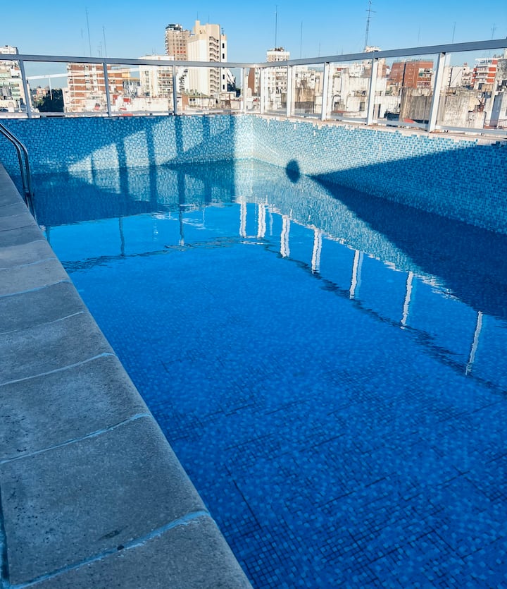 Studio apartment with a balcony and double-glazed windows. The building offers a pool. New unit.