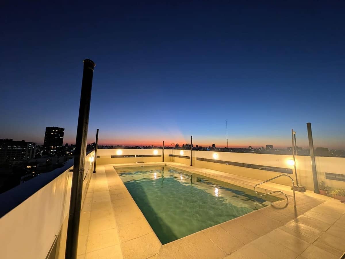 Studio apartment in Recoleta on Av. Santa Fe, 24 m². Furnished with a foldable double bed, double-glazed windows, fridge with freezer, electric oven, microwave, induction electric stove, washer-dryer, and hot/cold air conditioning. Building services include 24-hour security and reception, a terrace pool open all day during the summer months (generally November/December to March/April), and residents have access to high-speed WiFi (300 Mbps), a safe, and a digital lock. The listing states the gar