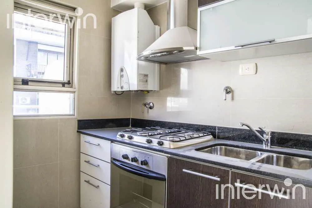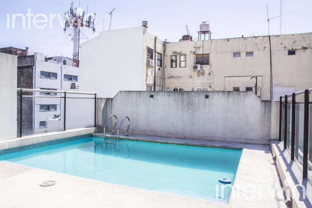 Studio apartment on the 6th floor, street-facing on Azcuenaga, about 50 metres from Av. Santa Fe. The building has a ground floor and 8 storeys, with parking in the basement. The rooftop has a pool and solarium, and there is a communal room (SUM) with a grill and laundry. The kitchen includes an Ariston stainless-steel oven and cooktop. Hot water and heating are provided by an individual Baxi boiler. The unit has installation for a split air-conditioning system, without the equipment.