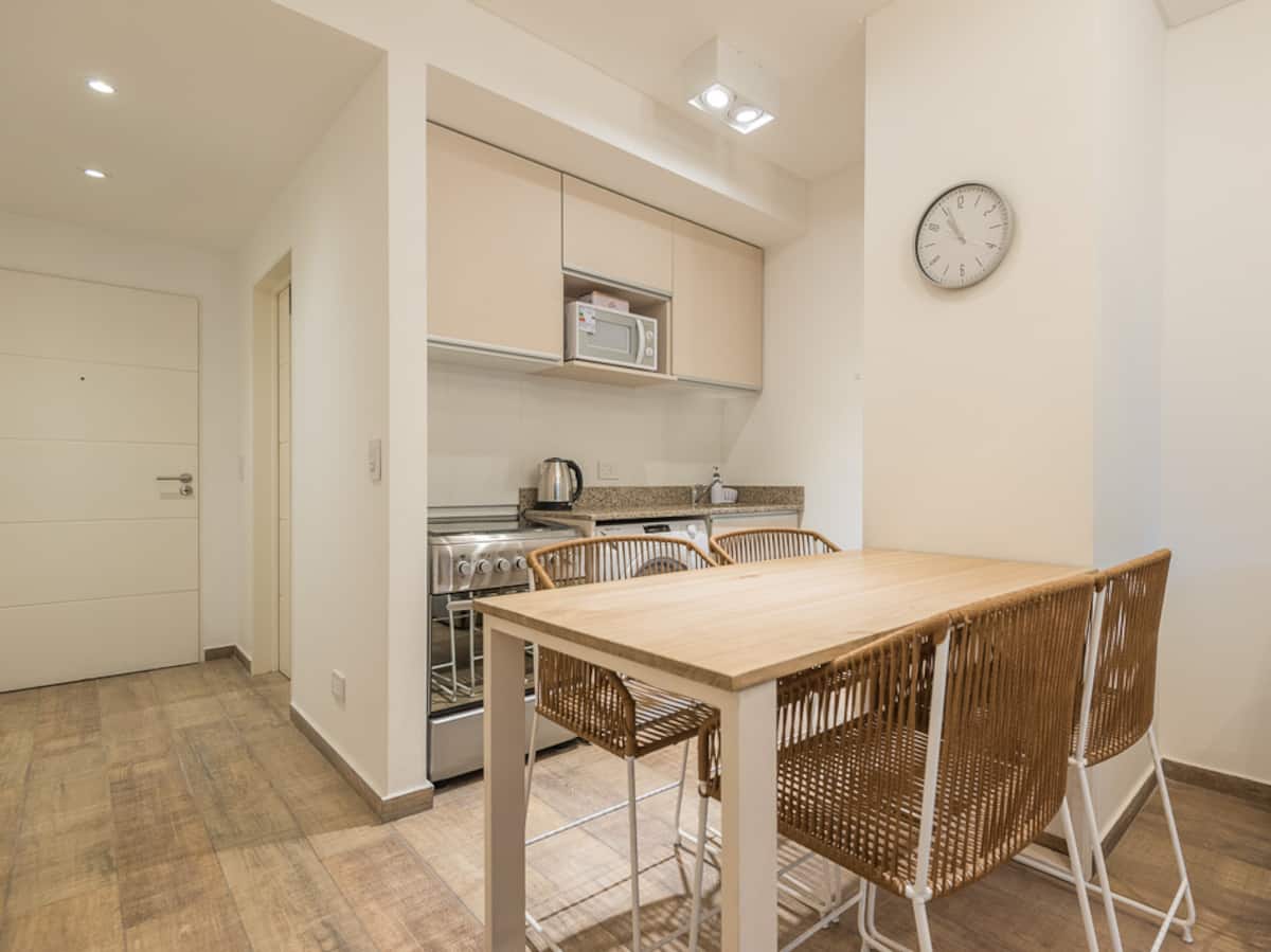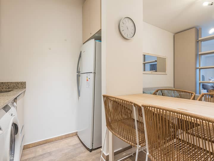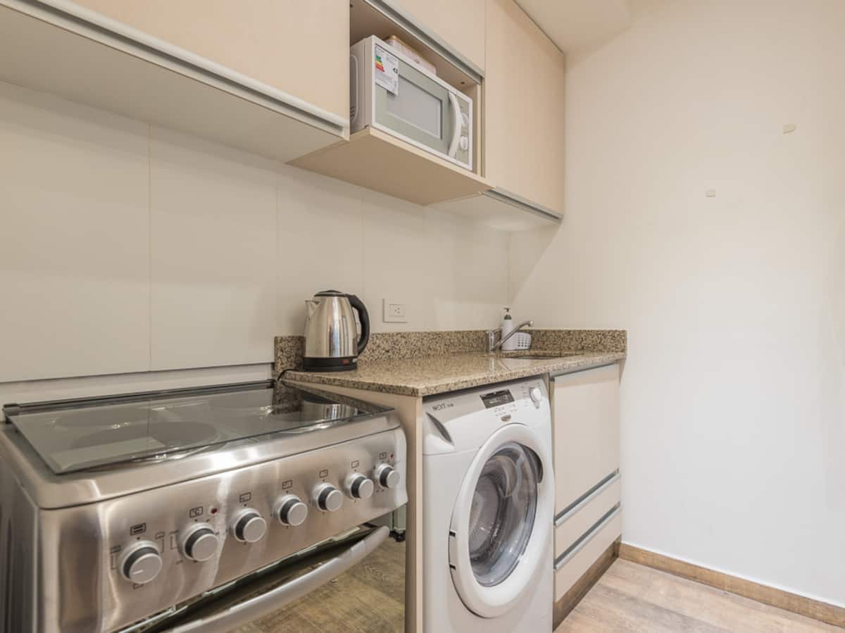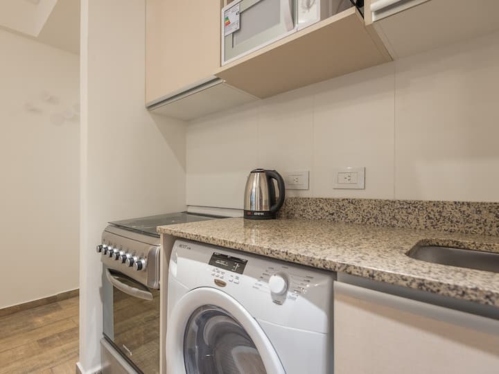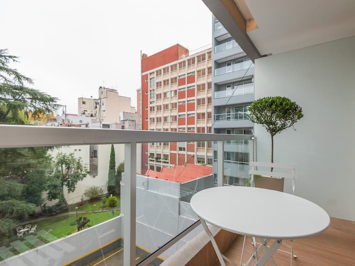 Studio apartment in Recoleta for 4 people. It has two single beds that can be joined as a double bed, a sofa bed with wheeled cart, a table with chairs, a full kitchen with refrigerator with freezer, oven and washing machine, and a full bathroom with a bathtub. Street-facing balcony. Includes biweekly cleaning service. Building amenities include a gym, a swimming pool (available in summer) and a solarium.