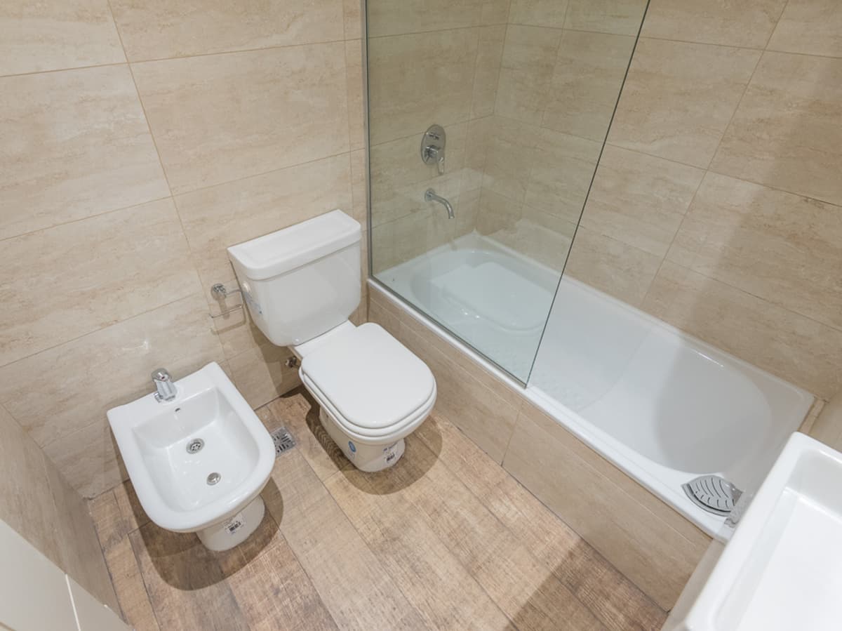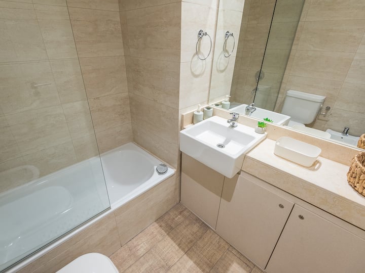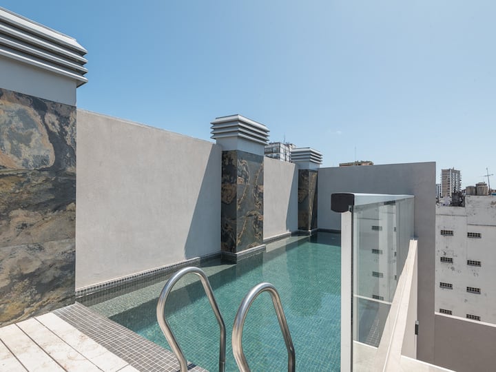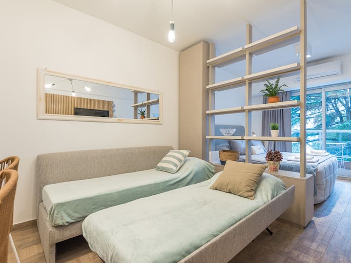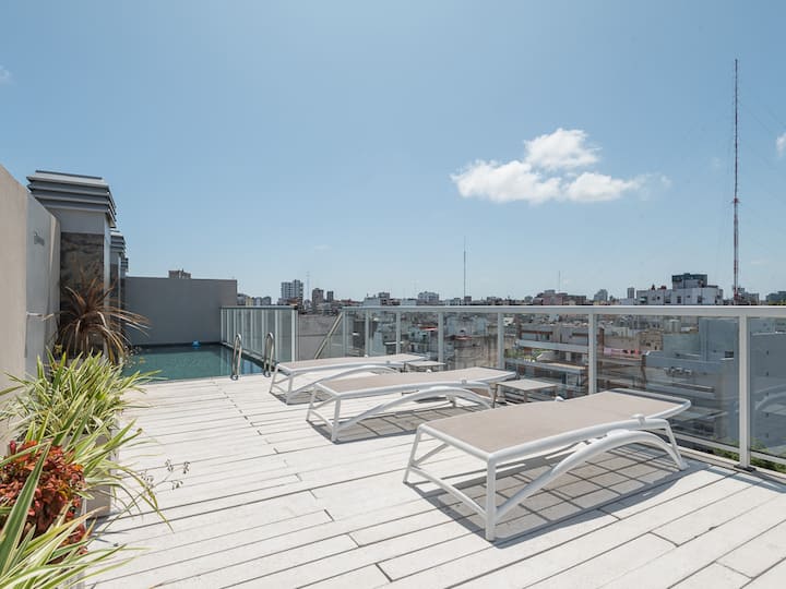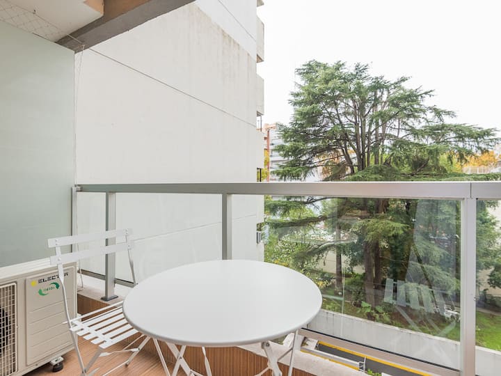 Studio apartment in Recoleta for 4 people. It has two single beds that can be joined as a double bed, a sofa bed with wheeled cart, a table with chairs, a full kitchen with refrigerator with freezer, oven and washing machine, and a full bathroom with a bathtub. Street-facing balcony. Includes biweekly cleaning service. Building amenities include a gym, a swimming pool (available in summer) and a solarium.