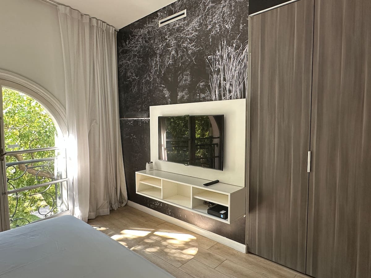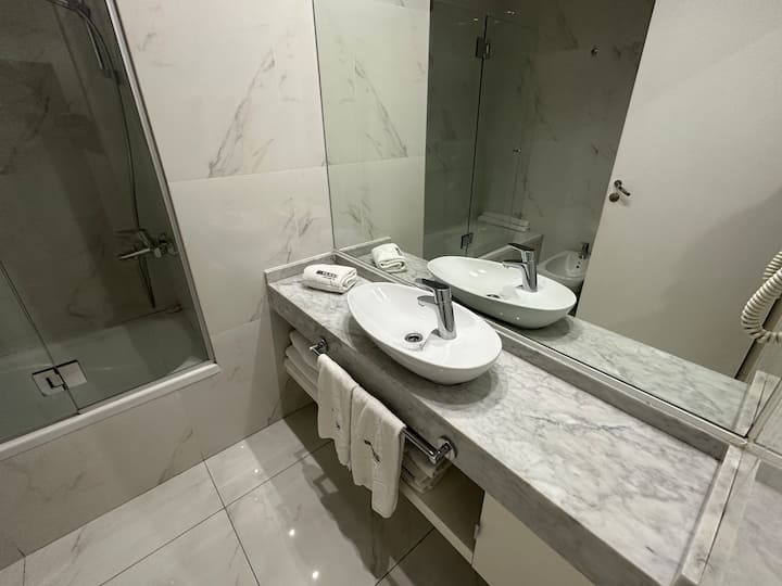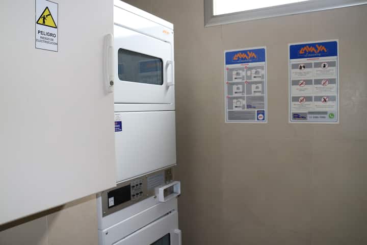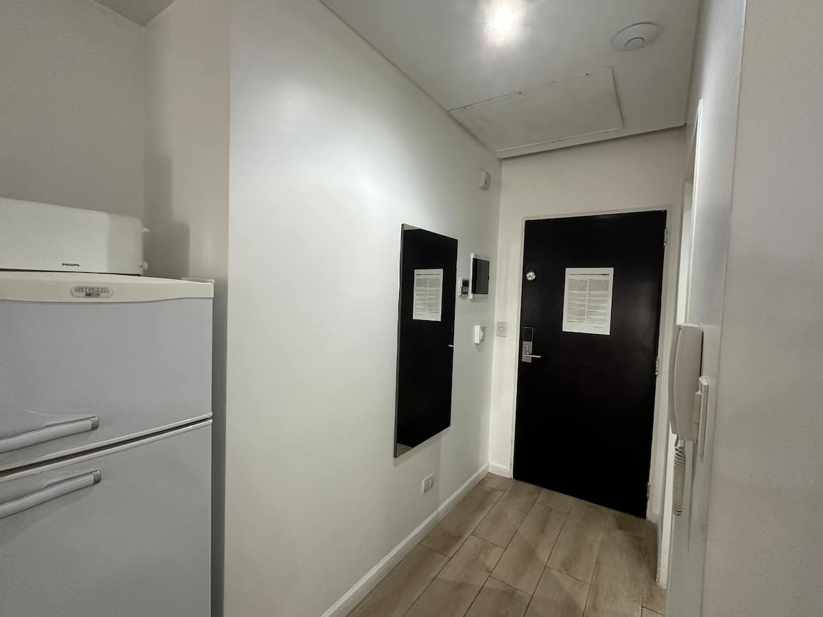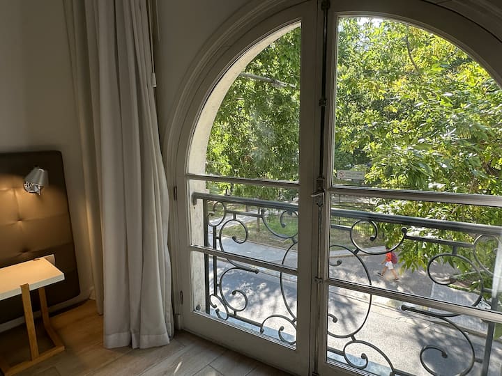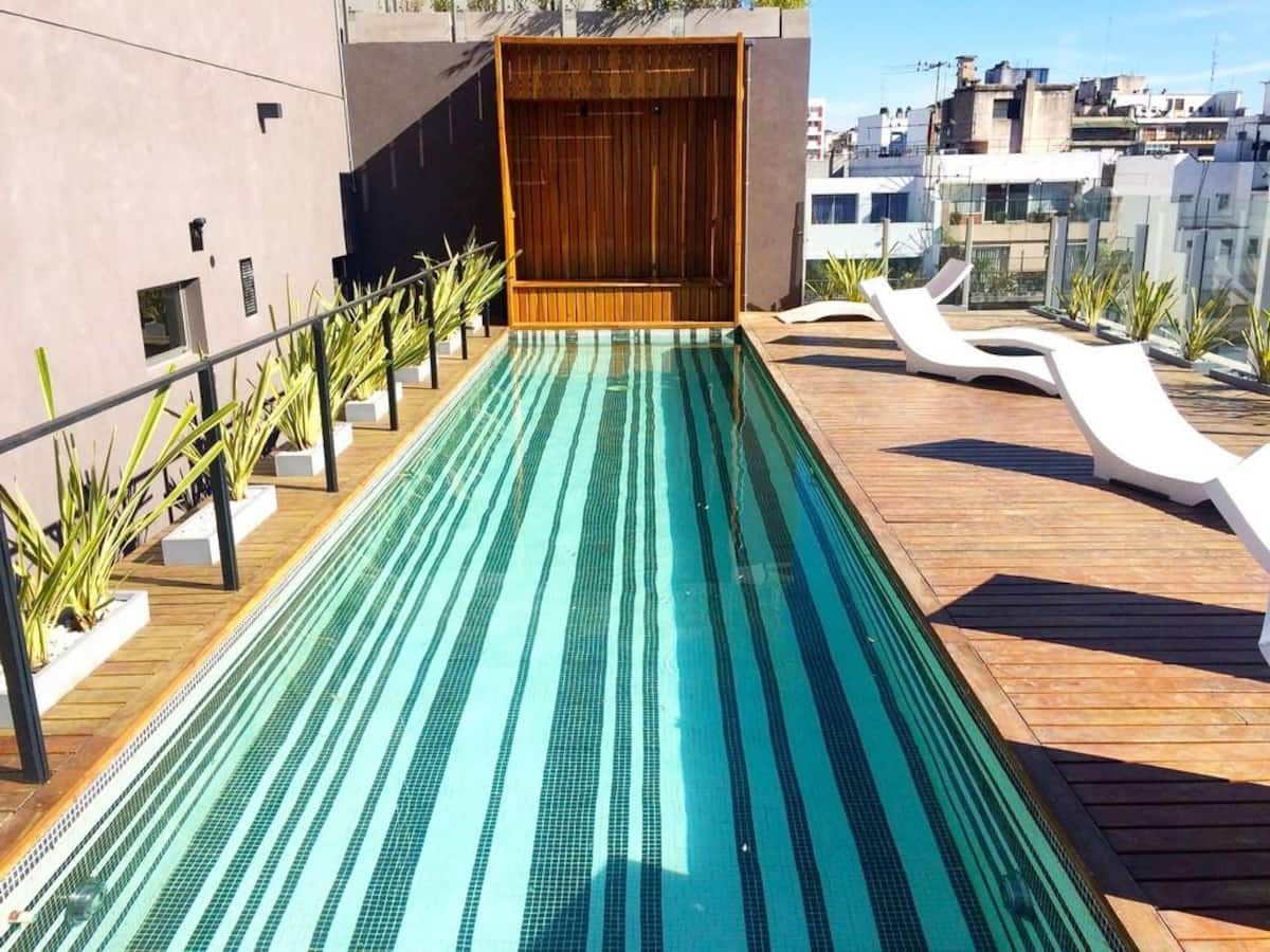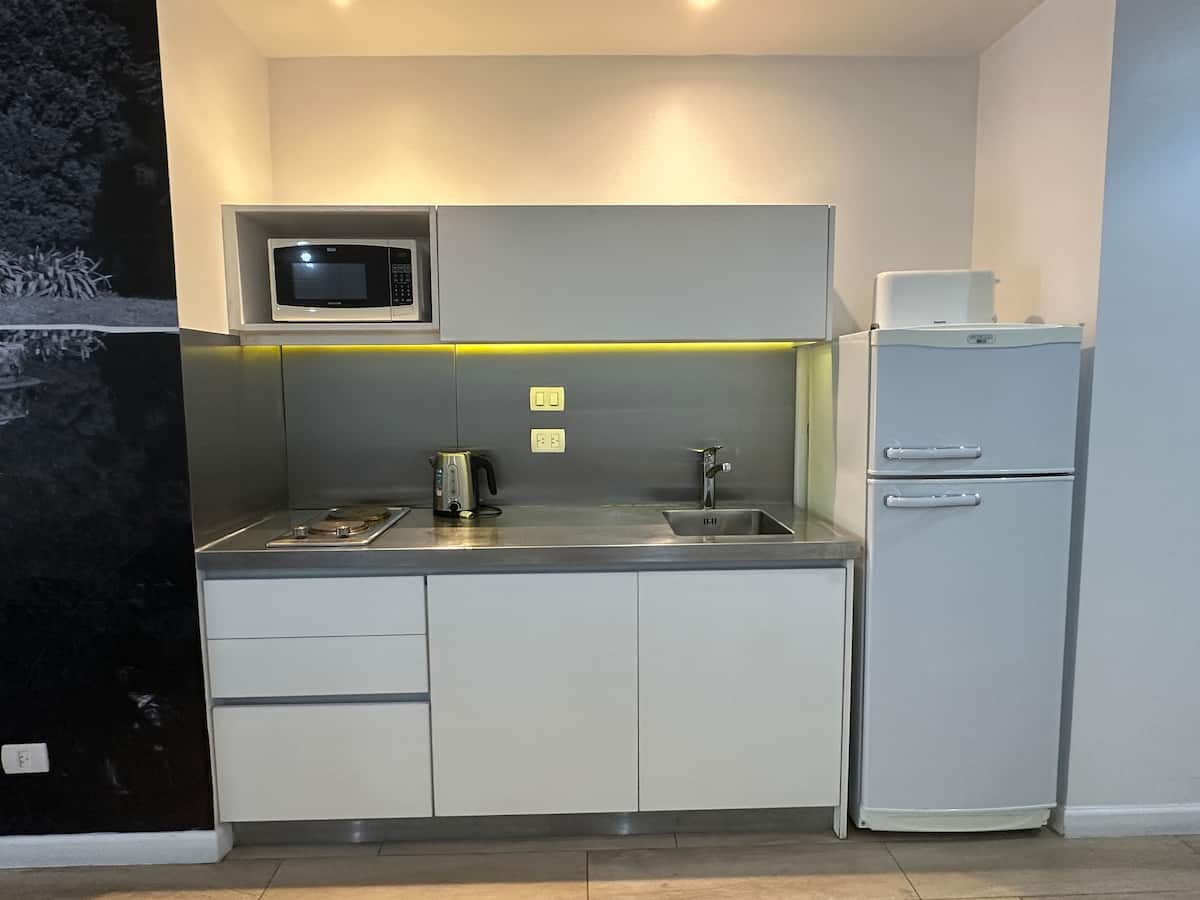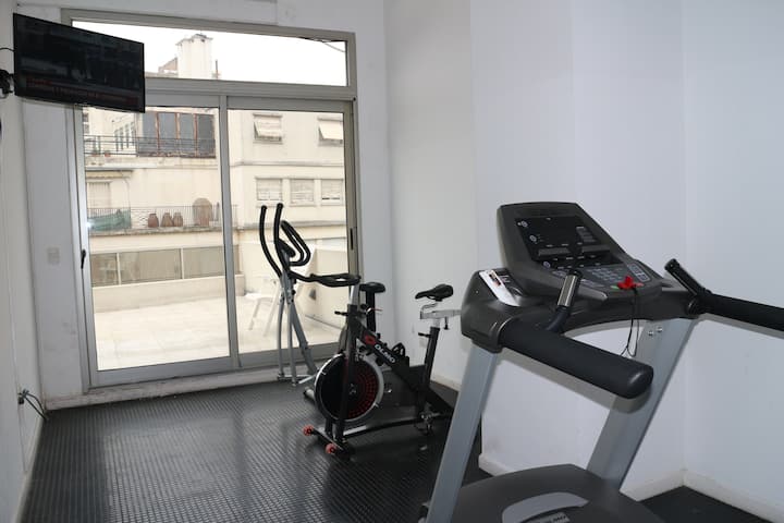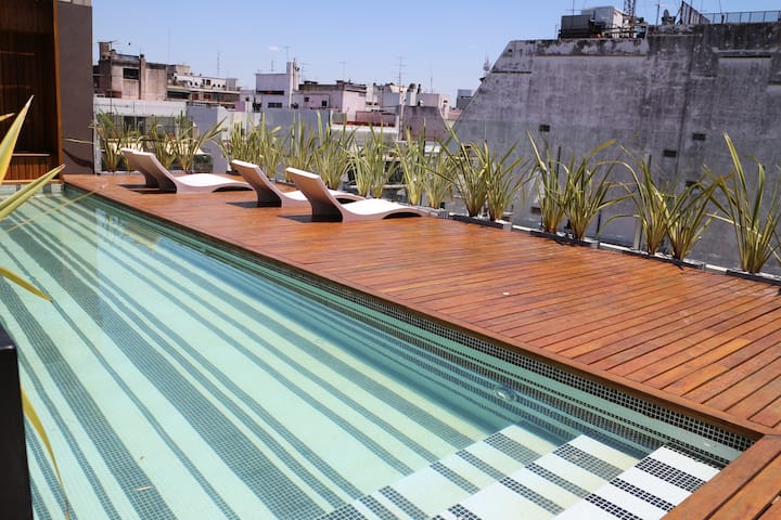 Studio-loft apartment in Recoleta. It covers more than 40 m² and is street-facing with double-glazed windows. The unit includes an integrated kitchen with a refrigerator and microwave, air conditioning, free Wi-Fi, and cable TV, with one full bathroom. The building has 24-hour electronic security and includes a pool with solarium, small gym, sauna, and laundry for an extra charge.