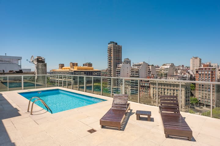 Studio apartment in Recoleta with a private balcony. The building includes an outdoor terrace pool, gym, sauna, laundry facilities and 24-hour security. The listing notes proximity to Floralis Genérica (200 metres) and Av. Del Libertador (200 metres).