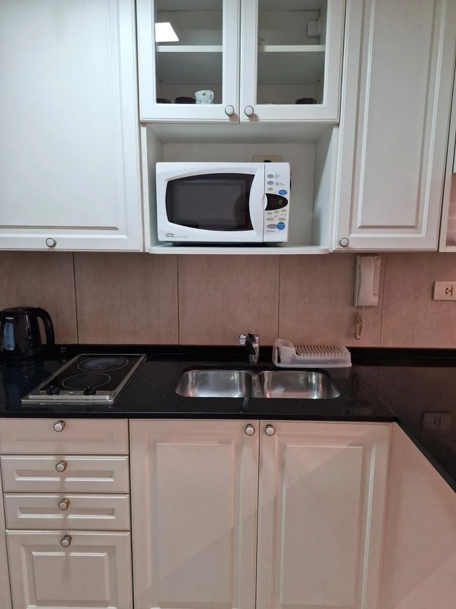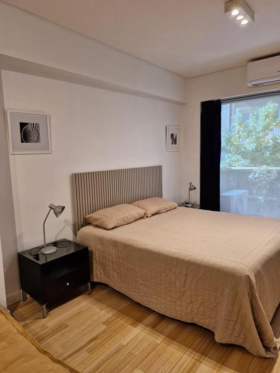 Studio apartment on the 2nd floor in the Premier Arenales building, street-facing at the corner of Arenales and Azcuénaga with views over Azcuénaga. Fully furnished and equipped, with an entry hall and sliding-door wardrobe, an integrated kitchen with breakfast bar, and a living area opening to a street-facing balcony. Central hot water, cold/warm air conditioning, and 24-hour security. The building has a rooftop terrace with pool and solarium, gym and communal room, and laundry facilities in th