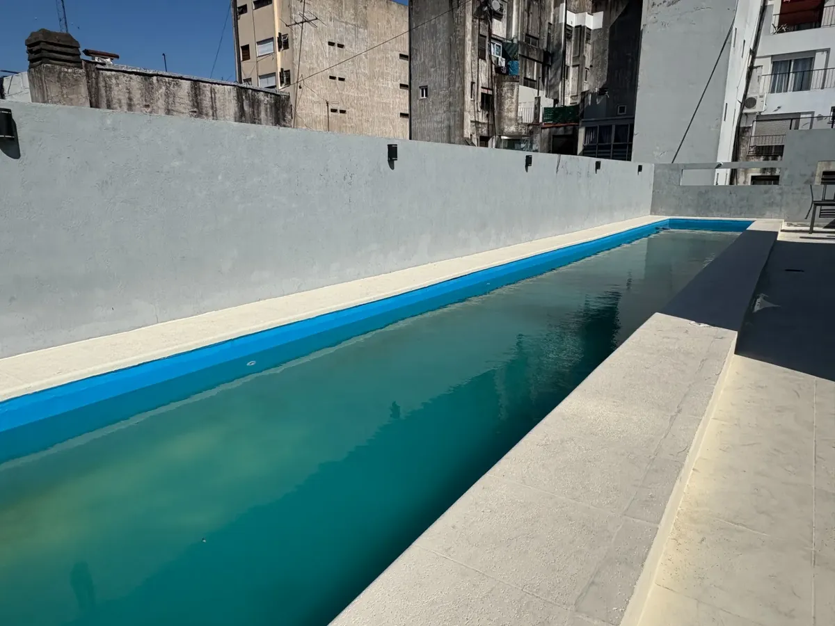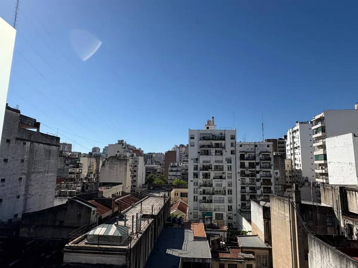 Studio apartment on a high floor in Recoleta, on Paraguay between Av Pueyrredón and Ecuador, with a balcony and open view. The unit has a 7.20 x 4 m main space, an integrated kitchen with a granite countertop and double stainless-steel sink, and a bathroom with a marble vanity and ceramic sink. Split air conditioning (hot and cold), central hot water and built-in storage/closet are included. Building amenities include laundry, a terrace with a grill, solarium and a 20 m x 2.5 m pool, with public