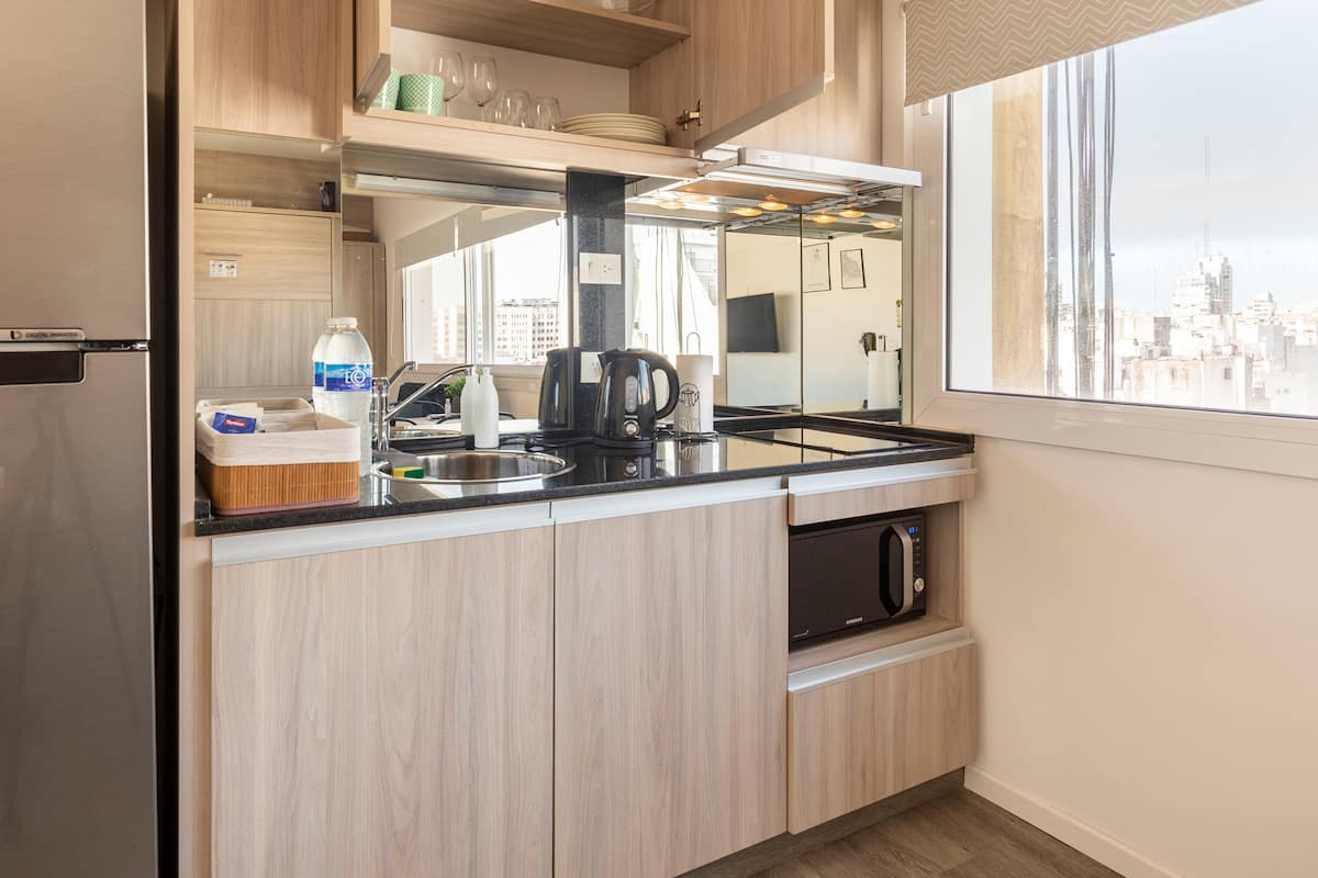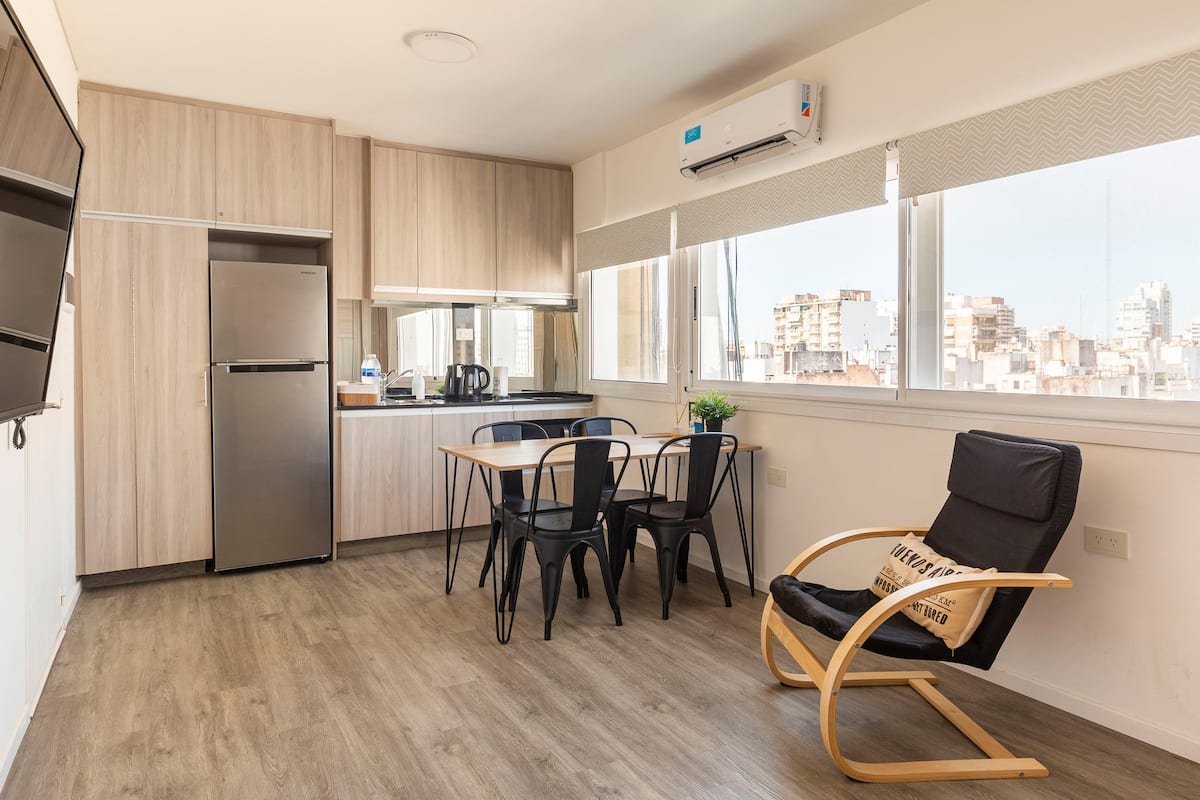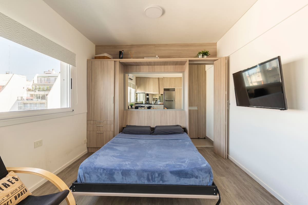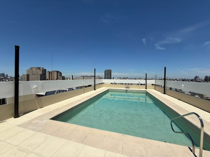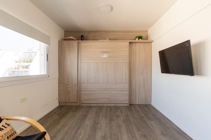 Studio apartment in Recoleta on Av. Santa Fe. Furnished and equipped, with double flip bed, large dresser with freezer, microwave with grill, electric hotplate, washing machine, air conditioning (cold/cold), and a digital lock with self check-in/out. The building has 24-hour security and reception, and a pool open all day during summer months (generally from November/December to March/April). High-speed WiFi (300 Mbps) and a 40" Smart TV with open digital TV are included.