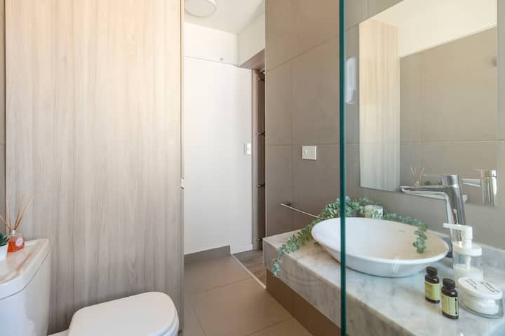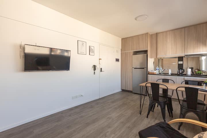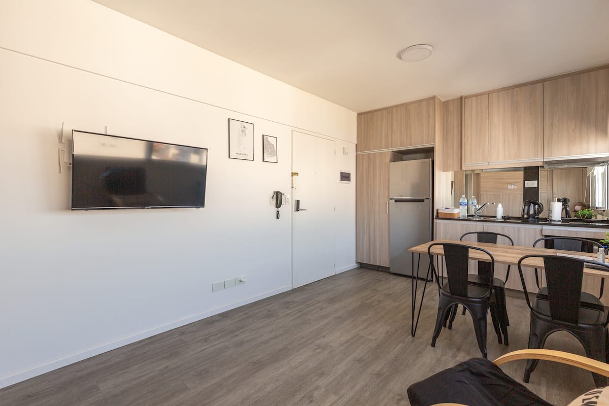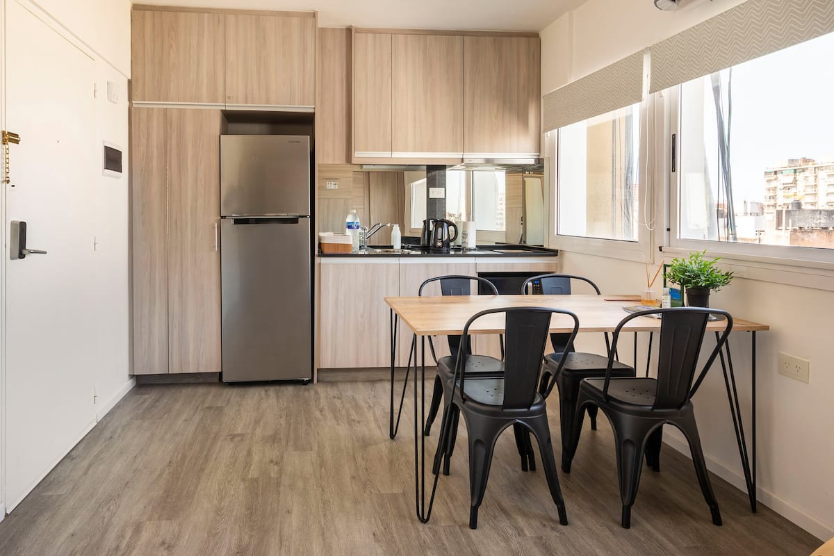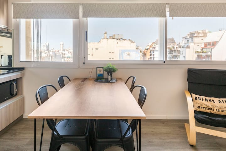 Studio apartment in Recoleta on Av. Santa Fe. Furnished and equipped, with double flip bed, large dresser with freezer, microwave with grill, electric hotplate, washing machine, air conditioning (cold/cold), and a digital lock with self check-in/out. The building has 24-hour security and reception, and a pool open all day during summer months (generally from November/December to March/April). High-speed WiFi (300 Mbps) and a 40" Smart TV with open digital TV are included.