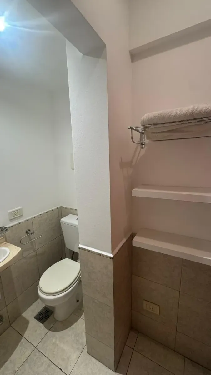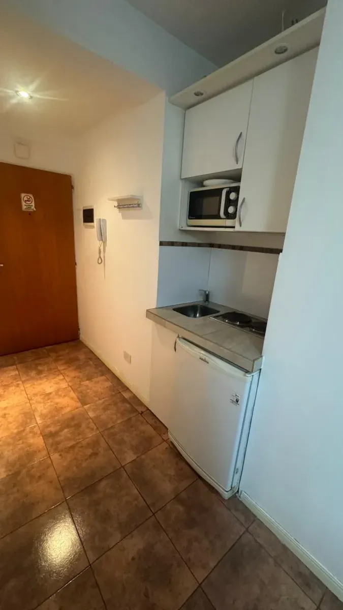 Furnished studio apartment in Recoleta with a double bed, TV, table and chairs. Includes a microwave and air conditioning. Building fees are $130.000. The building has a communal room (SUM) and a grill. Utilities are not included in the rent.