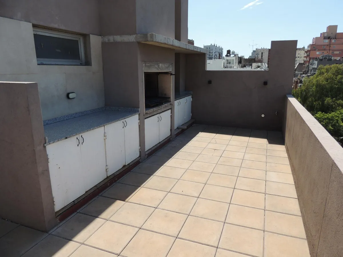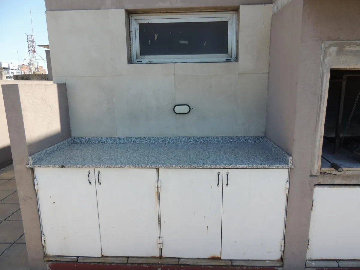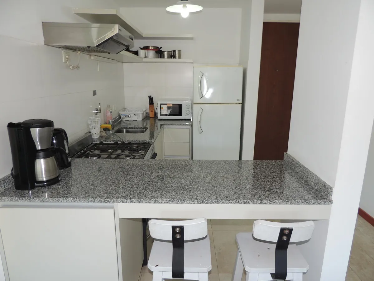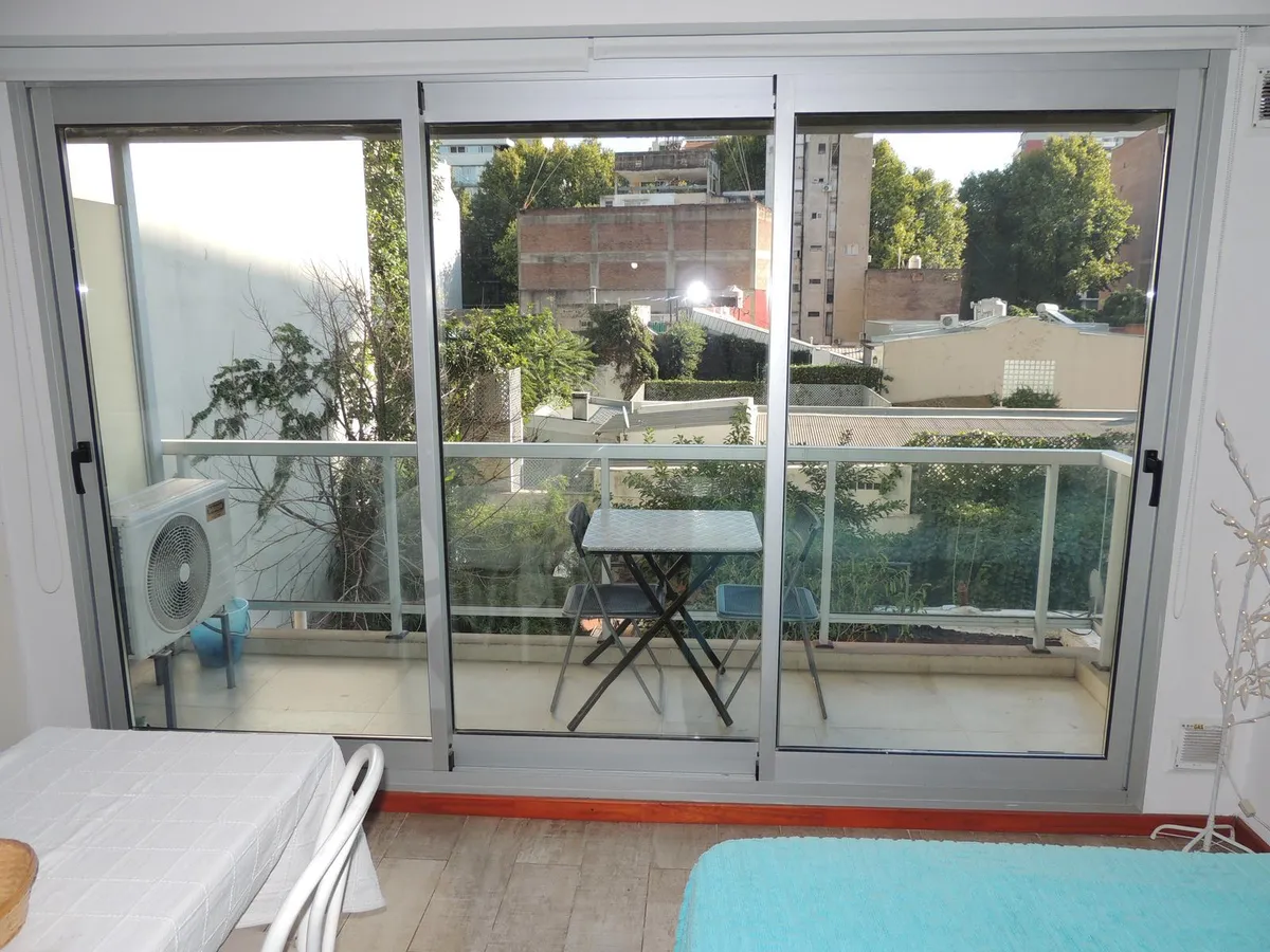 Studio apartment with an integrated kitchen and breakfast bar, plus a balcony, in Recoleta. It is furnished and fully equipped, including an air-conditioning unit (hot/cold), TV, gas cooktop with four burners and oven, and a water purifier. The bathroom is fully appointed and there are central hot-water tanks. Building amenities include an accessible elevator for people with disabilities, a rooftop terrace with a covered BBQ area at the front and a laundry area at the back with washer and dryer
