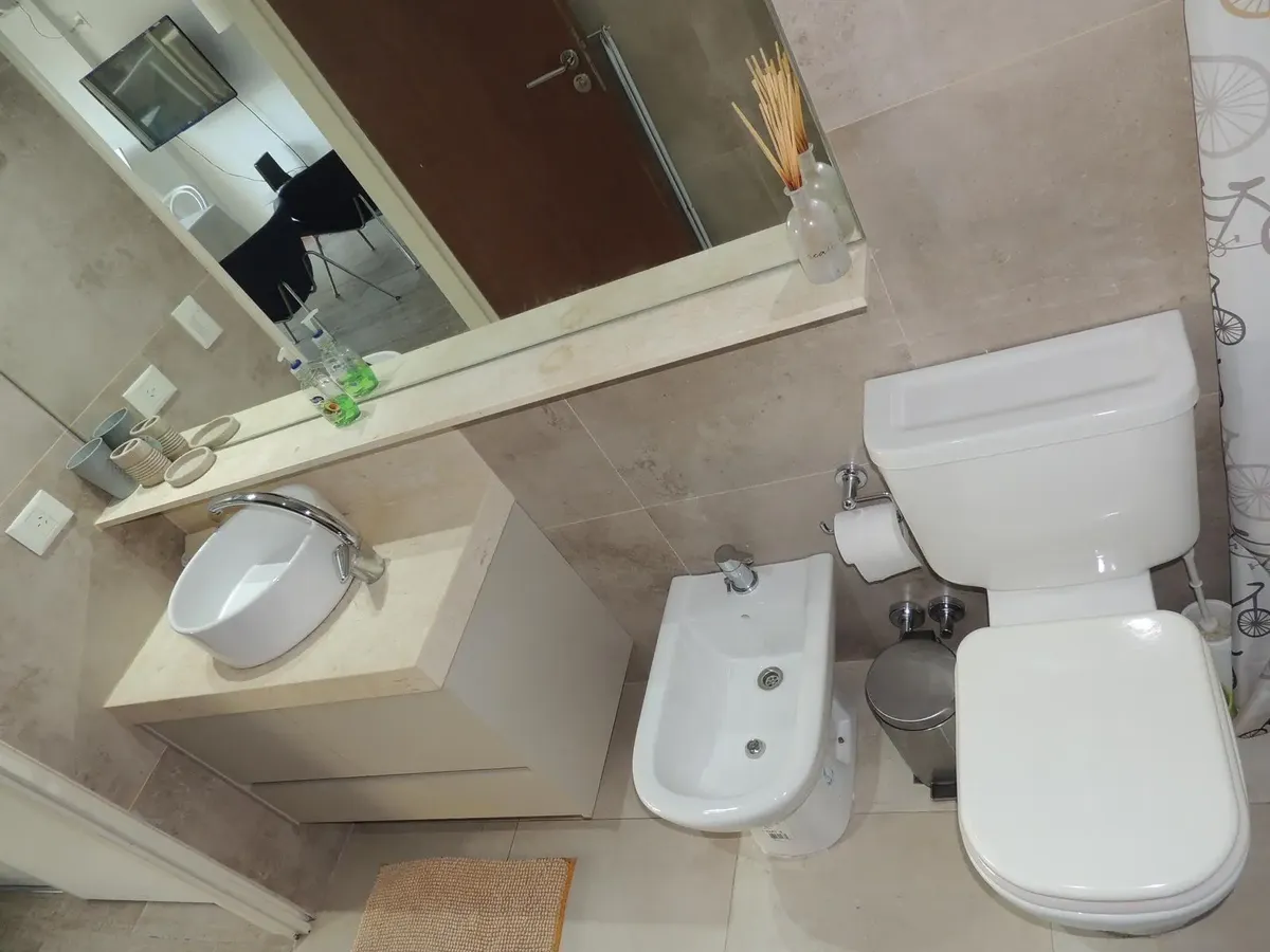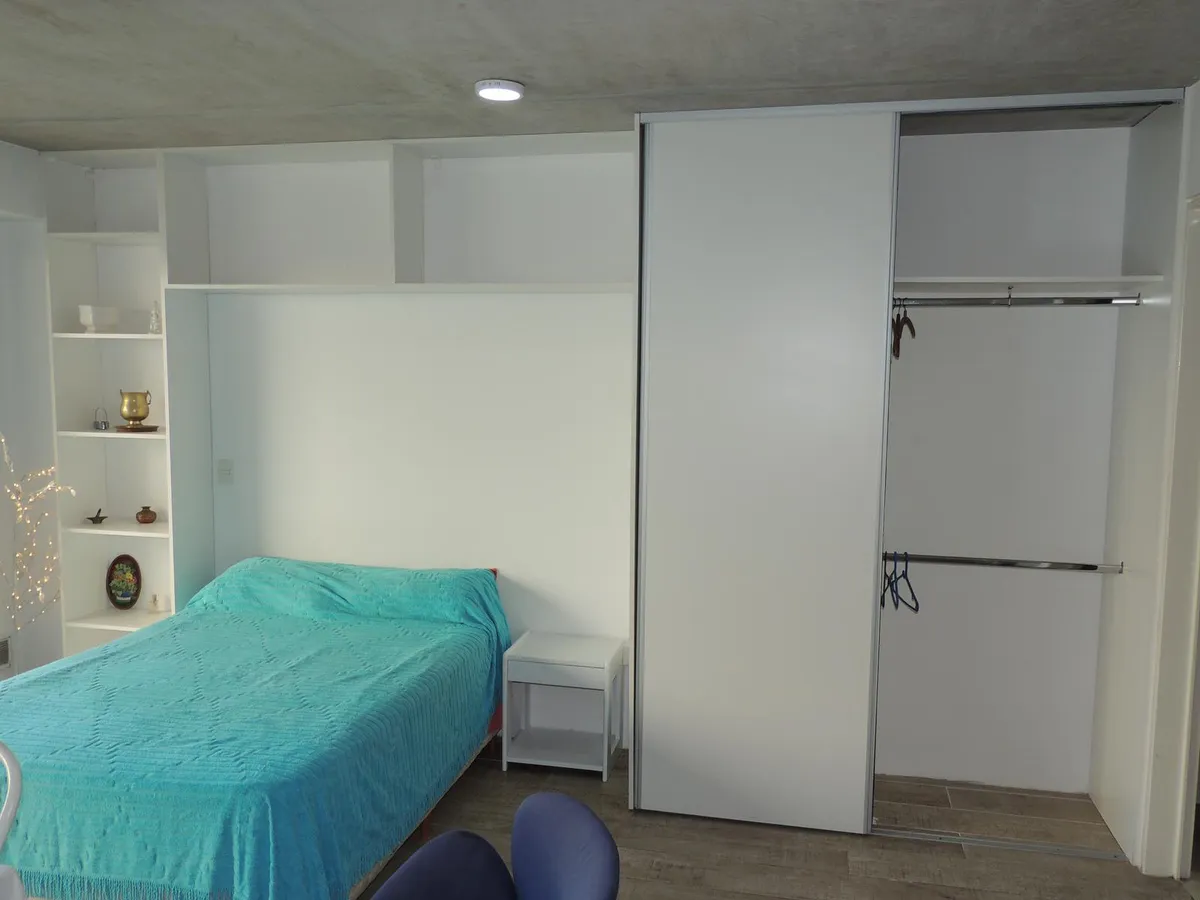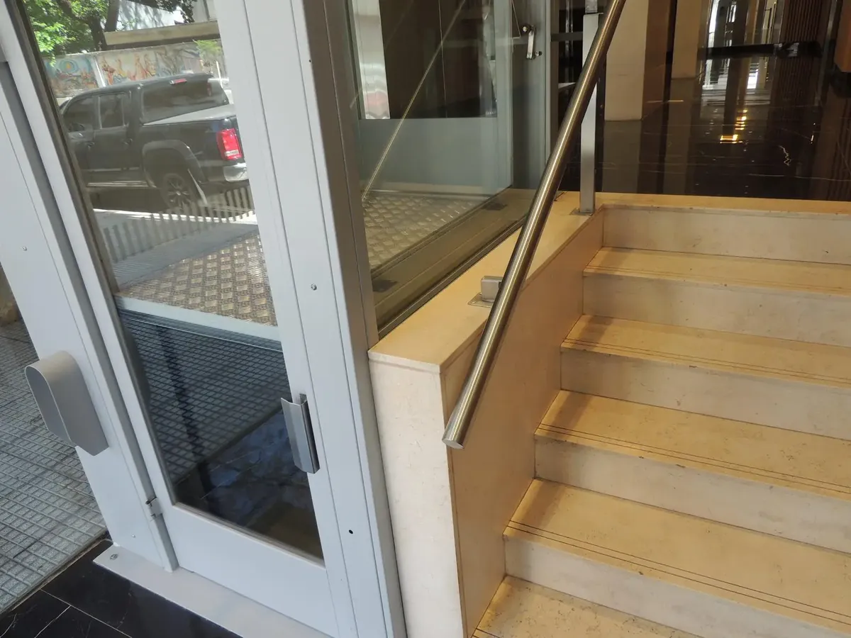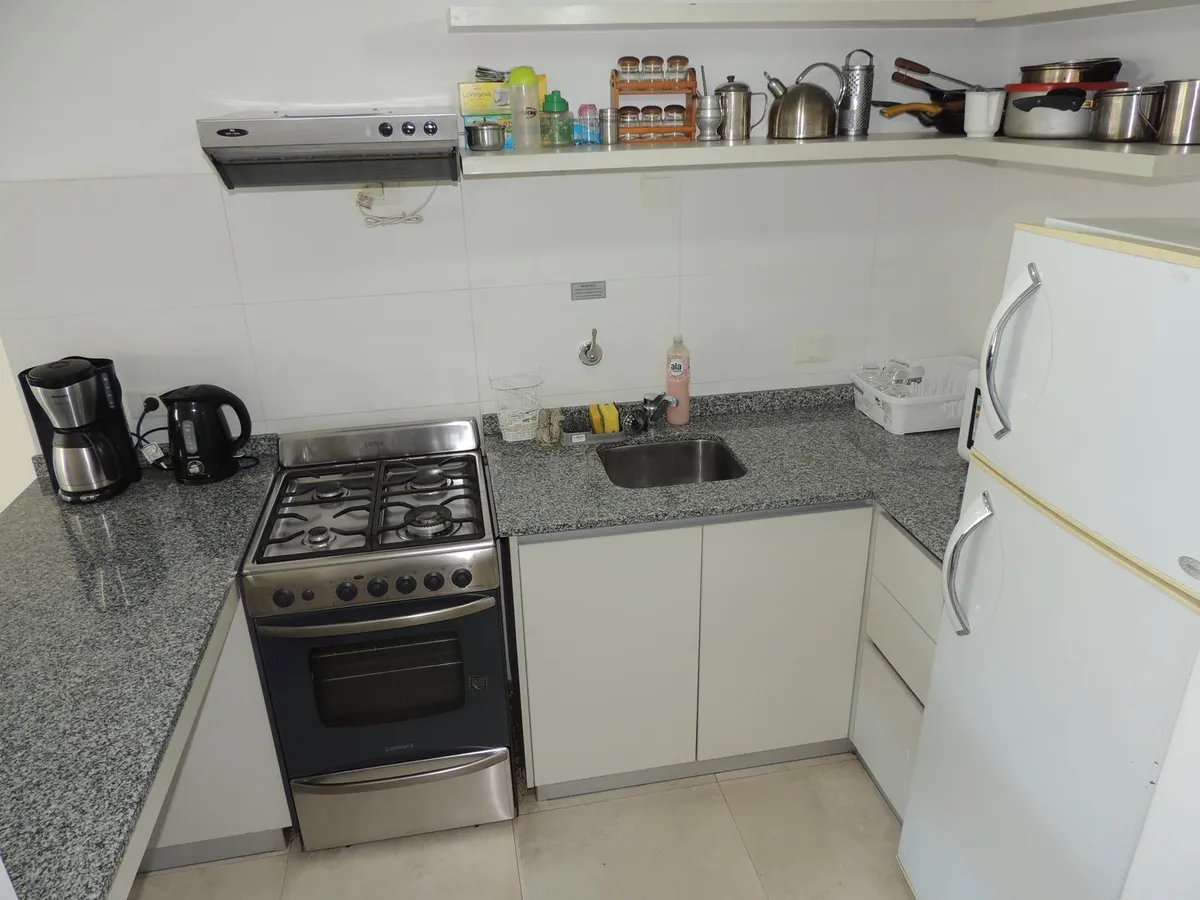 Studio apartment with an integrated kitchen and breakfast bar, plus a balcony, in Recoleta. It is furnished and fully equipped, including an air-conditioning unit (hot/cold), TV, gas cooktop with four burners and oven, and a water purifier. The bathroom is fully appointed and there are central hot-water tanks. Building amenities include an accessible elevator for people with disabilities, a rooftop terrace with a covered BBQ area at the front and a laundry area at the back with washer and dryer