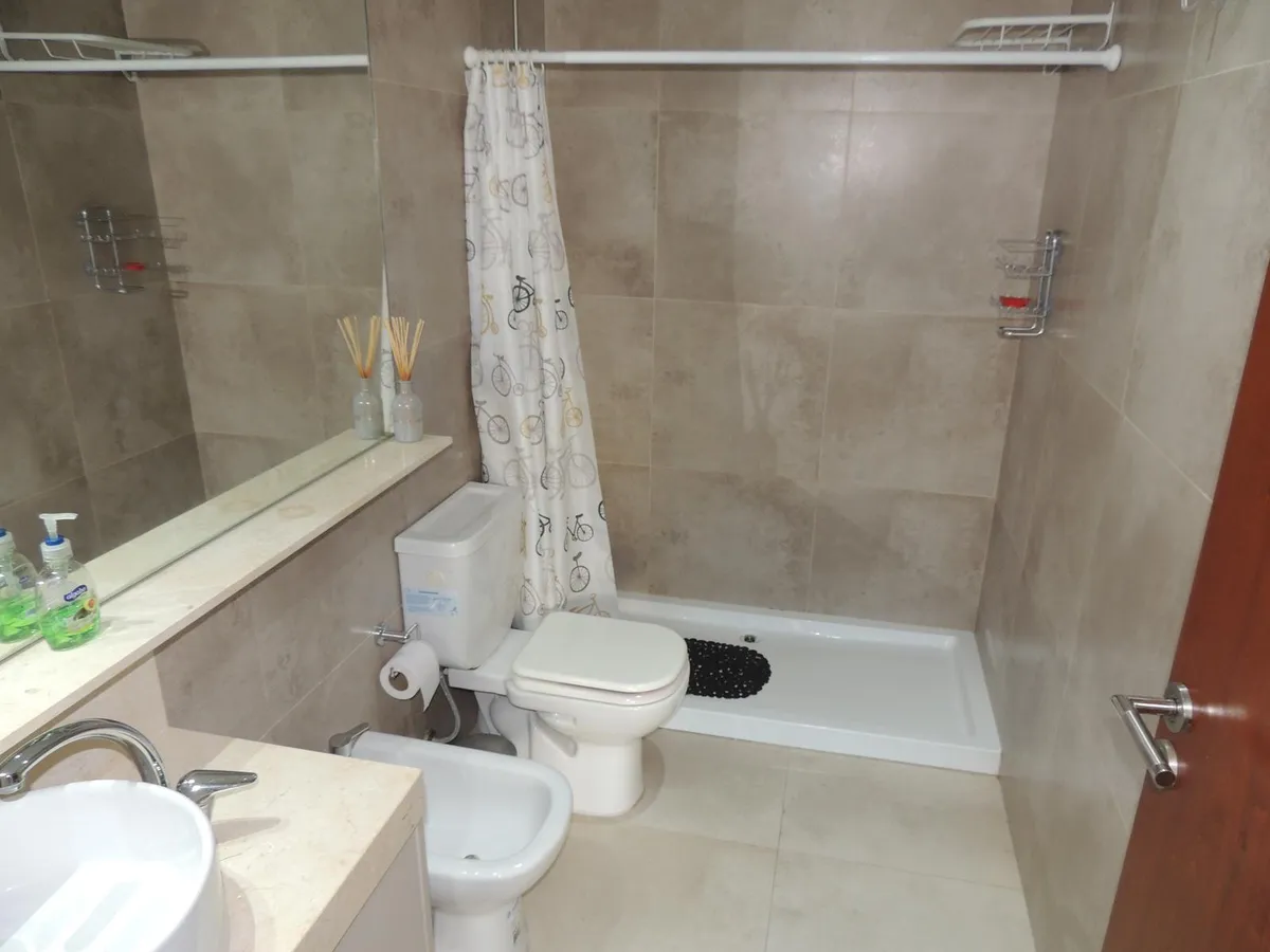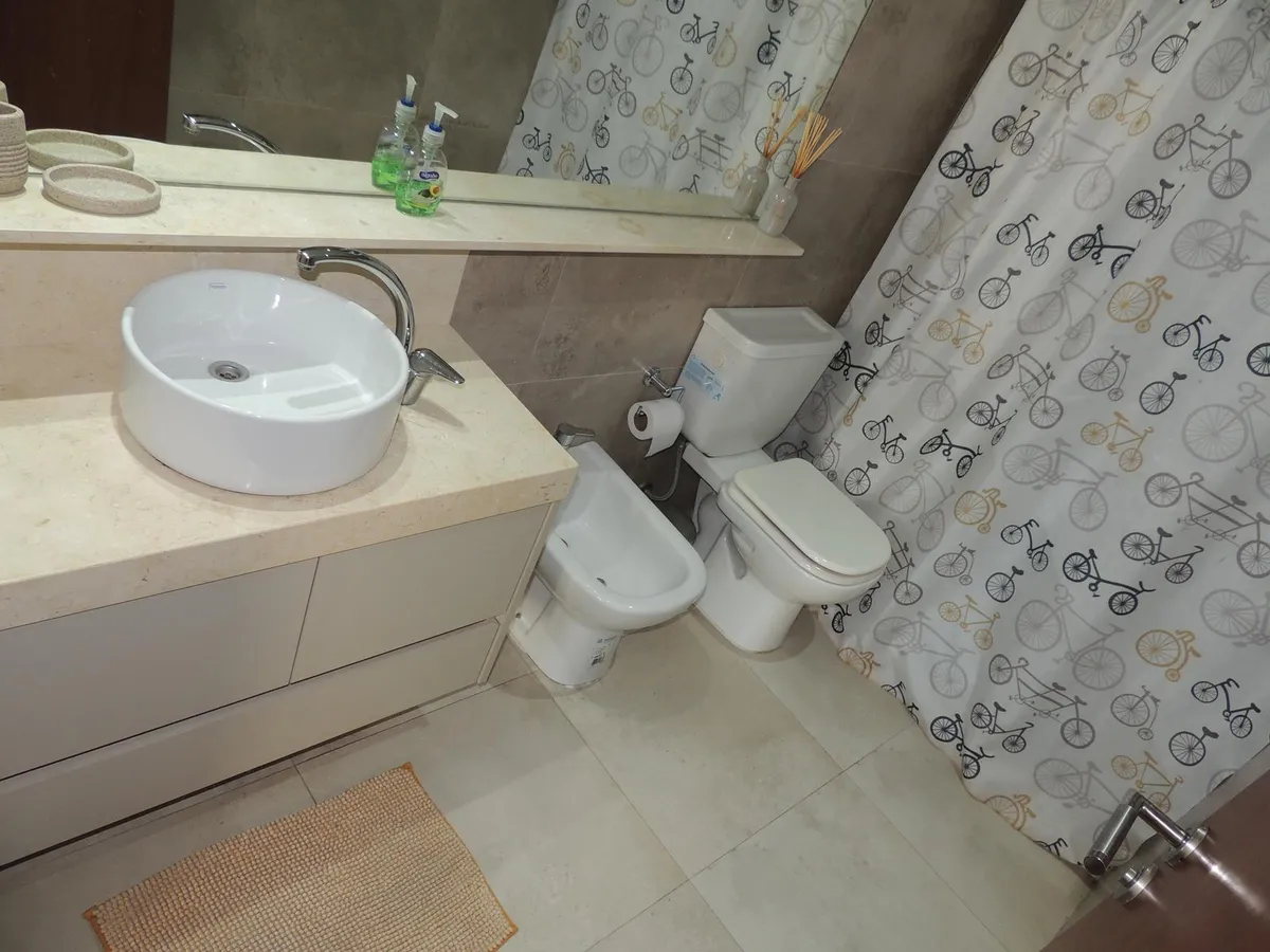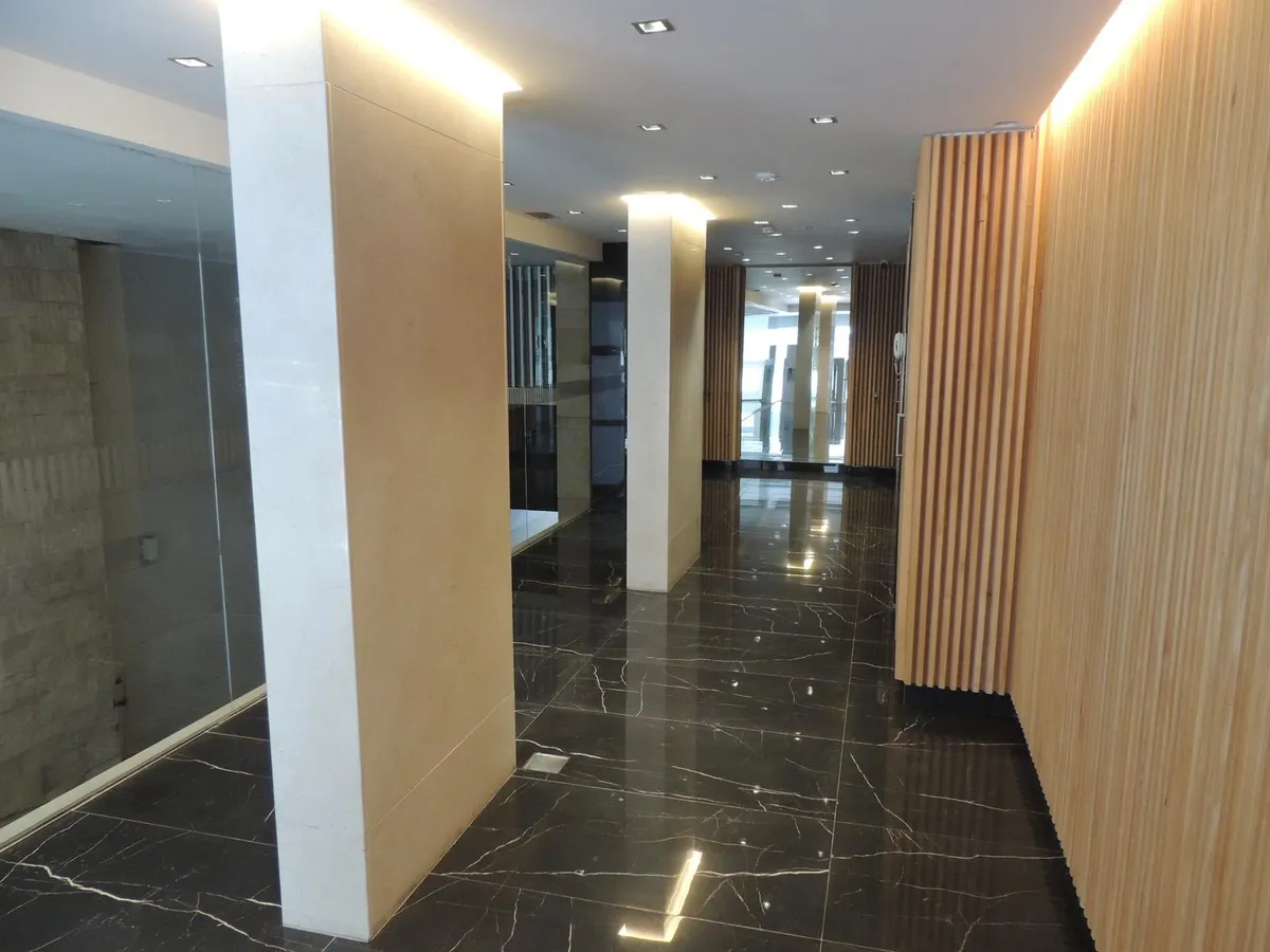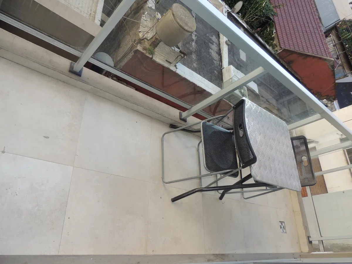 Studio apartment with an integrated kitchen and breakfast bar, plus a balcony, in Recoleta. It is furnished and fully equipped, including an air-conditioning unit (hot/cold), TV, gas cooktop with four burners and oven, and a water purifier. The bathroom is fully appointed and there are central hot-water tanks. Building amenities include an accessible elevator for people with disabilities, a rooftop terrace with a covered BBQ area at the front and a laundry area at the back with washer and dryer