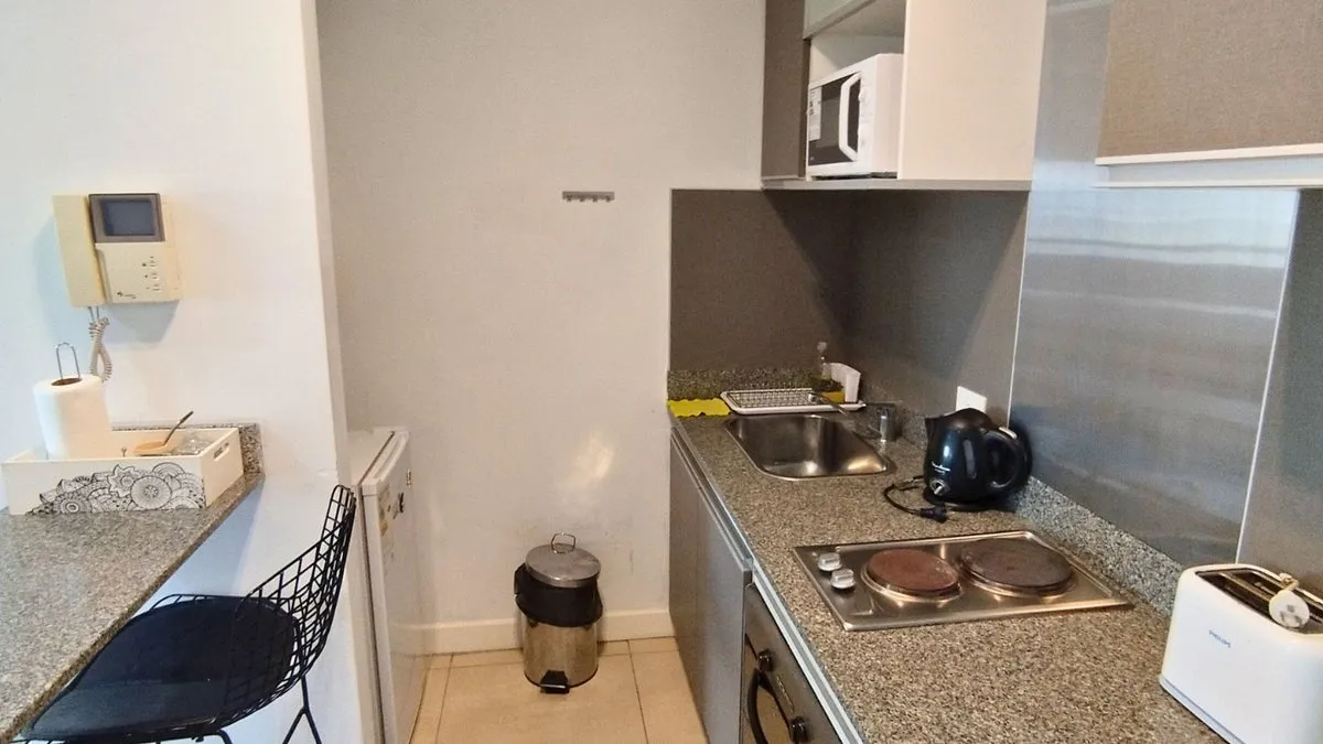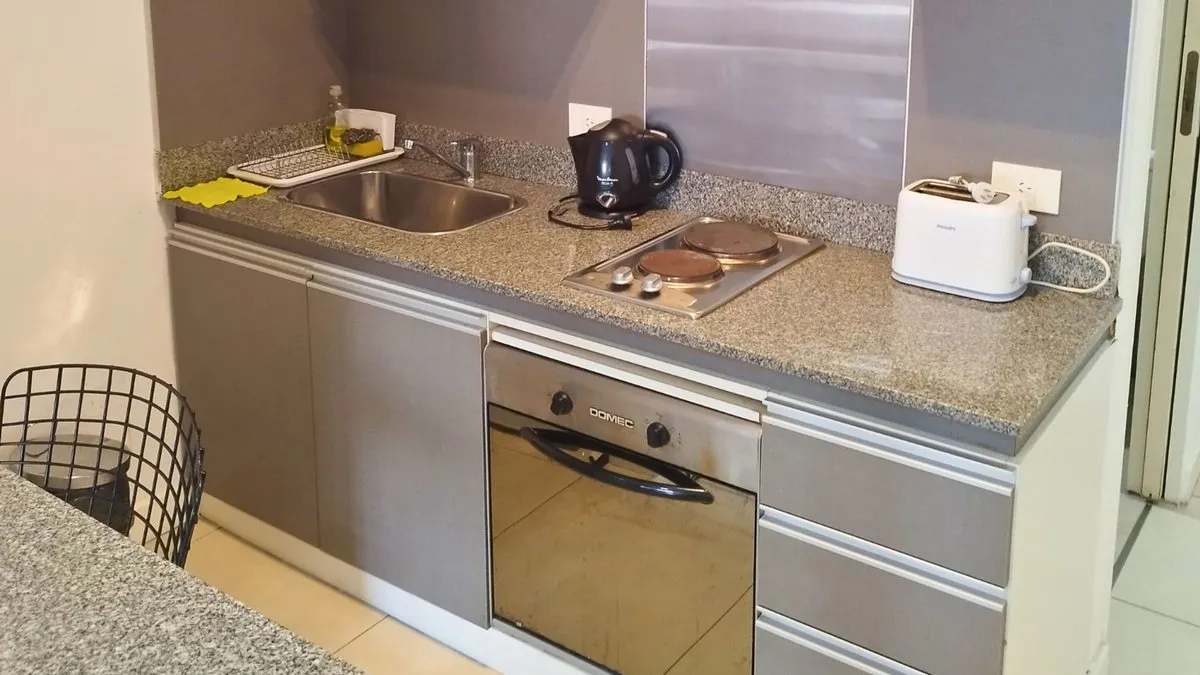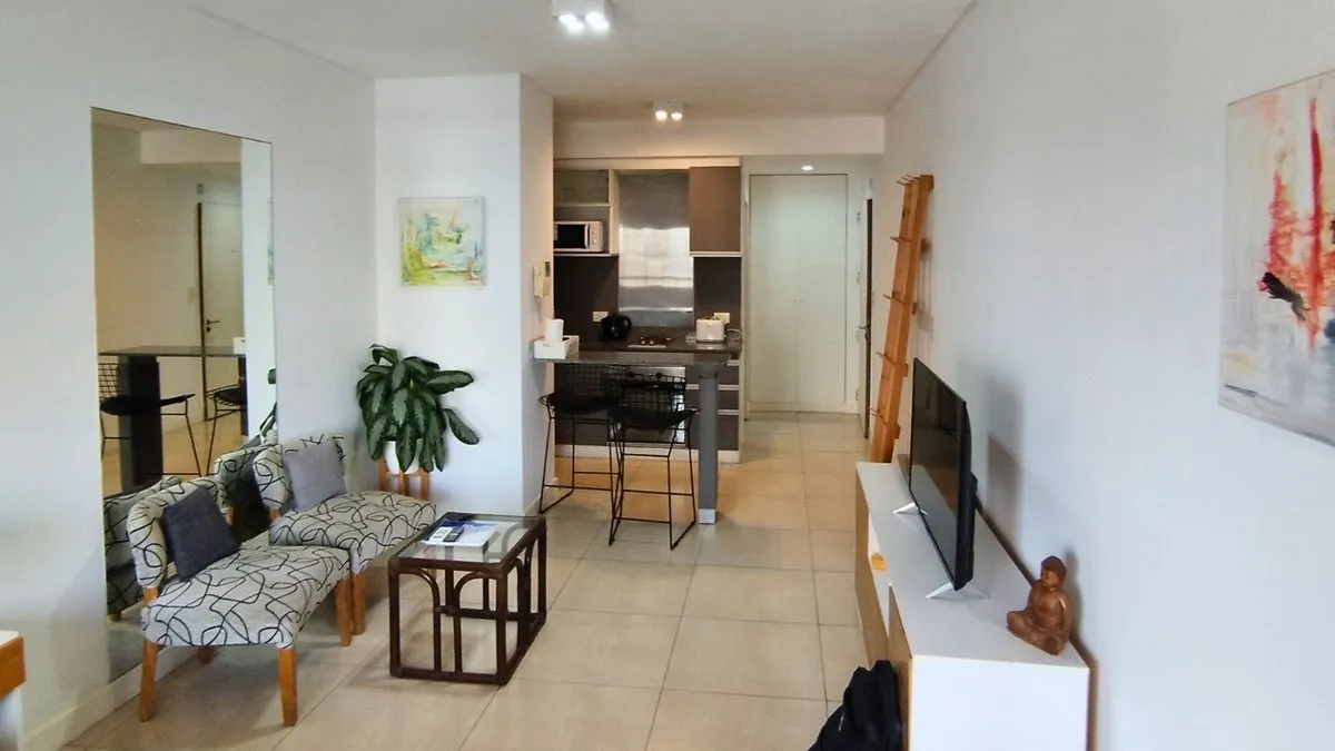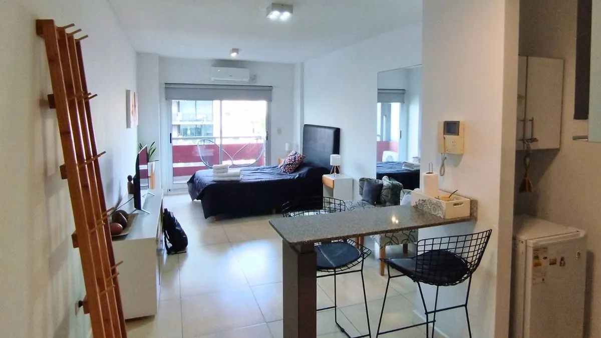 Furnished studio apartment of 31 m² in Saavedra, on Avenida Cabildo, west-facing. The unit is on the 4th floor of a 12-storey building built in 2016, with 28 m² covered and 3 m² semi-covered. It includes a combined living-dining area with an equipped kitchen (fridge, electric oven, microwave, coffee maker, blender, kettle and toaster), a double bed, smart TV, and heating and cooling air conditioning. Building amenities include a laundry area and a SUM on the top floor, and the rent includes an a