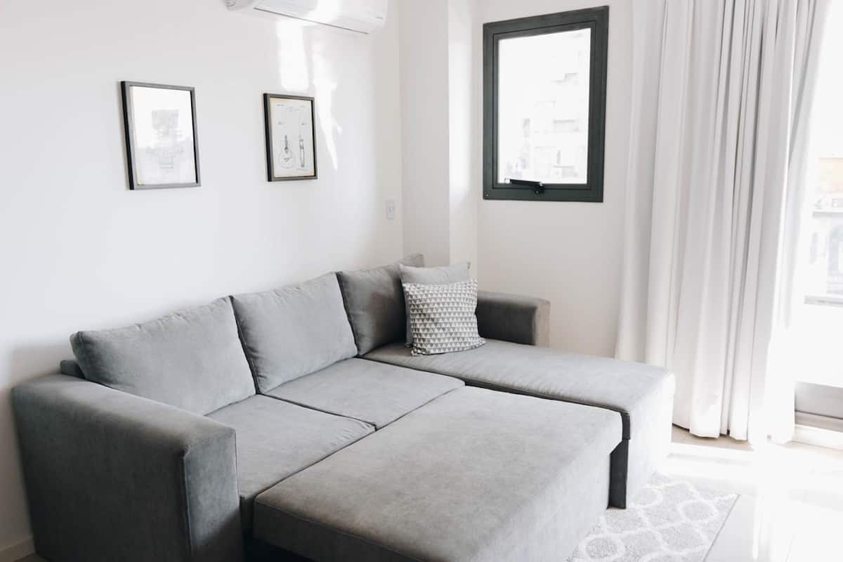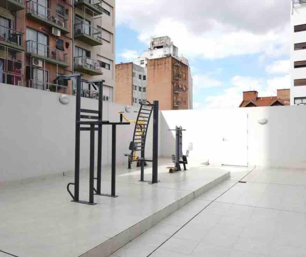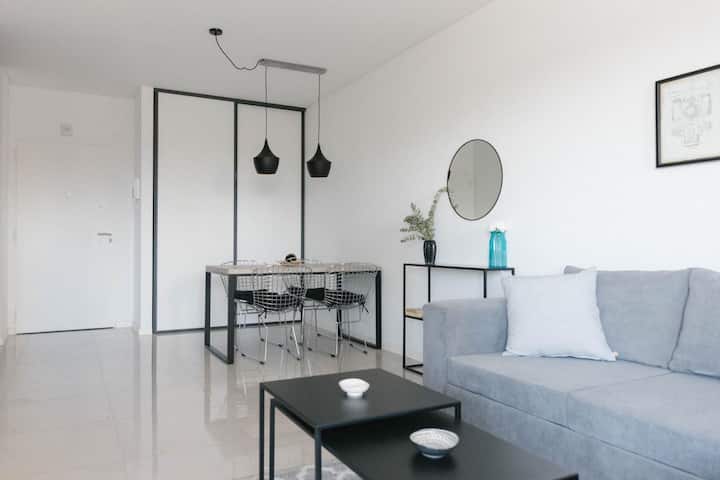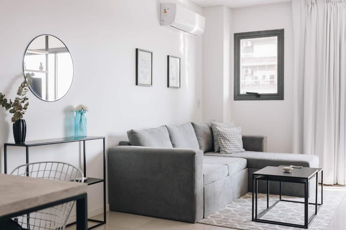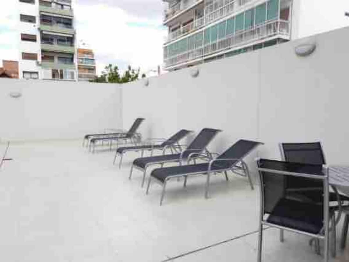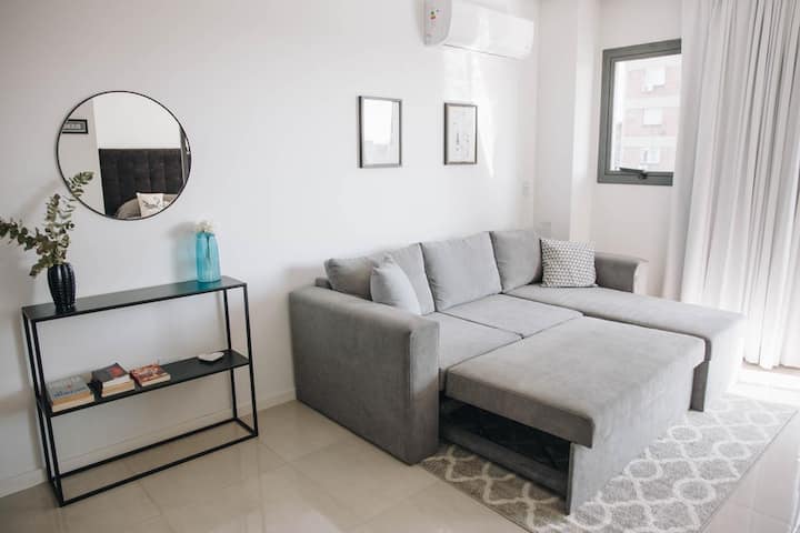 Furnished studio apartment with a balcony. It has air conditioning (cold/heat), HD TV/cable and Wi-Fi, and is equipped for up to 4 people with a two-seater sofa bed and a separate sofa bed for 2. Building amenities include a solarium, gym, grill with prior reservation and an additional cost, a meeting room and a laundry area where wash and dry are available with tokens (additional cost, subject to consultation).