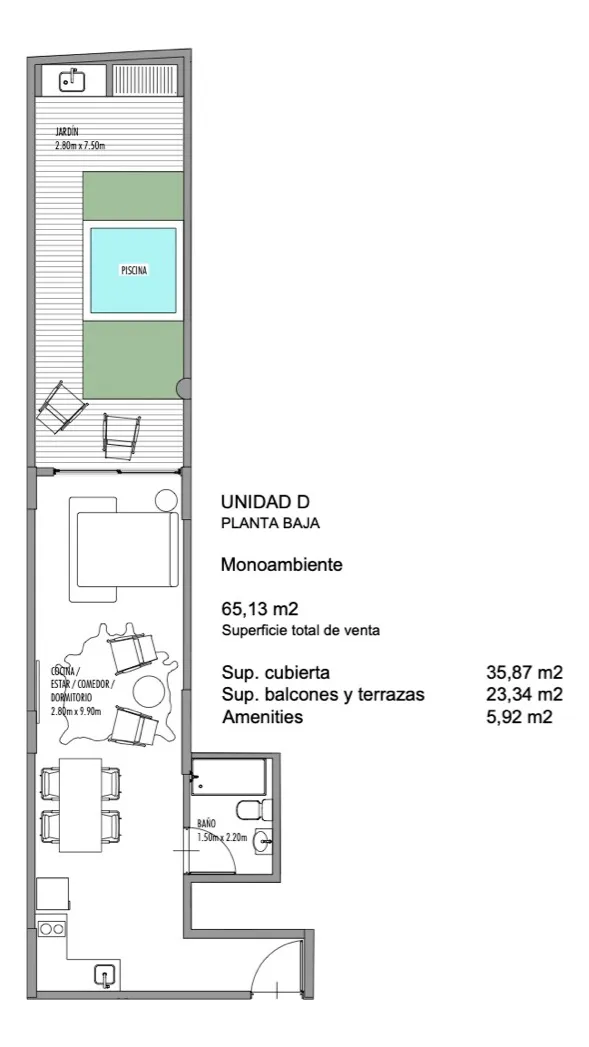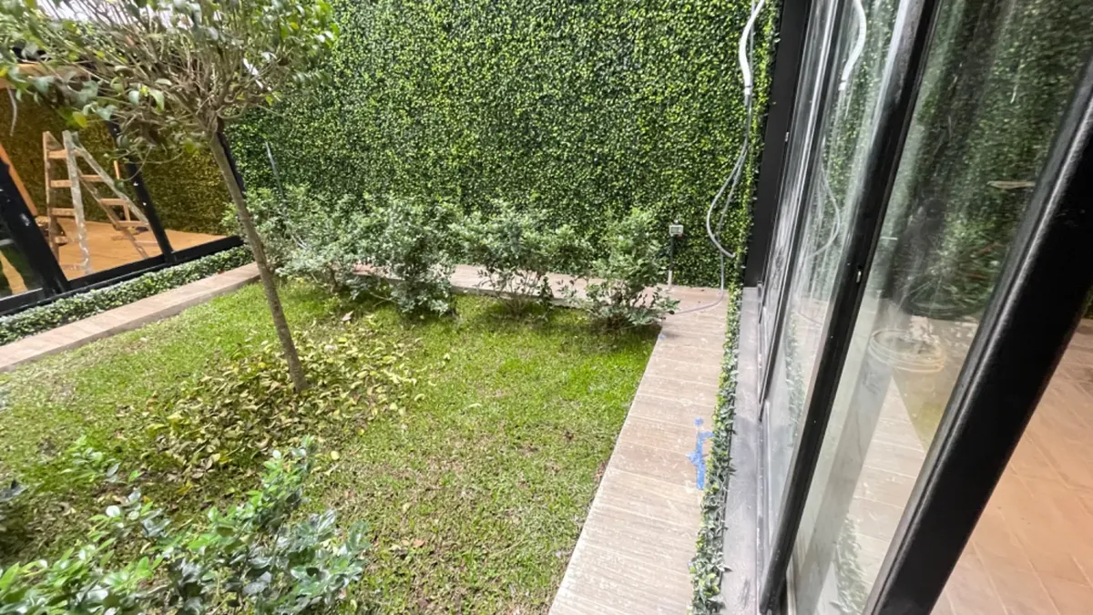 Brand-new studio apartment facing the courtyard, ground floor (PH layout not specified) with private garden. Includes a barbecue grill and a private pool. Option to rent furnished for 6 months.