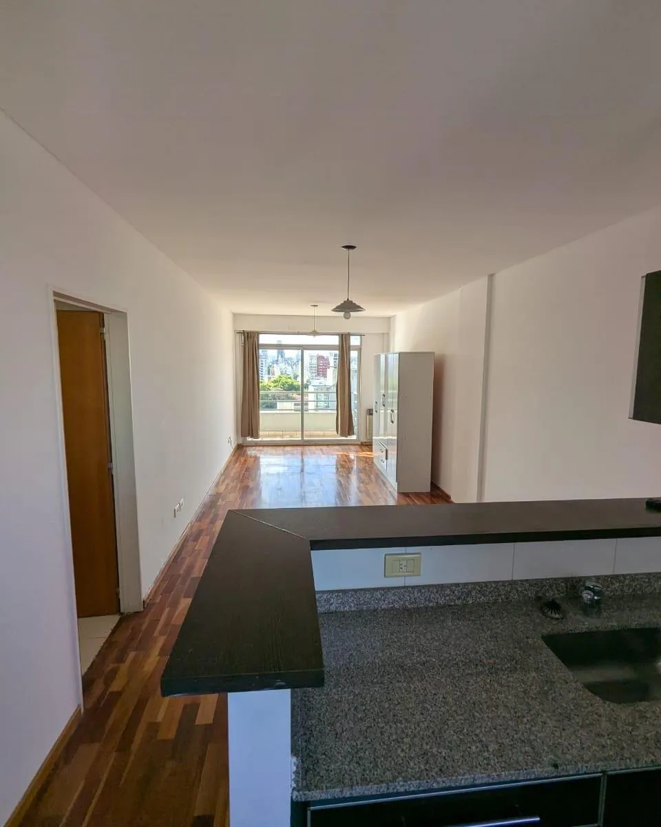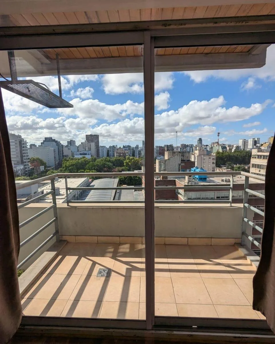 Studio apartment, street-facing on the 10th floor with open views. The building has a pool, a communal room with a grill, a terrace, and a laundry area.