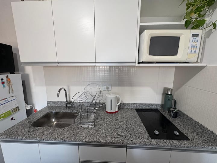 Brand-new studio apartment in a building with two swimming pools, a gym, a co-working space, and a terrace with a grill. The unit includes a double bed and a sofa bed for 2 people, a dining table for 4, and a kitchen with electric burners, an electric oven, and a kettle. It has a large refrigerator with freezer and a full bathroom. Building amenities include security and laundry facilities (extra cost).