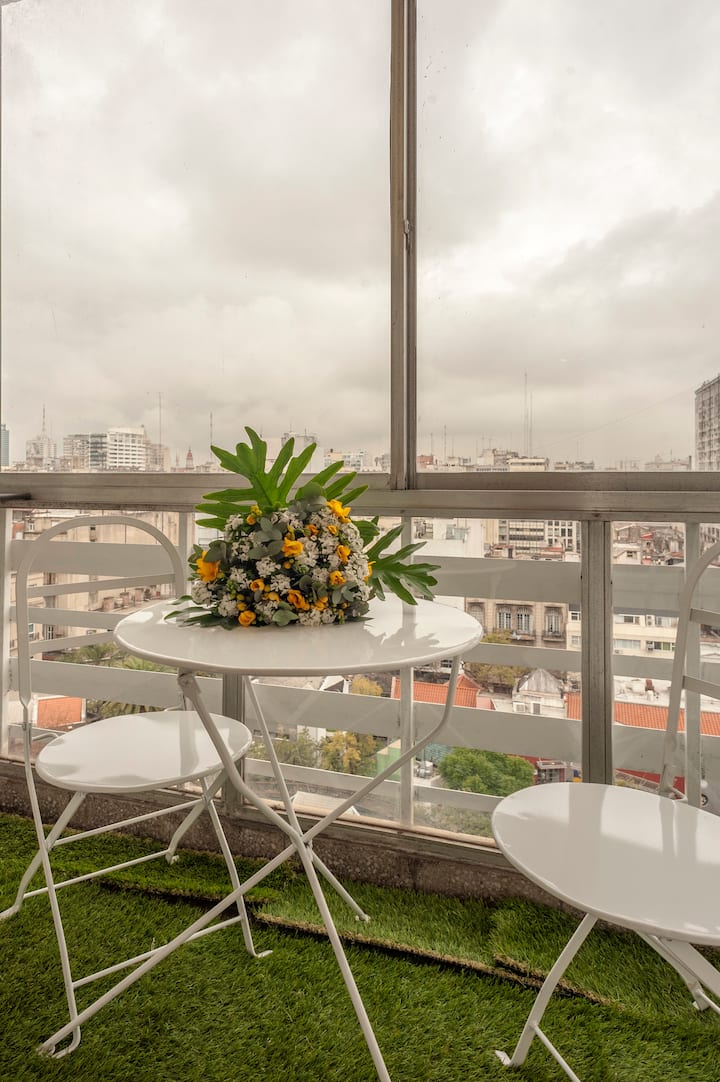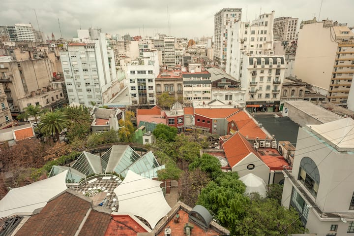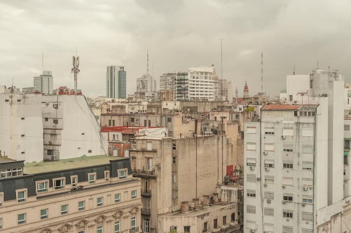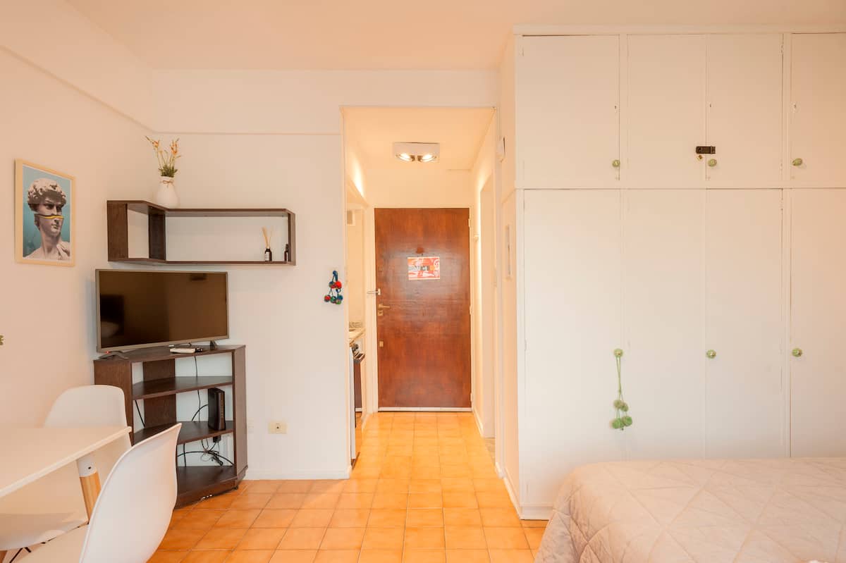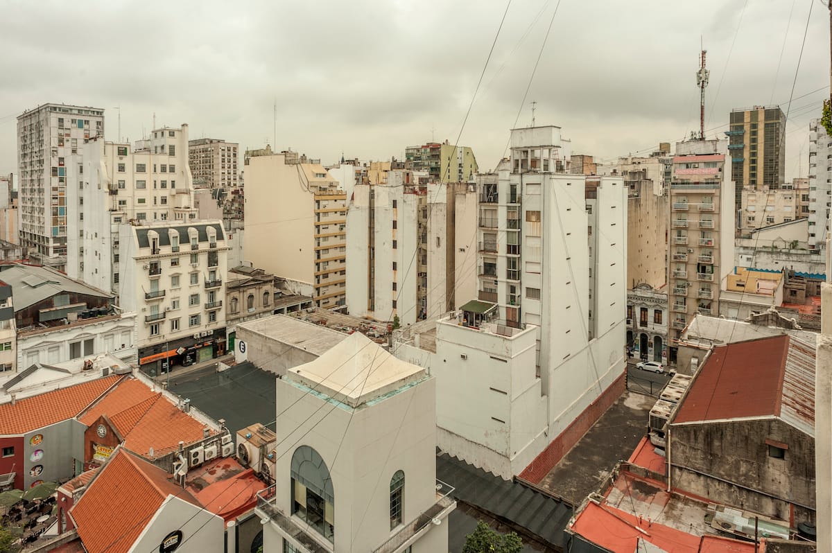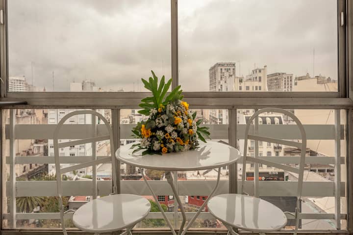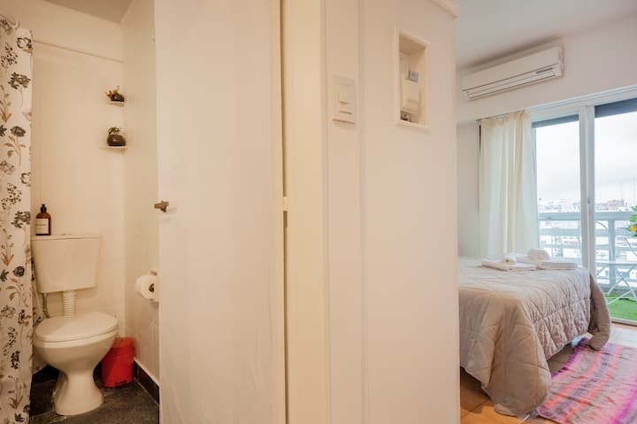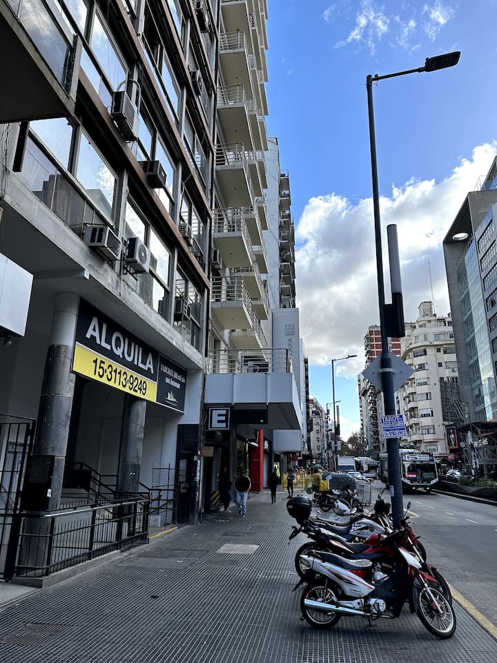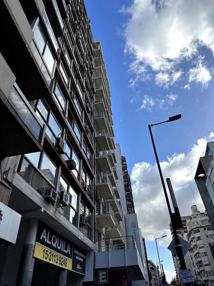 Studio apartment of 30 m² en suite with a balcony, located on a high floor in the Av. Corrientes area. The listing describes quiet surroundings and views from the upper level.