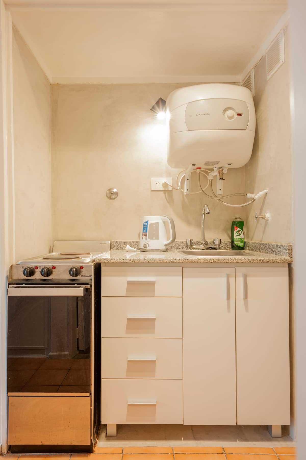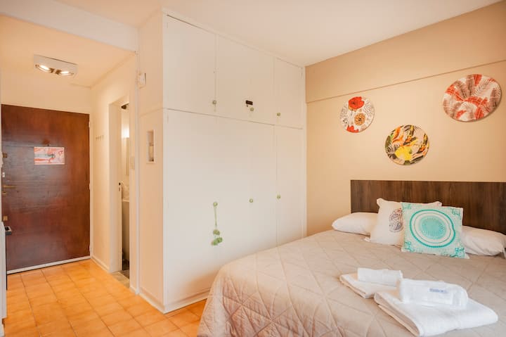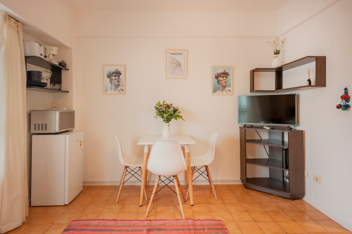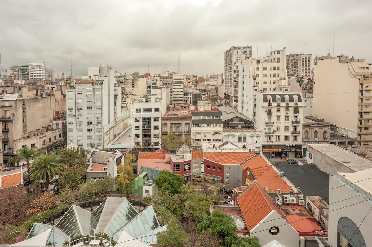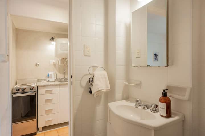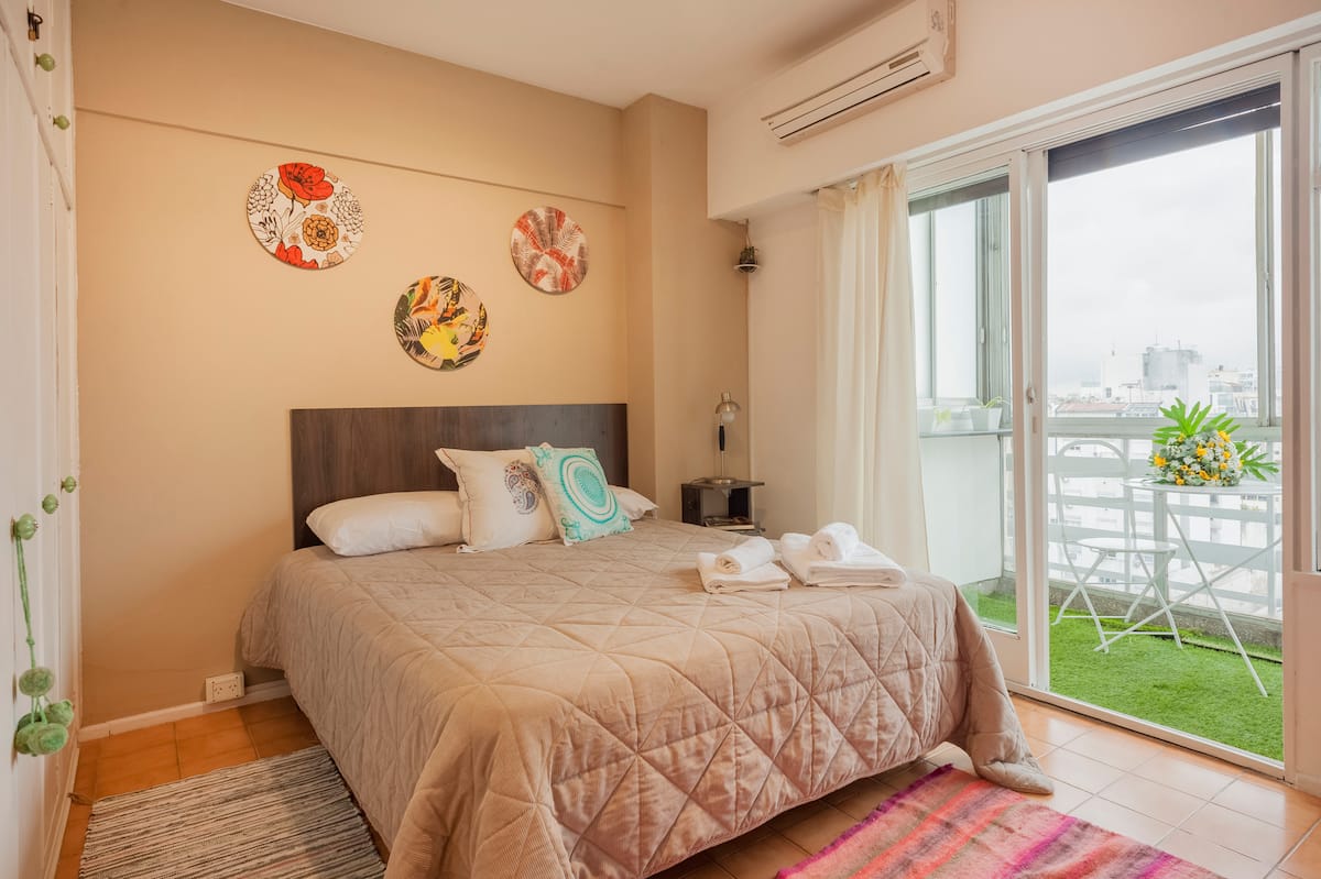 Studio apartment of 30 m² en suite with a balcony, located on a high floor in the Av. Corrientes area. The listing describes quiet surroundings and views from the upper level.