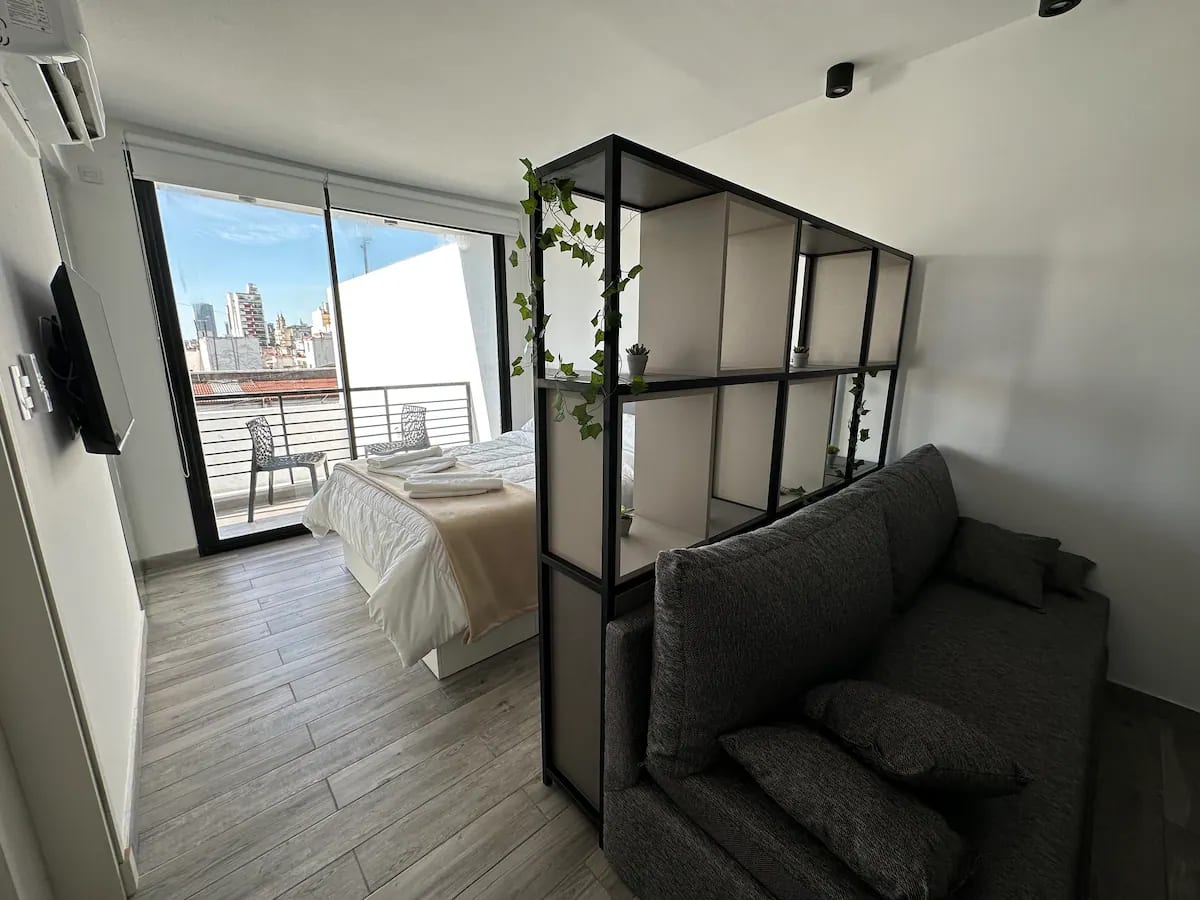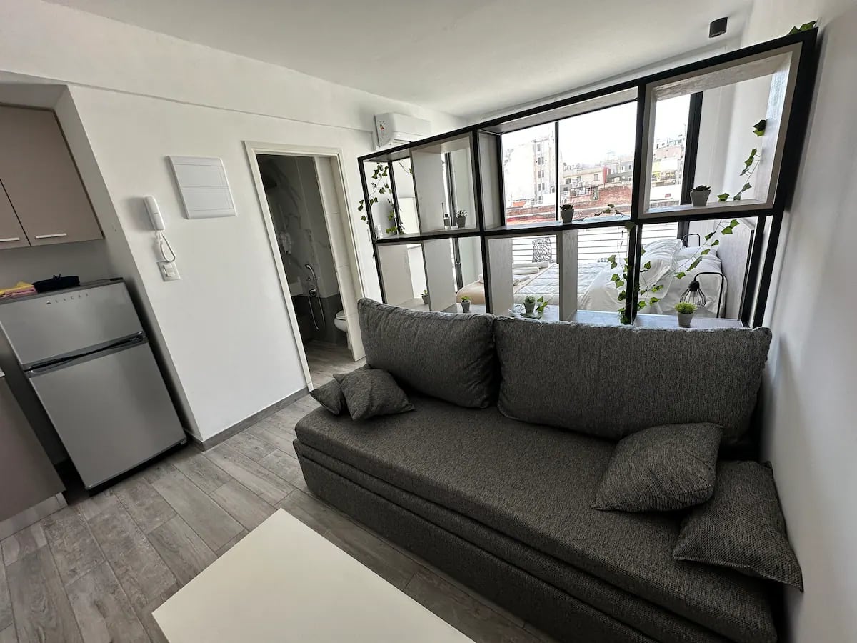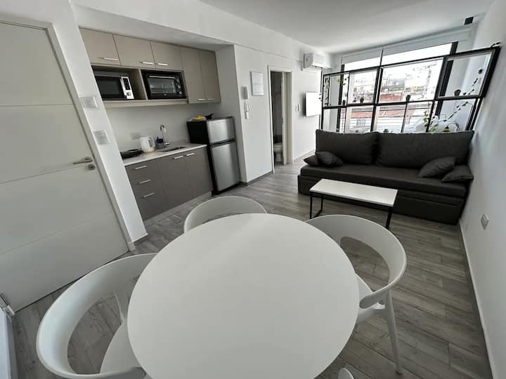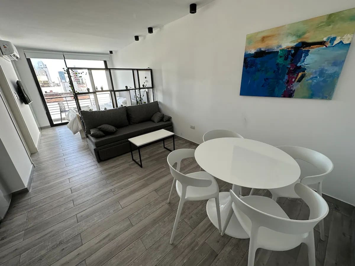 Studio apartment in San Telmo with capacity for 4 guests. Includes a queen-size bed and a sofa bed for 2, cold-heat air conditioning, full crockery, fast Wi-Fi, cable, a Smart TV and a dining table. There is a garage less than half a block away.