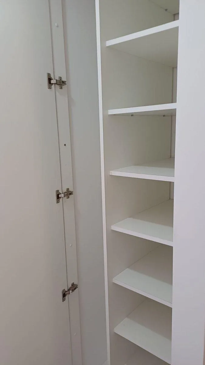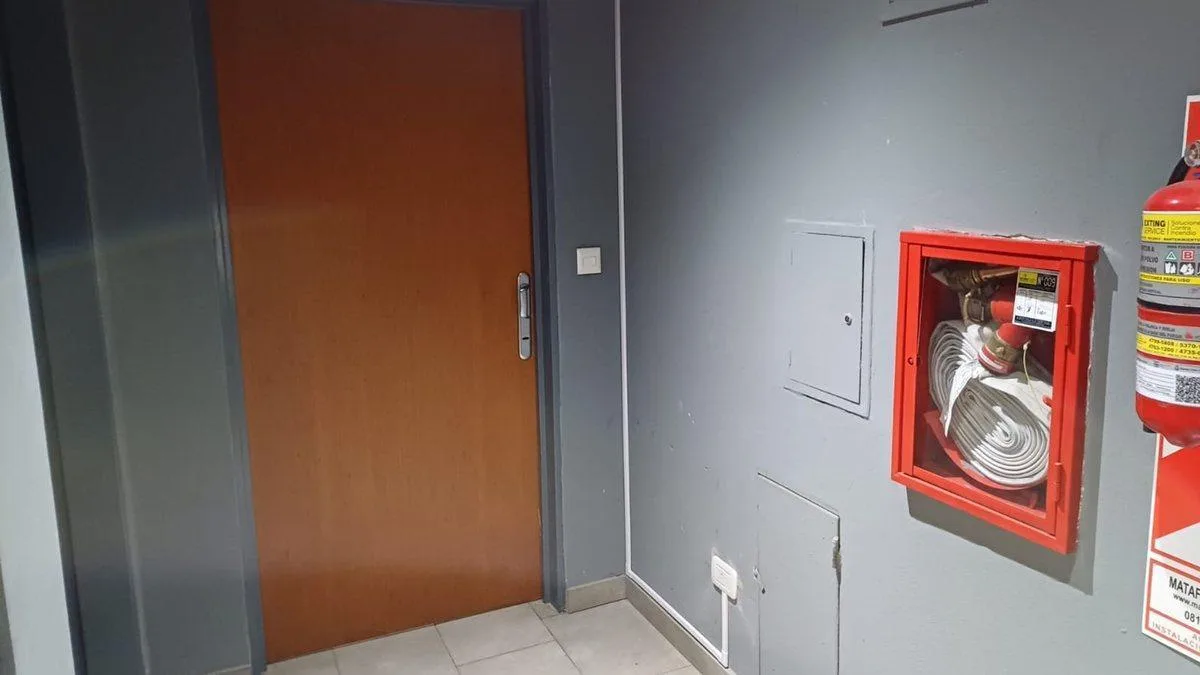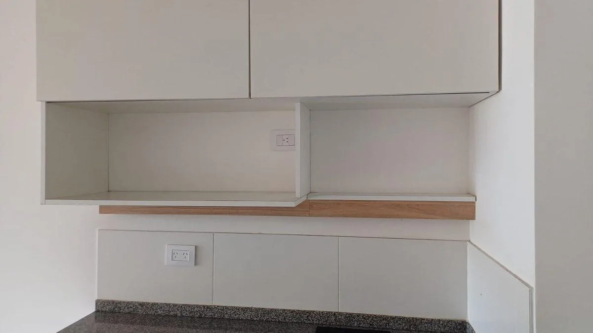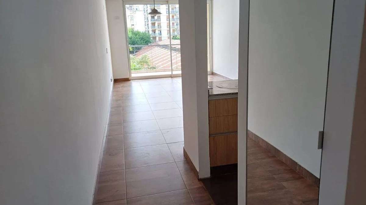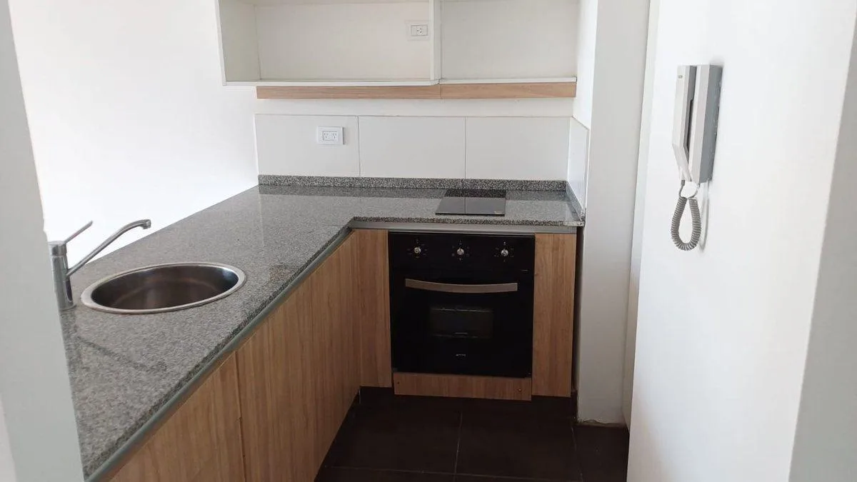 Studio apartment with a counterbalcony terrace, courtyard-facing. The unit is 41 m² total, with an entry hall leading to the main room, which has access to the balcony with an open view. Integrated kitchen with electric oven and vitroceramic hot plate, storage space in upper and lower cabinets, full bathroom, and built-in storage/closets at the entrance. The building has a caretaker, with a grill area on the terrace.