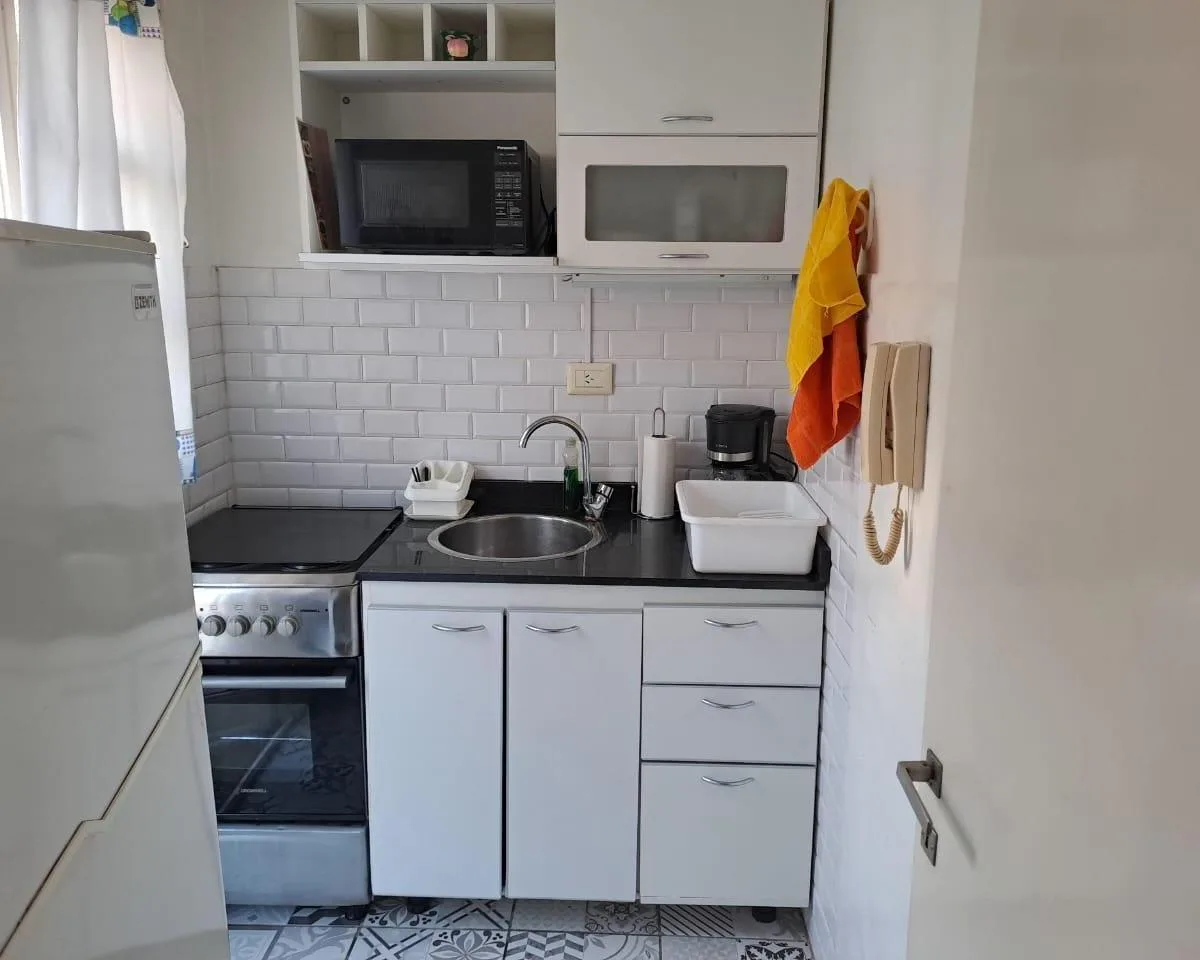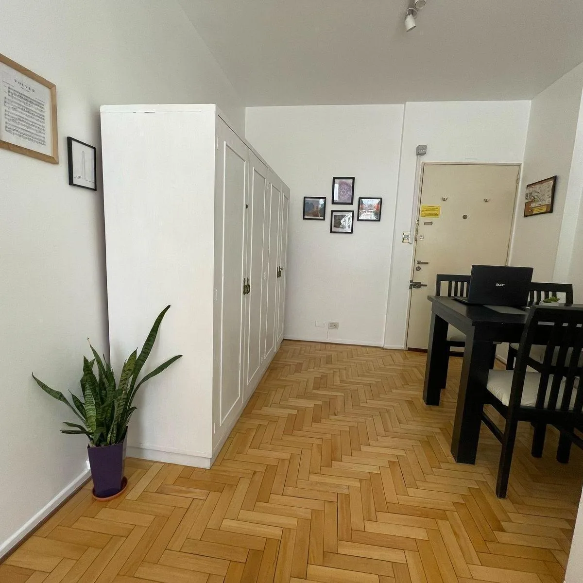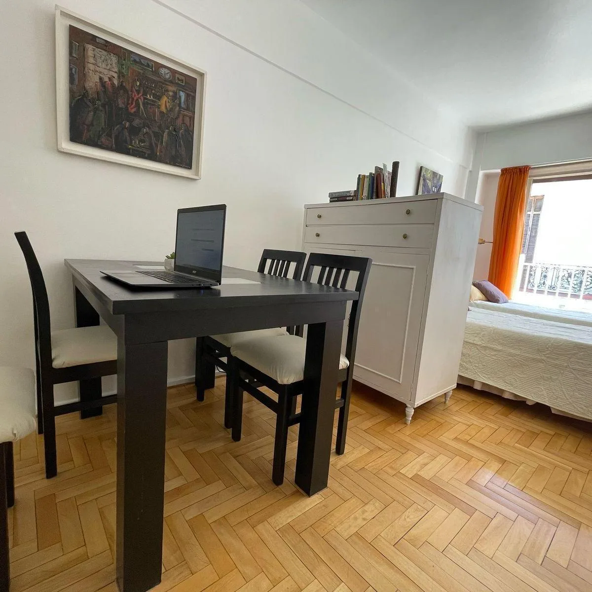Studio apartment in San Telmo. It has a balcony with a laundry trough, a fully equipped kitchen (electric cooking appliances, coffee maker, toaster, microwave, cookware and a full set of dishes), and two single beds that can be joined to form a double bed. It also includes TV antenna, air conditioning (hot and cold), and high-speed internet. The listing states that building services are not included in the monthly amount; an additional ARS 220,000 is charged monthly and adjusted at move-in.