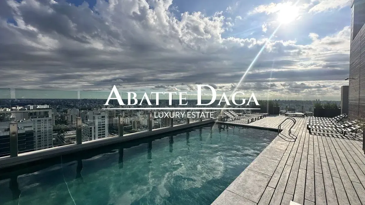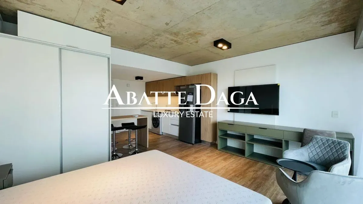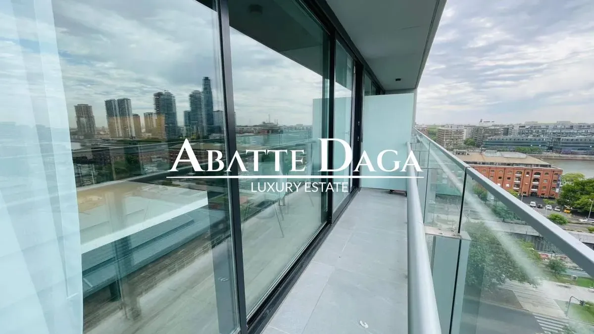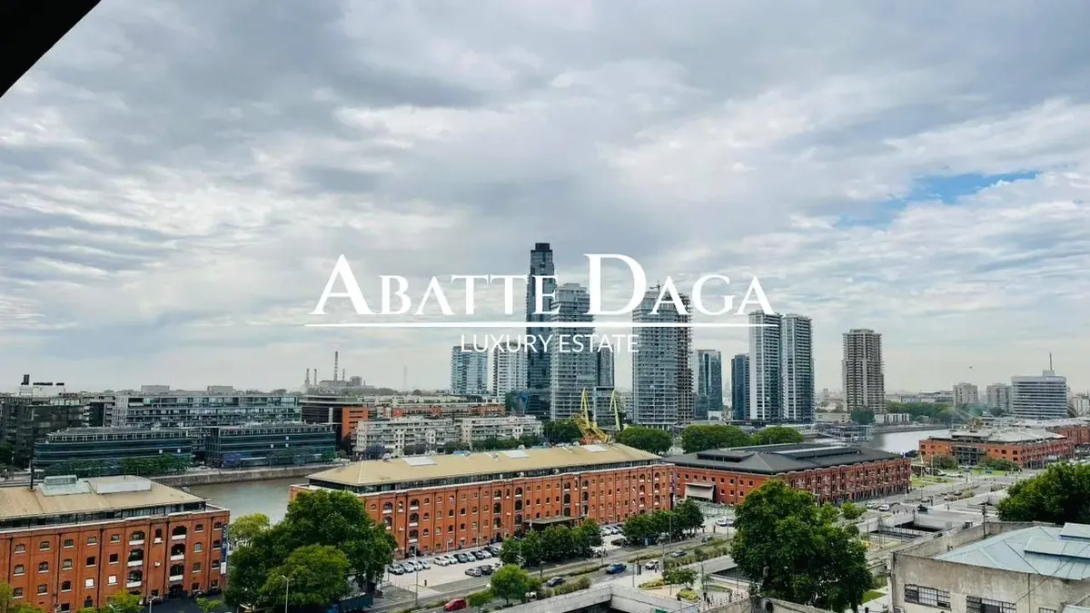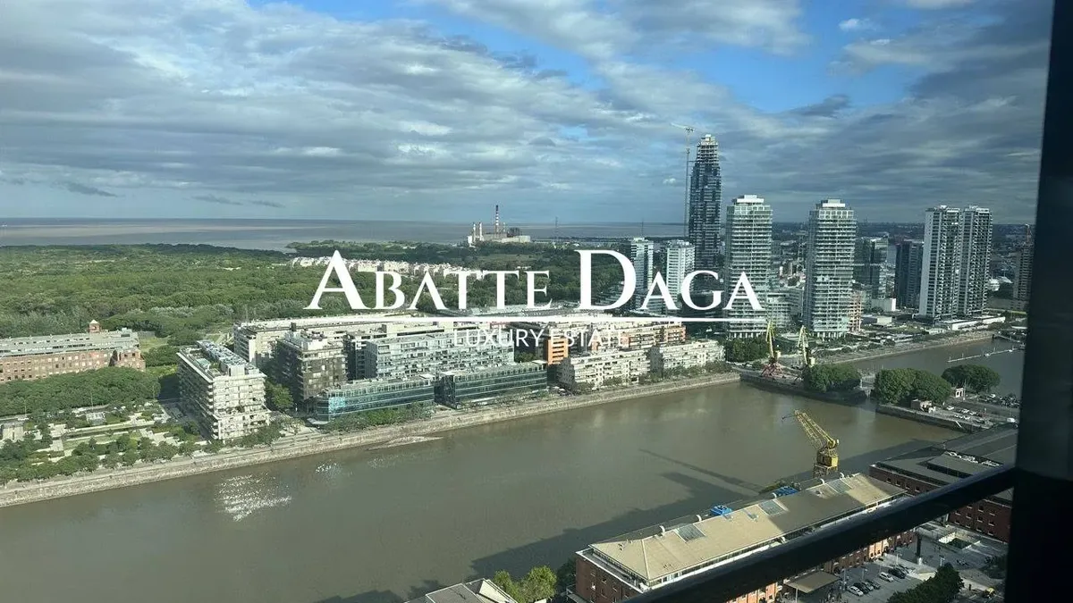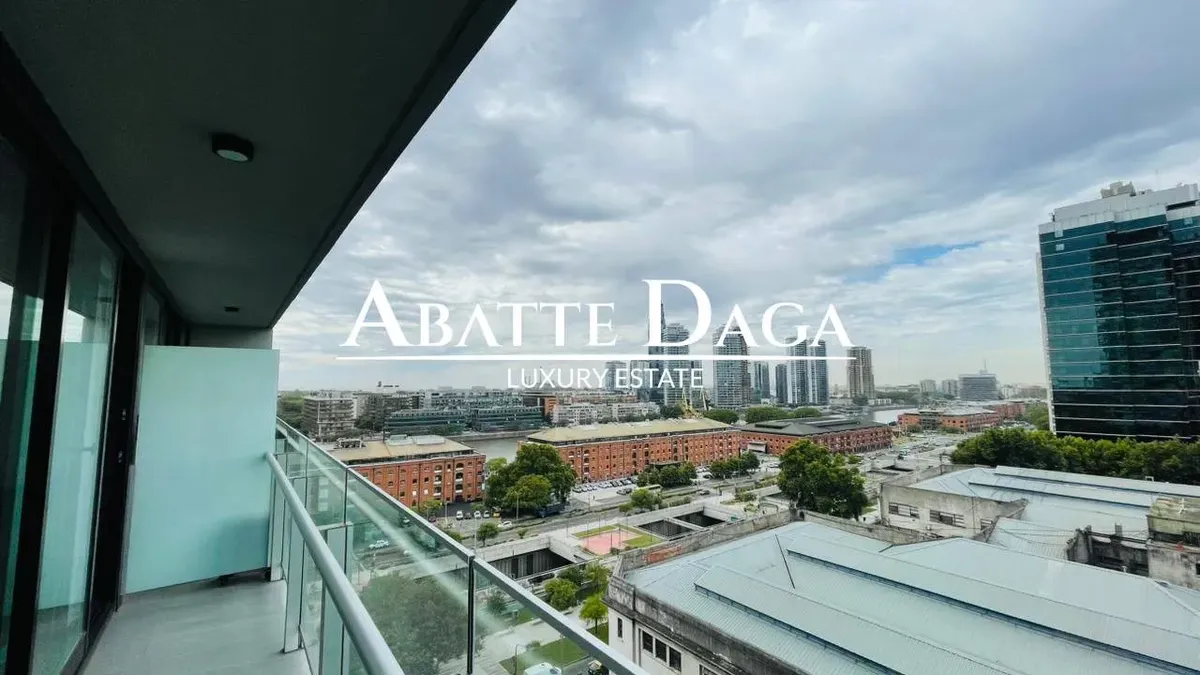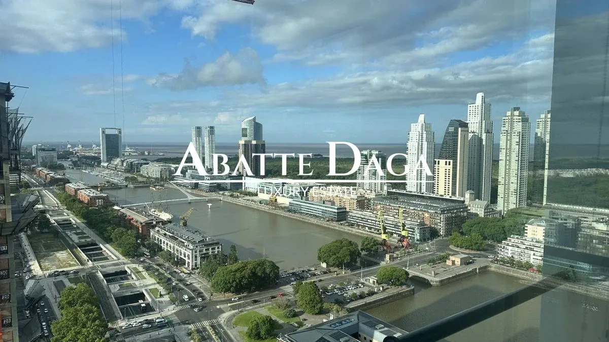 Furnished studio apartment in Quartier del Bajo, Puerto Madero, with a balcony and panoramic city and Puerto Madero views. The unit includes a fully equipped kitchen with electric hob, fridge and washing machine, an additional dining table for 4, and a bathroom with shower and storage. Bedroom area has a king-size bed, built-in wardrobe, Smart TV with desk unit, and air conditioning (hot and cold), black-out curtains, and electronic lock access. The building offers an outdoor heated pool, SUM, g