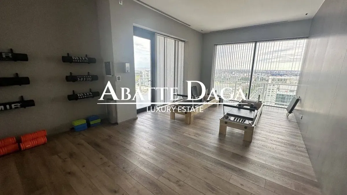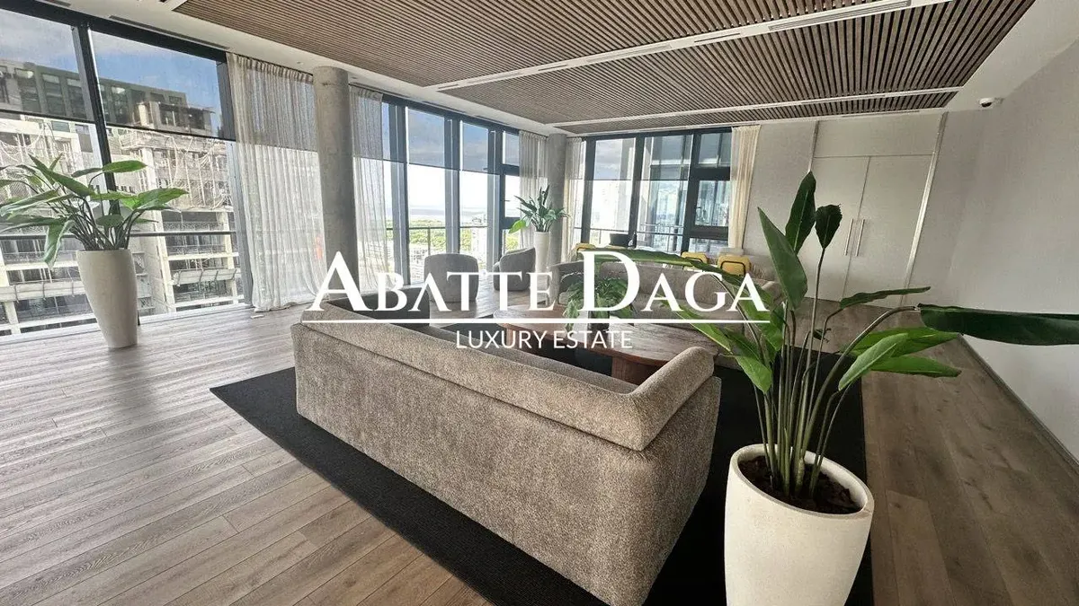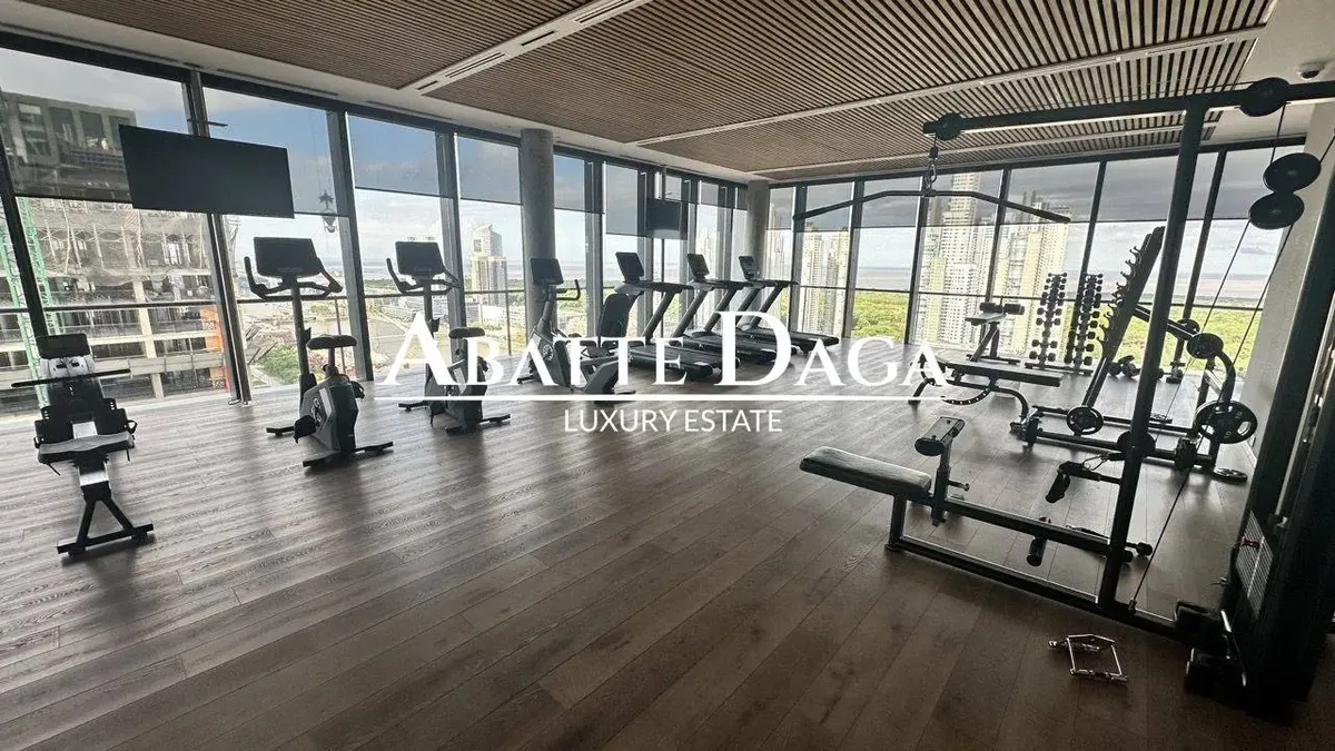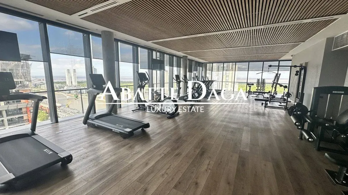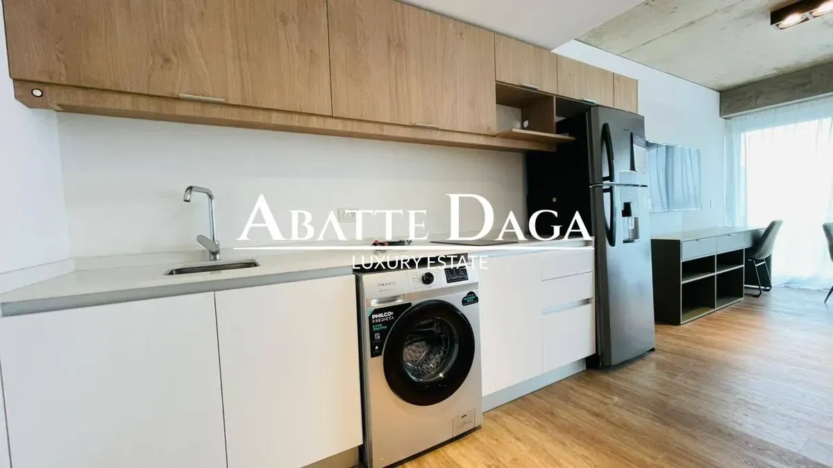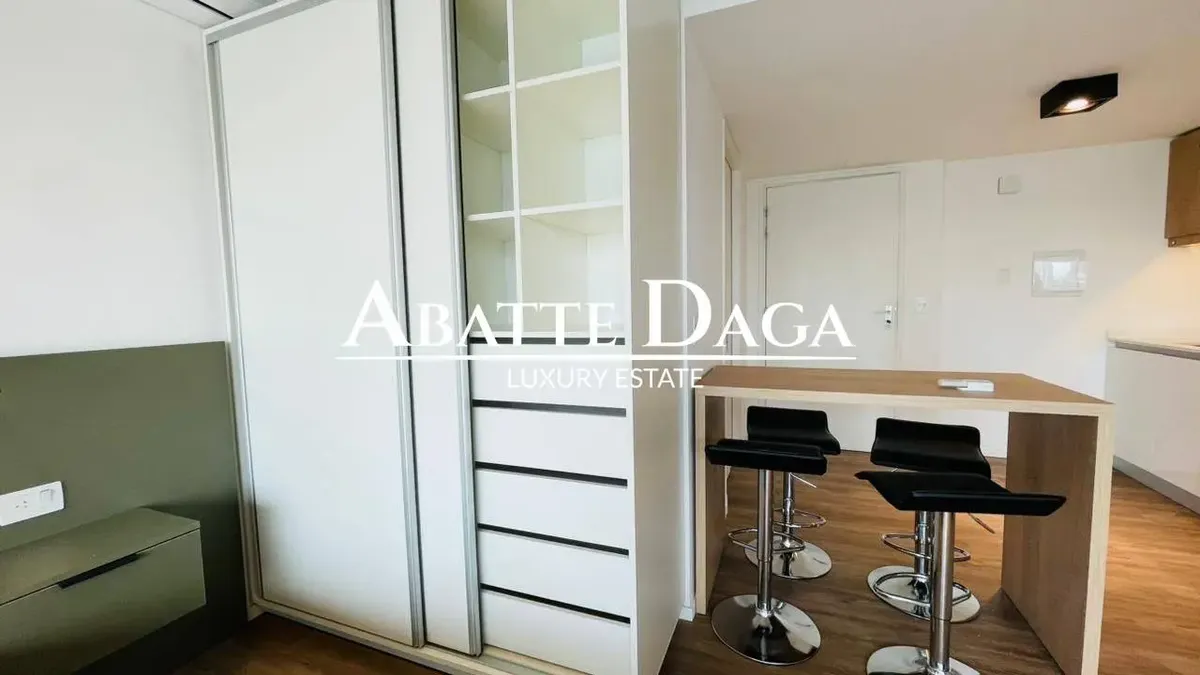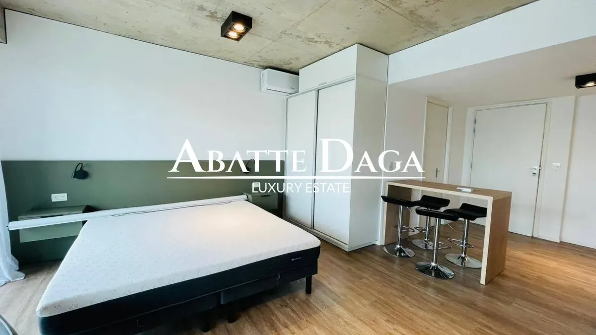Furnished studio apartment in Quartier del Bajo, Puerto Madero, with a balcony and panoramic city and Puerto Madero views. The unit includes a fully equipped kitchen with electric hob, fridge and washing machine, an additional dining table for 4, and a bathroom with shower and storage. Bedroom area has a king-size bed, built-in wardrobe, Smart TV with desk unit, and air conditioning (hot and cold), black-out curtains, and electronic lock access. The building offers an outdoor heated pool, SUM, g