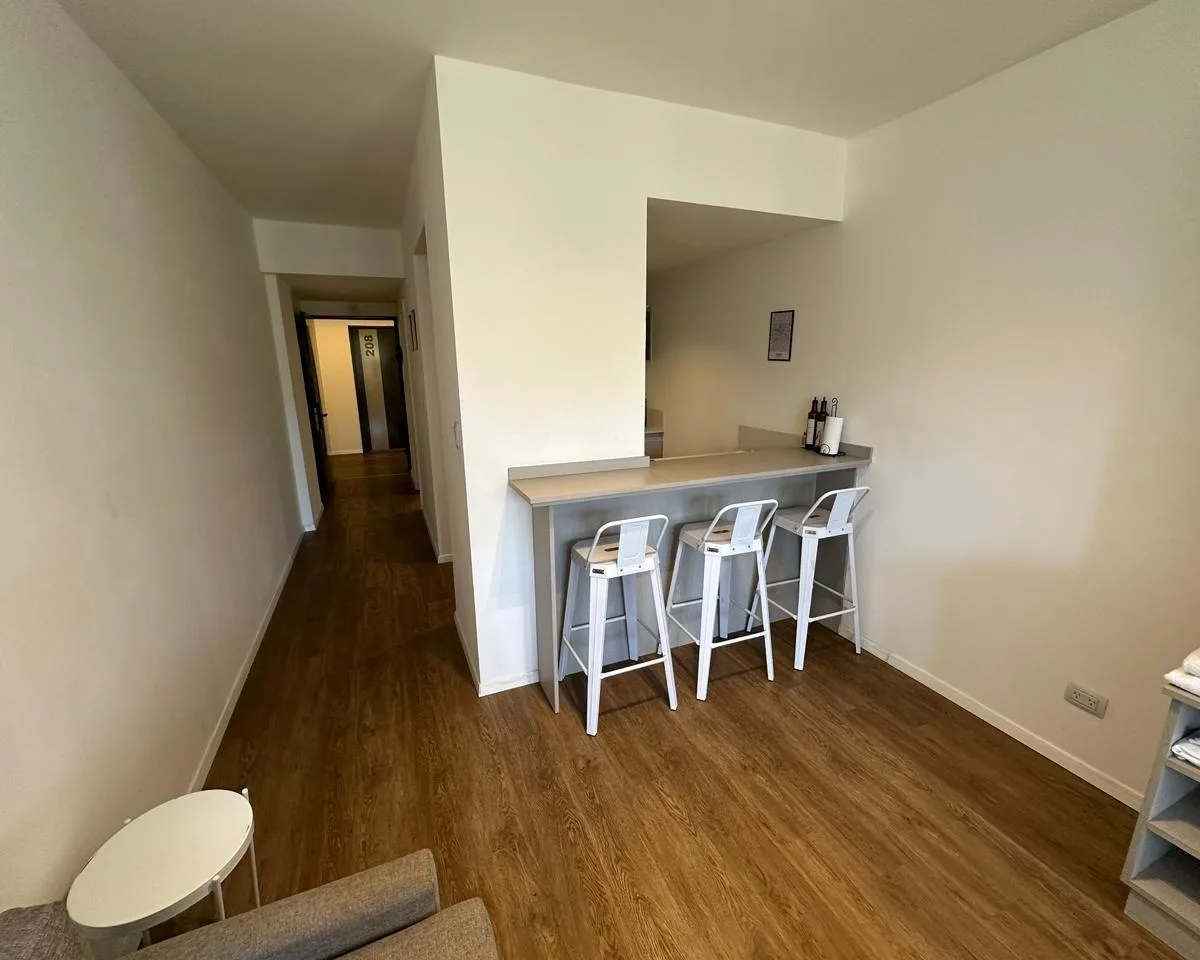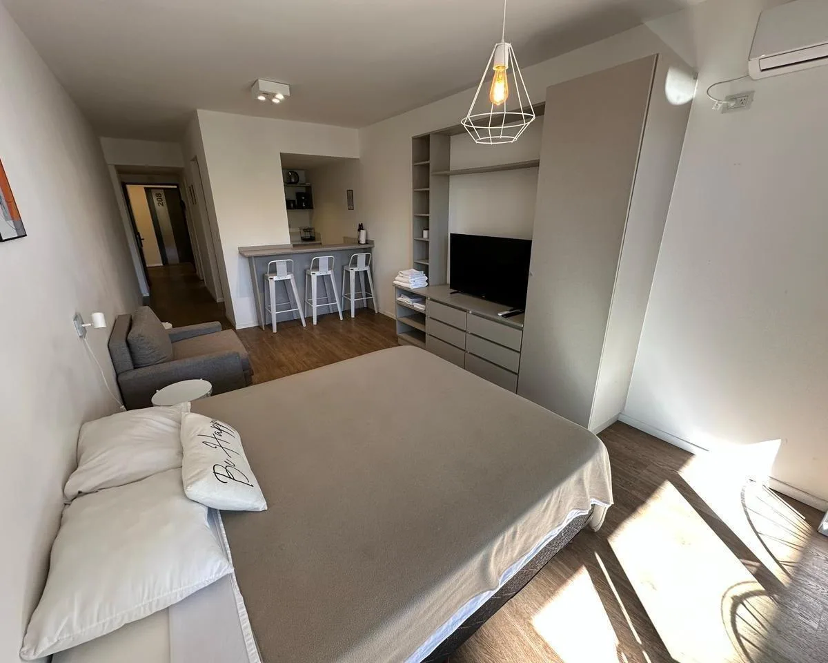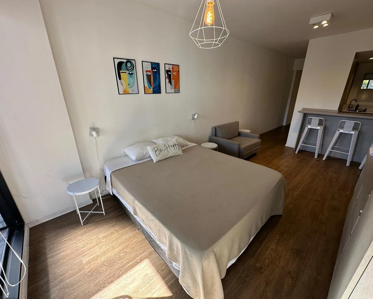 Studio apartment for short-term rental in San Telmo. 38 m² covered, street-facing, furnished, with individual air conditioning. Equipped kitchen and a living-dining area, plus a balcony. Building amenities include a gym, hot tub, sauna, solarium, grill area, communal room (SUM) and a pool. Price is USD 770 plus building fees of ARS 160,000 and services.