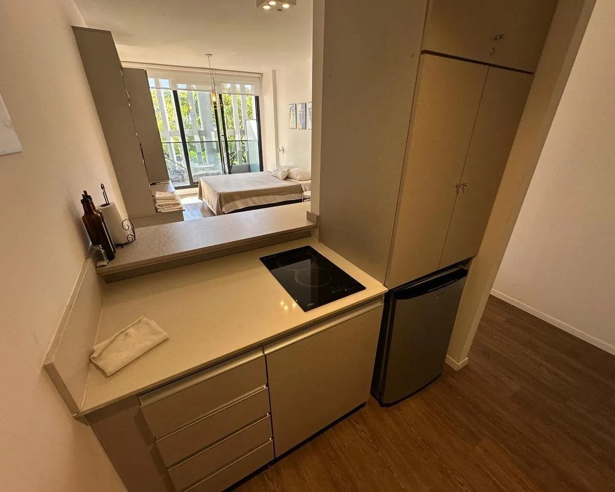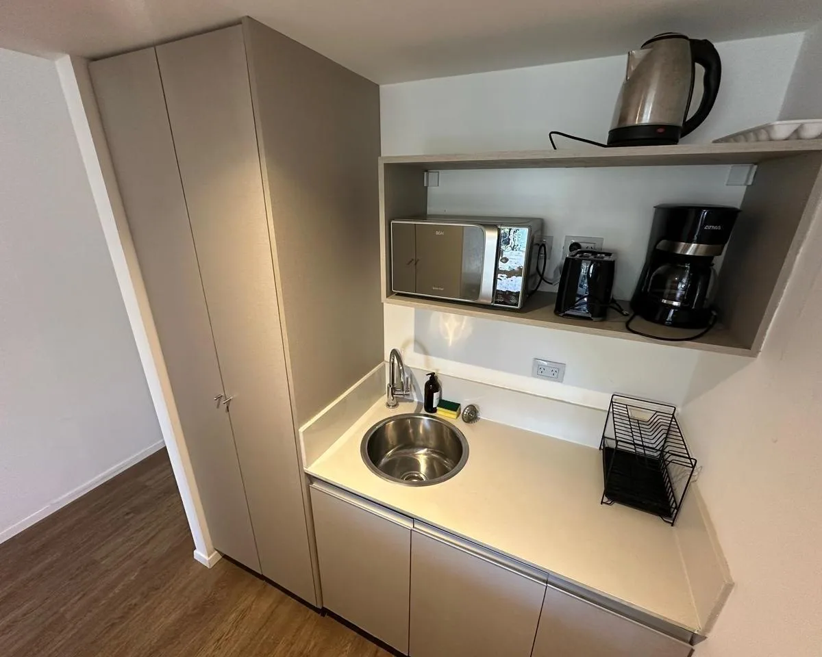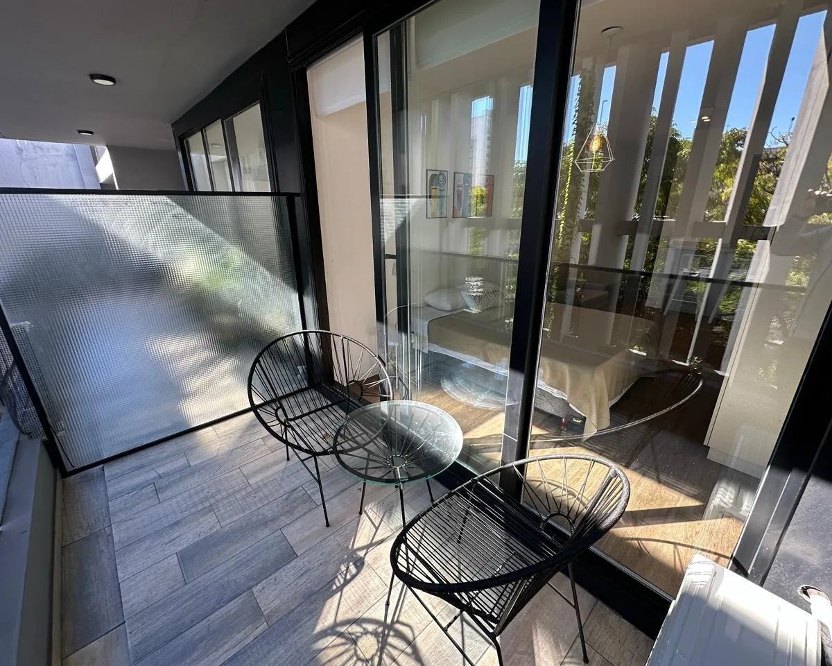 Studio apartment for short-term rental in San Telmo. 38 m² covered, street-facing, furnished, with individual air conditioning. Equipped kitchen and a living-dining area, plus a balcony. Building amenities include a gym, hot tub, sauna, solarium, grill area, communal room (SUM) and a pool. Price is USD 770 plus building fees of ARS 160,000 and services.
