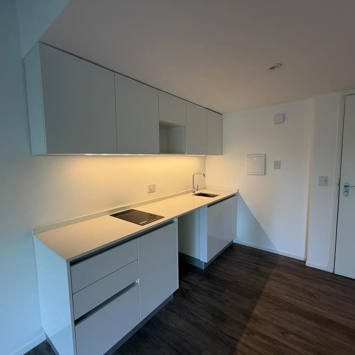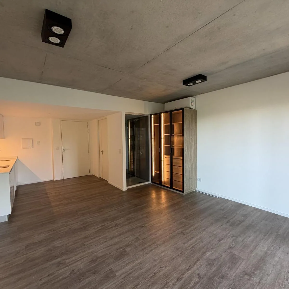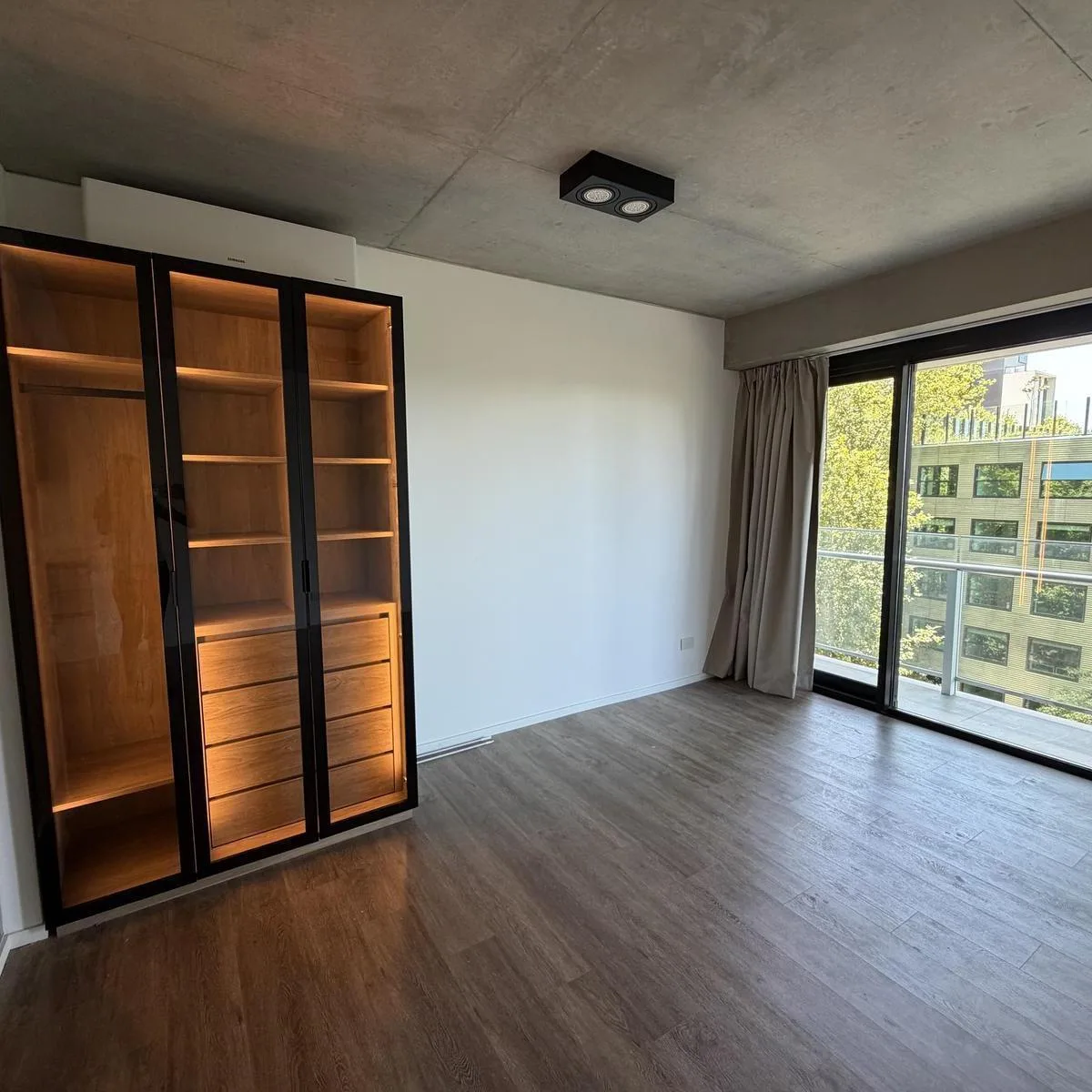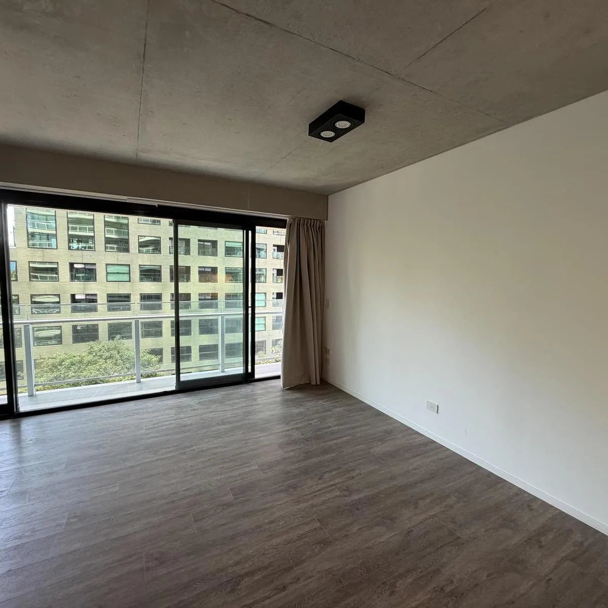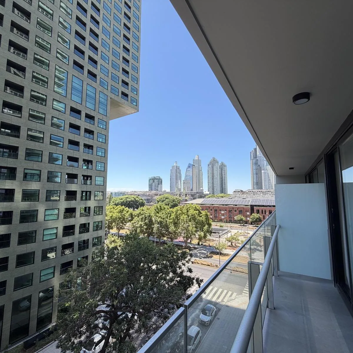 Studio apartment with a balcony and open city view in Quartier del Bajo, Puerto Madero, on an intermediate floor in Torre Ciudad. Integrated kitchen with electric hotplate, one full bathroom, built-in wardrobe, full vanity, and countertop microwave oven; lighting and curtains are installed. Building amenities include an outdoor pool, heated pool, residents' communal room, grills, fully equipped gym, sauna, massage rooms, hydromassage area, laundry and 24-hour security; the complex is described a