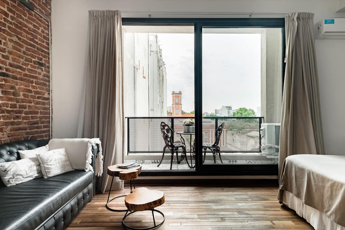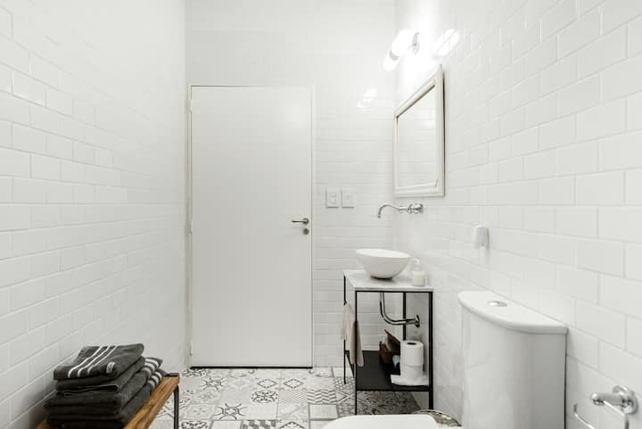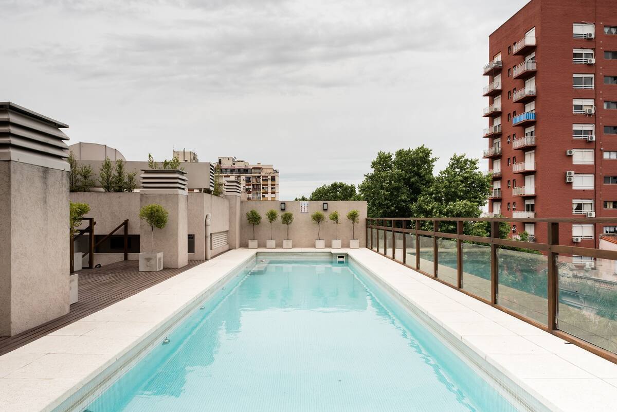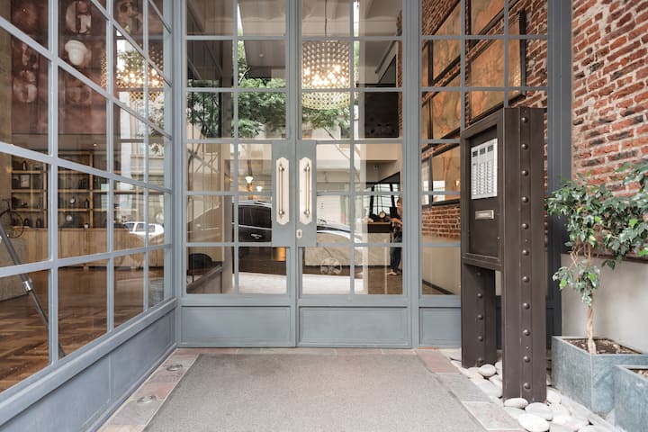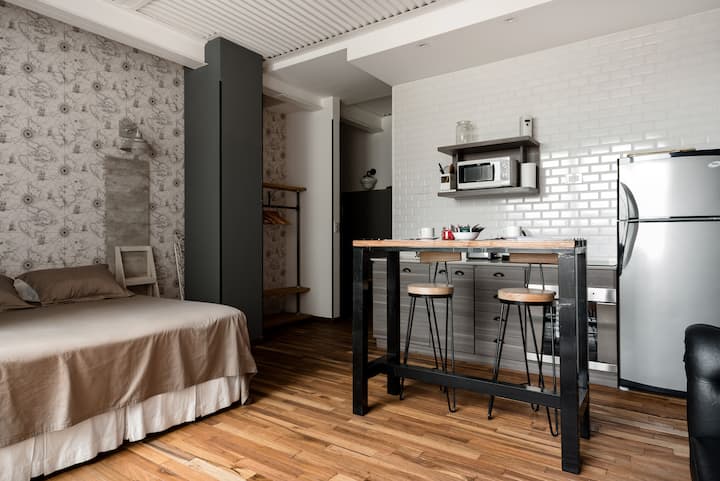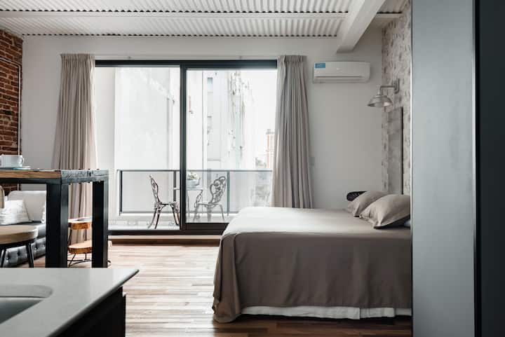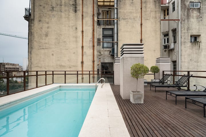 Studio apartment in a new building on Boulevard Caseros, in San Telmo. Fully furnished; an X-Queen bed can be converted into 2 single beds, with a sofa that allows for accommodation of a child, and a baby crib available if needed. The apartment includes WiFi and cable. The building has a terrace grill area, an outdoor pool and a laundry room.