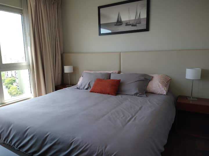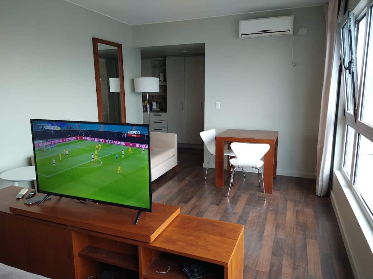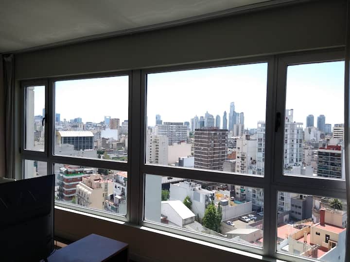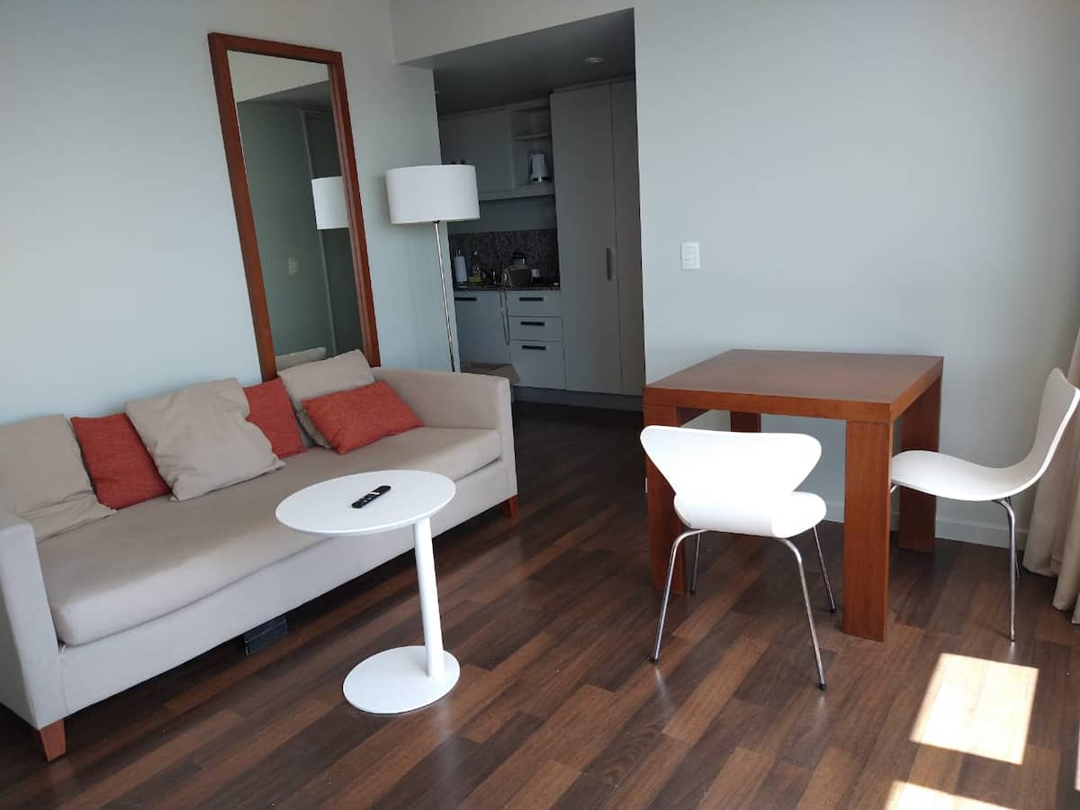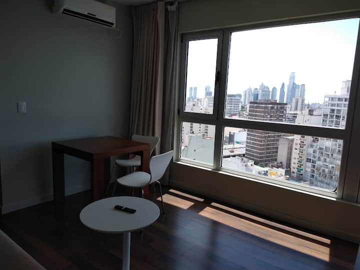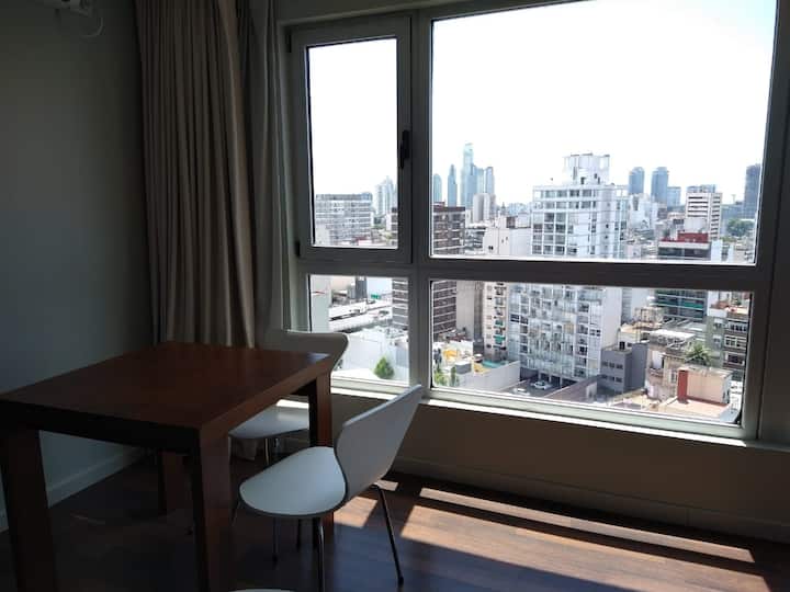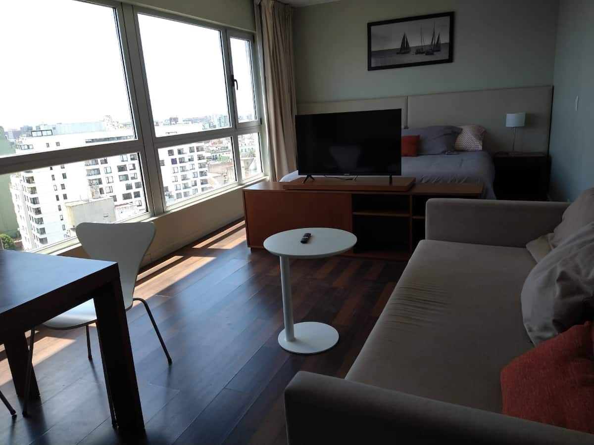 Studio apartment on the 15th floor in the Quartier San Telmo building, recently painted and fully equipped. Includes a king-size bed and a couch that can be used as a bed for one, plus a 43-inch Android smart TV and 300 Mbps WiFi. Air conditioning (cool/heat). Views from the apartment face the Puerto Madero buildings, and on clear days the river is visible. The building offers 2 pools, residents’ lounges, a gym, and 24-hour security, with 360-degree views from the 27th floor.