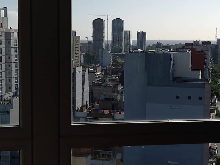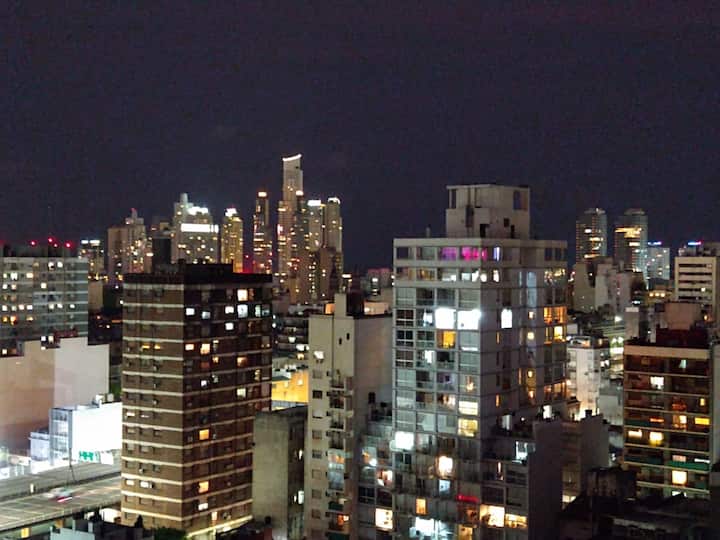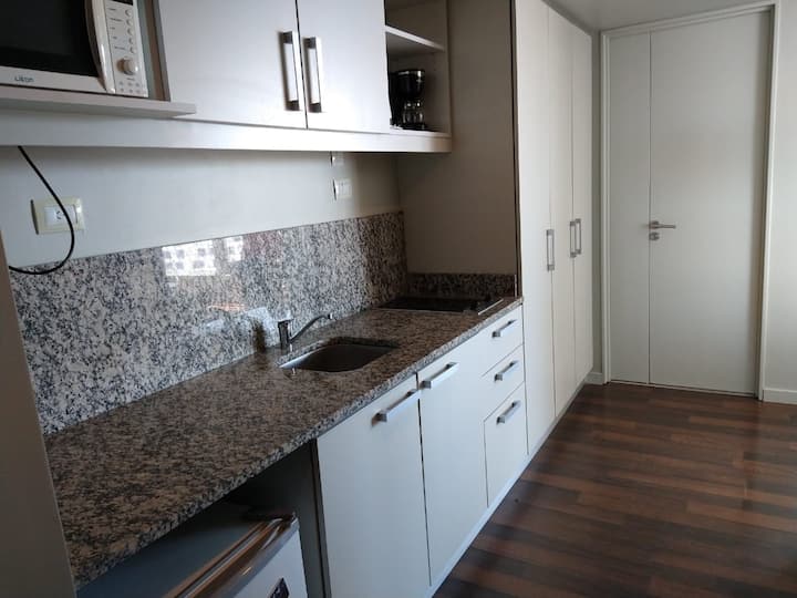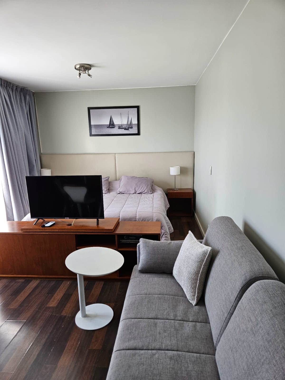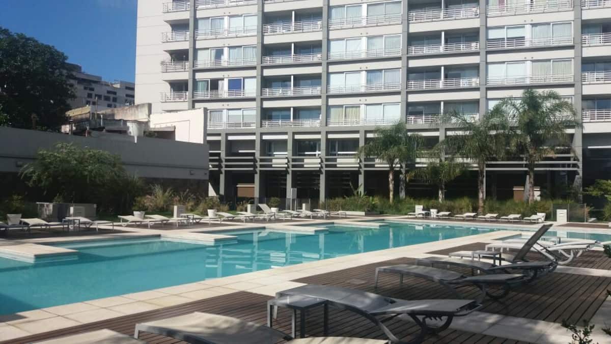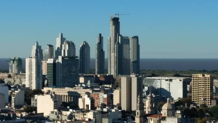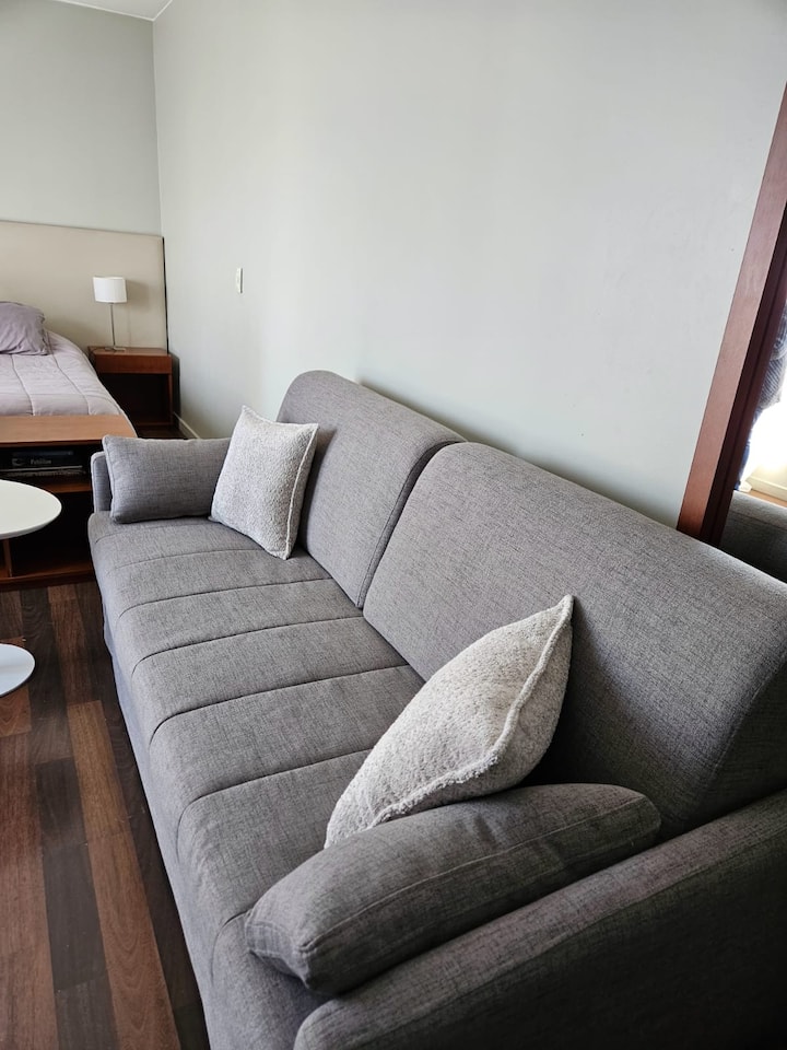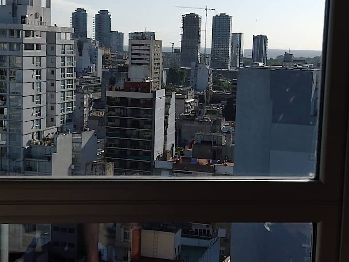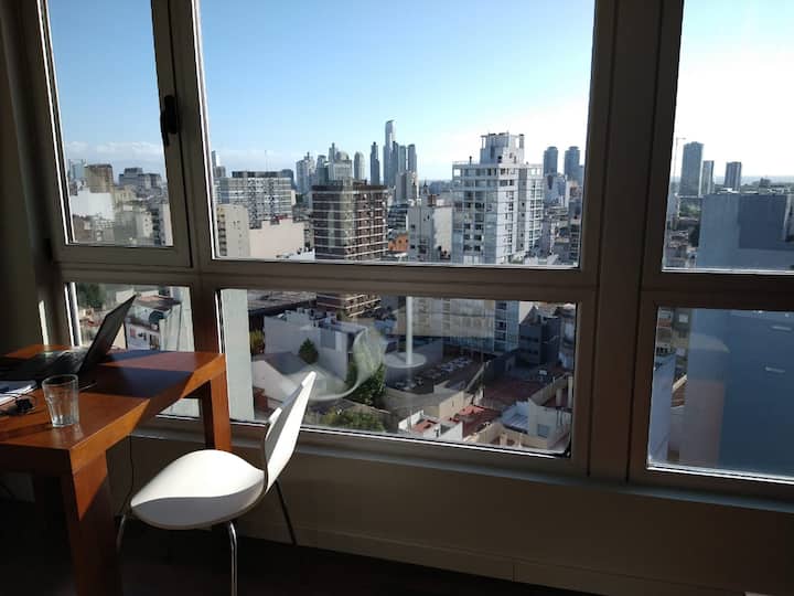 Studio apartment on the 15th floor in the Quartier San Telmo building, recently painted and fully equipped. Includes a king-size bed and a couch that can be used as a bed for one, plus a 43-inch Android smart TV and 300 Mbps WiFi. Air conditioning (cool/heat). Views from the apartment face the Puerto Madero buildings, and on clear days the river is visible. The building offers 2 pools, residents’ lounges, a gym, and 24-hour security, with 360-degree views from the 27th floor.
