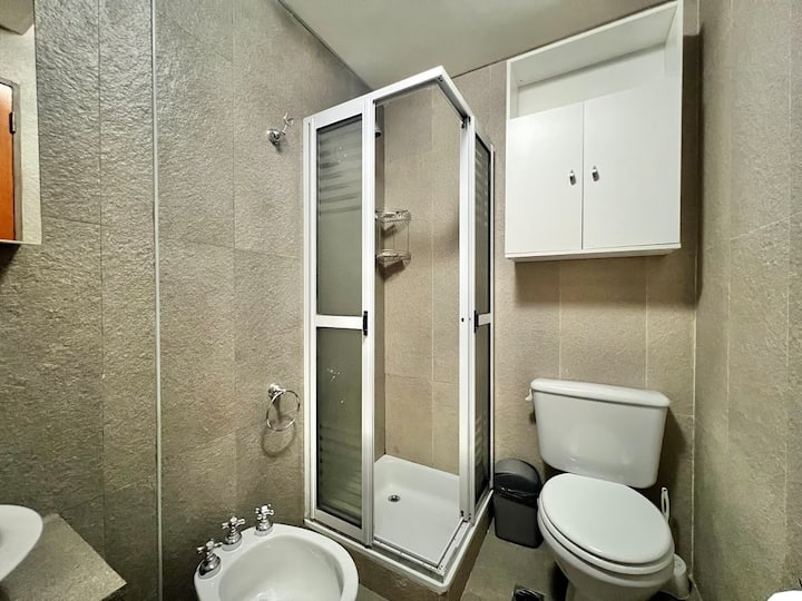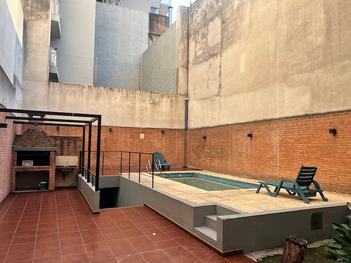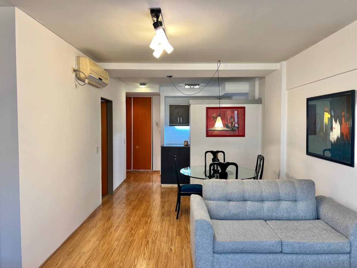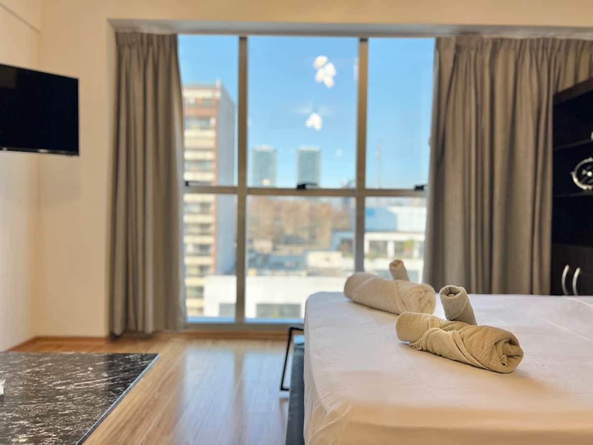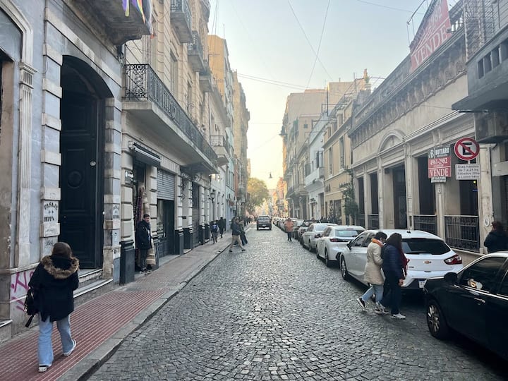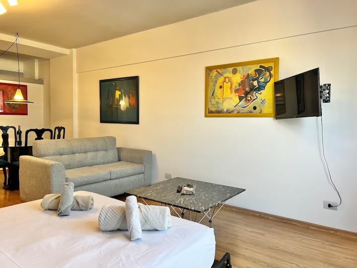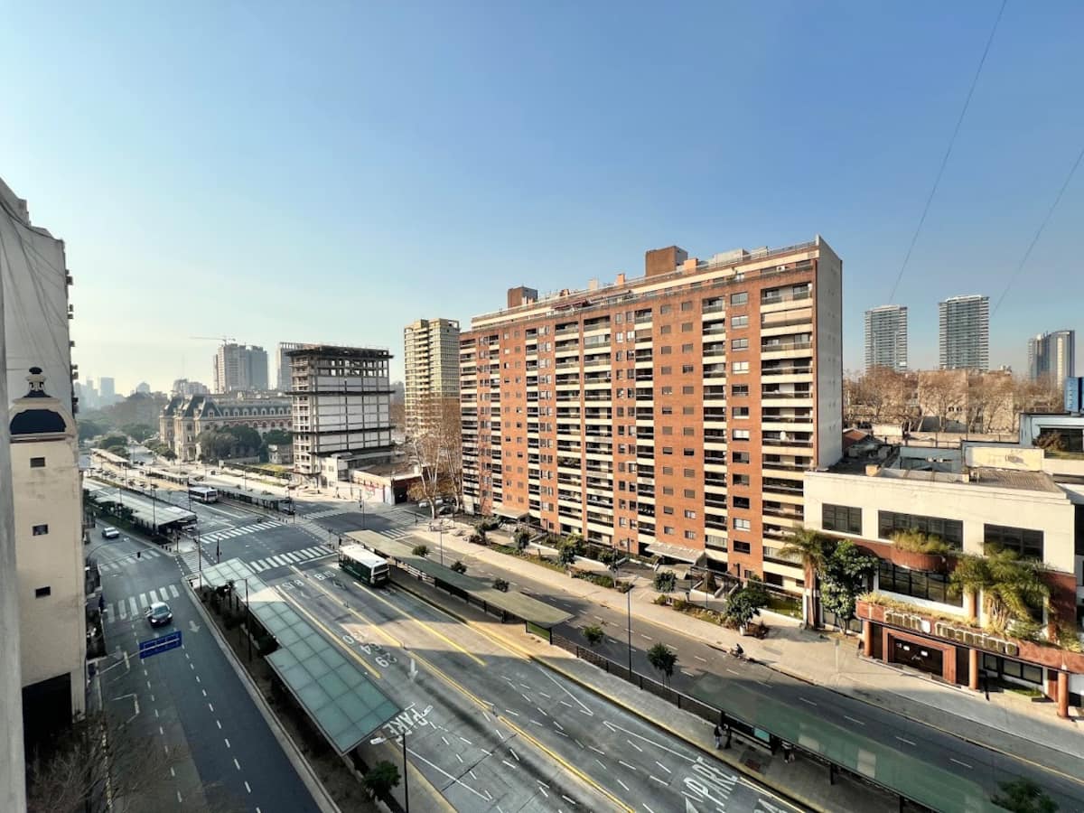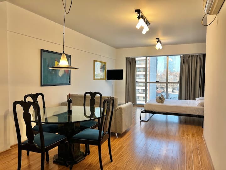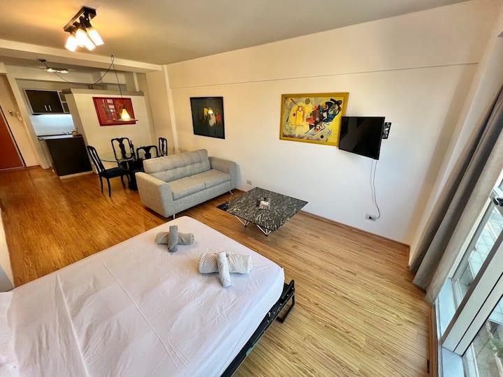 Furnished studio apartment with a wide view over Av. Paseo Colón, in central San Telmo. Equipped with a double bed, split hot/cold air conditioning, smart TV and an all-electric kitchen (cooktop, oven, toaster and electric kettle), with utensils and tableware. The building has a sun terrace, a ground-floor pool with a grill area, laundry with a washer and dryer, and monitored security.